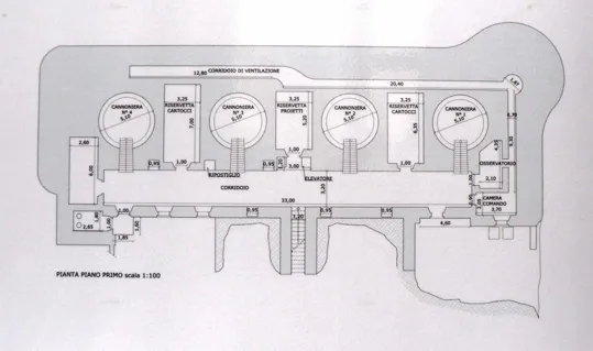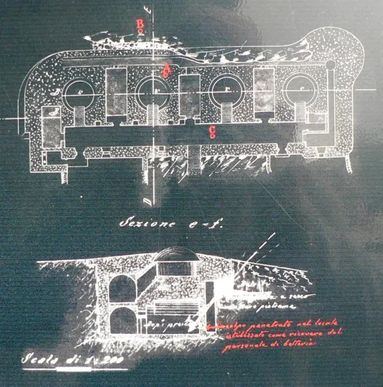 uno indicato con la lettera "A" che colpì l'avancorazza della cupola n.3 causando la rottura di uno spicchio e sgretolando il corrispondente tratto di parapetto; un altro indicato colla lettera "B", che penetrò nel parapetto, attraversò il muro del locale sottostante alla cupola n.3 predetta e scoppiò nel locale stesso con conseguenze disastrose del personale che vi era ricoverato; un terzo, con la lettera "C", che colpì la volta del corridoio retrostante alle cupole producendo un imbuto lungo m. 3,80 circa, largo m. 1,30 a m. 1,60. [...] il 26 corrente l'opera Verena subì nuovi danni i quali ebbero per principale effetto la rottura di una cupola quella n. 2 con conseguente messa fuori servizio del pezzo - la rottura del cielo del corridoio con penetrazione del proietto obliquamente nel sottostante locale del piano terreno ed altri danni minori."