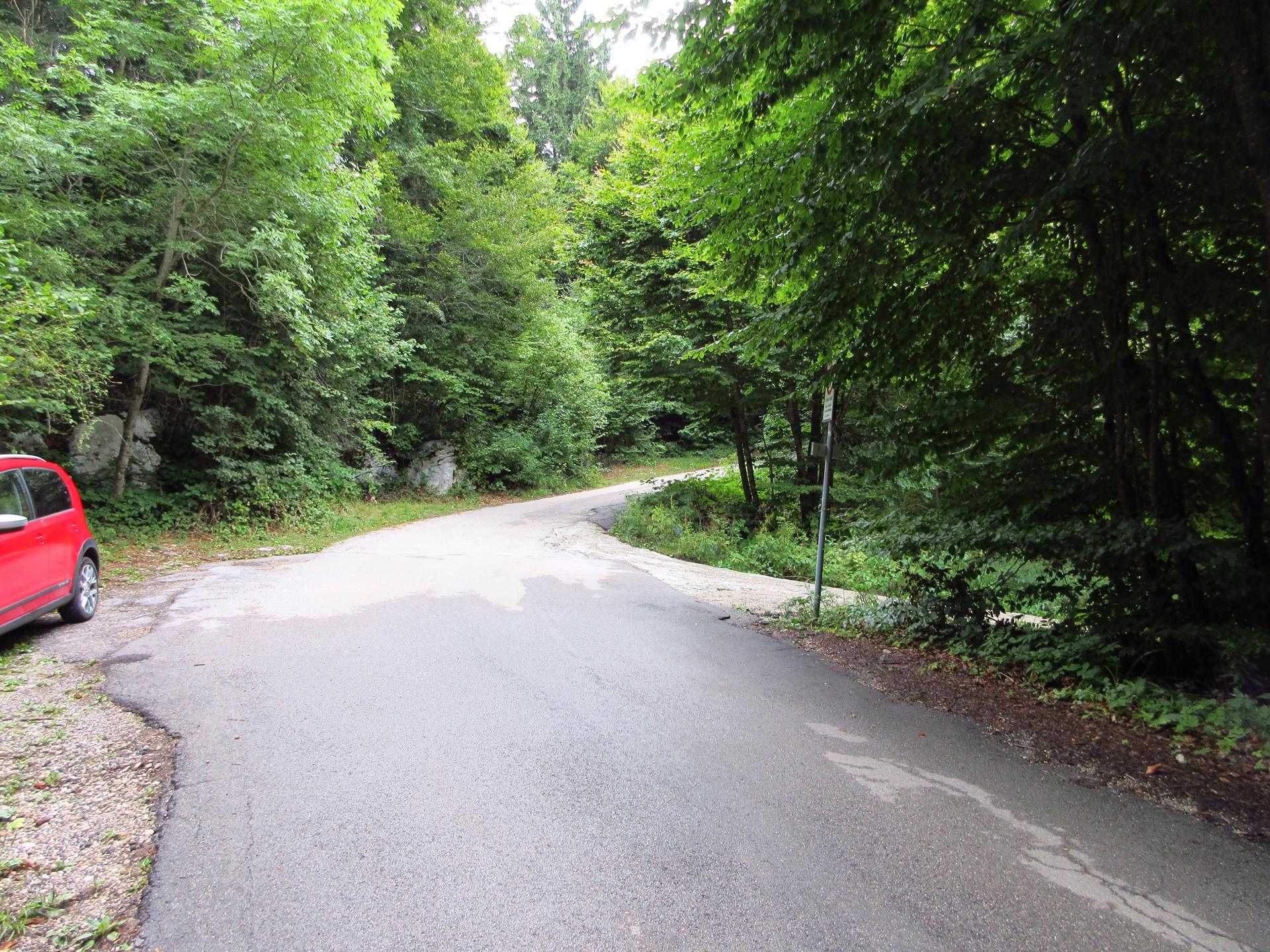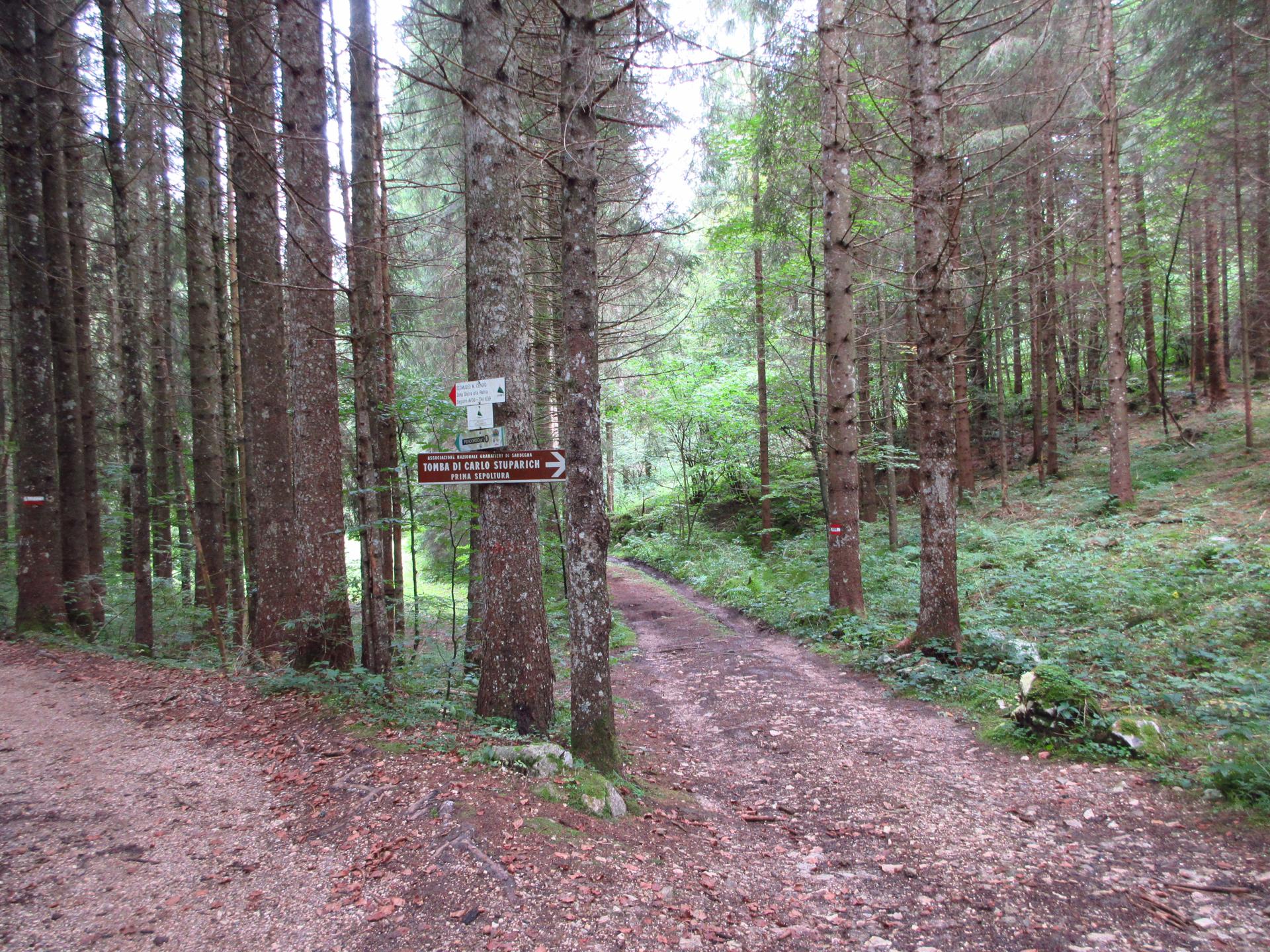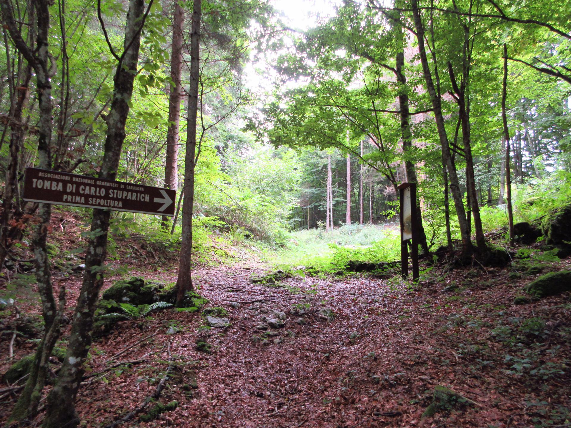 Dopo alcuni tornanti la strada si fa quasi pianeggiante e si immette in un’altra via, dove si trovano le indicazioni per la tomba di Carlo Stuparich.