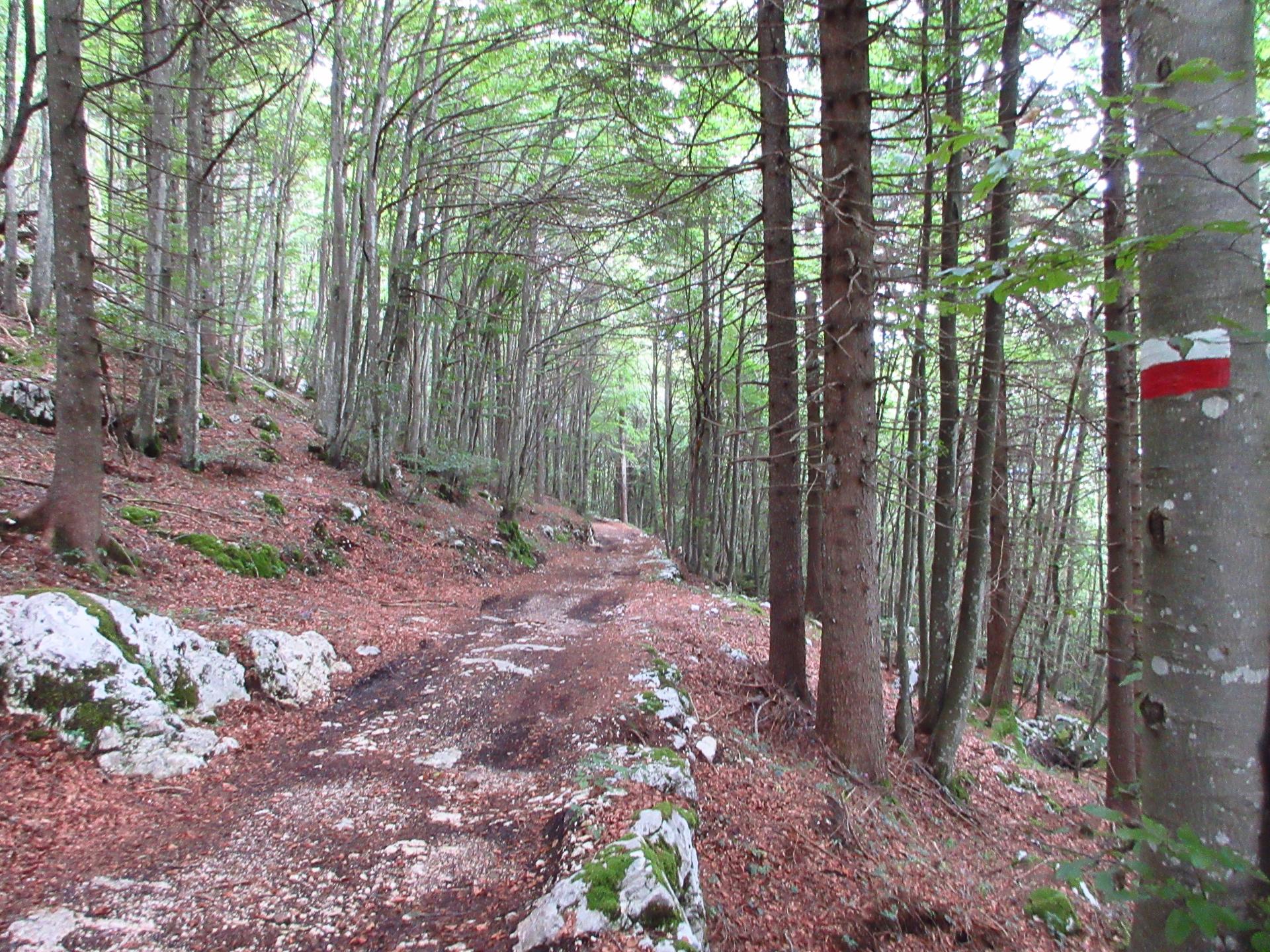 Tra lievi saliscendi la strada continua verso sud, immersa nel bosco. Lungo il percorso si incontrano diverse trincee e postazioni risalenti alla Grande Guerra.