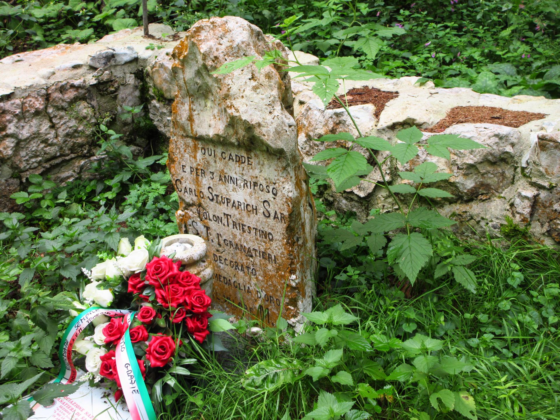 In breve si raggiunge la prima sepoltura di Carlo Stuparich. La tabella storica presente nei pressi della tomba è riportata nella sezione Storia di questa pagina.