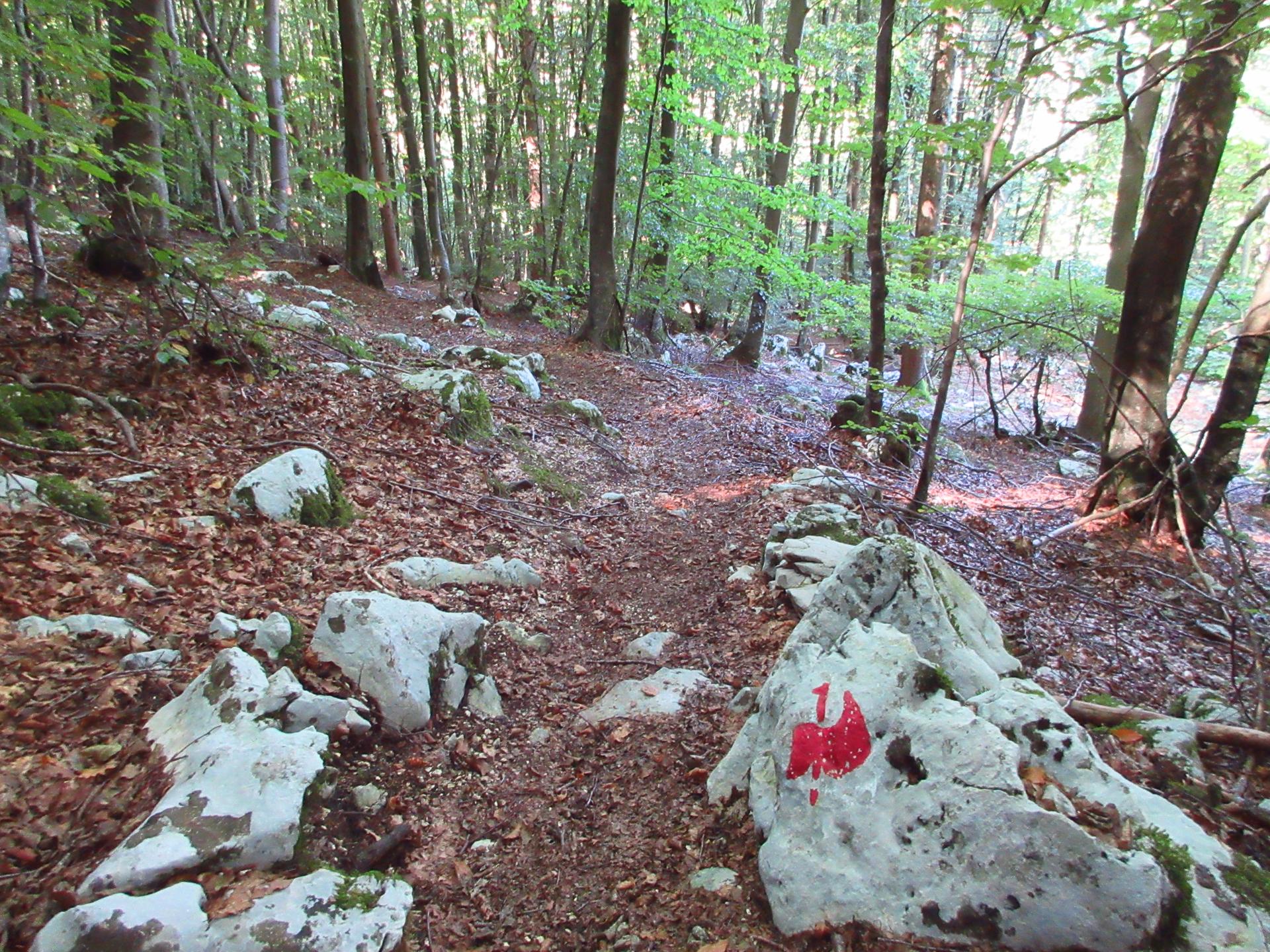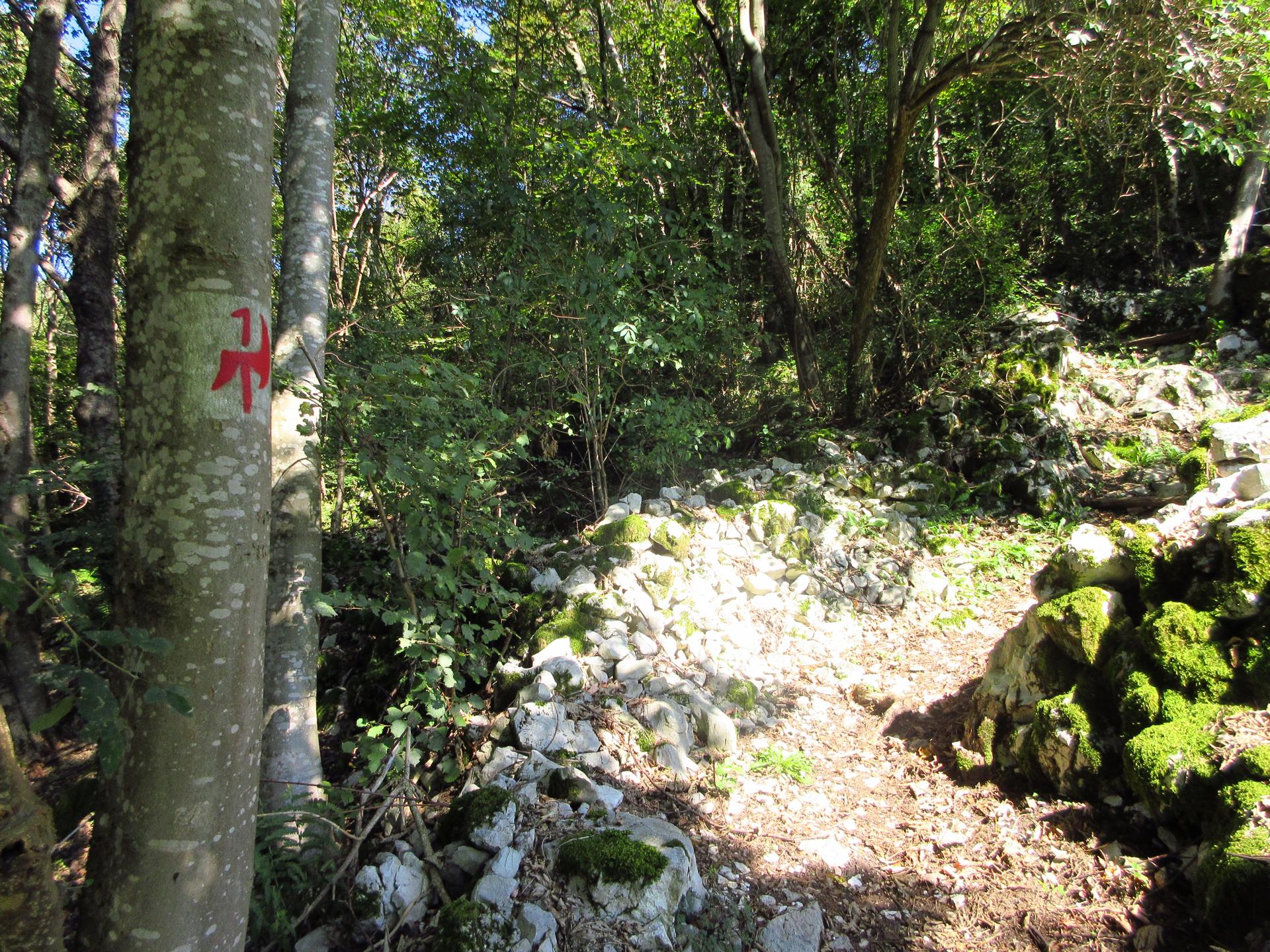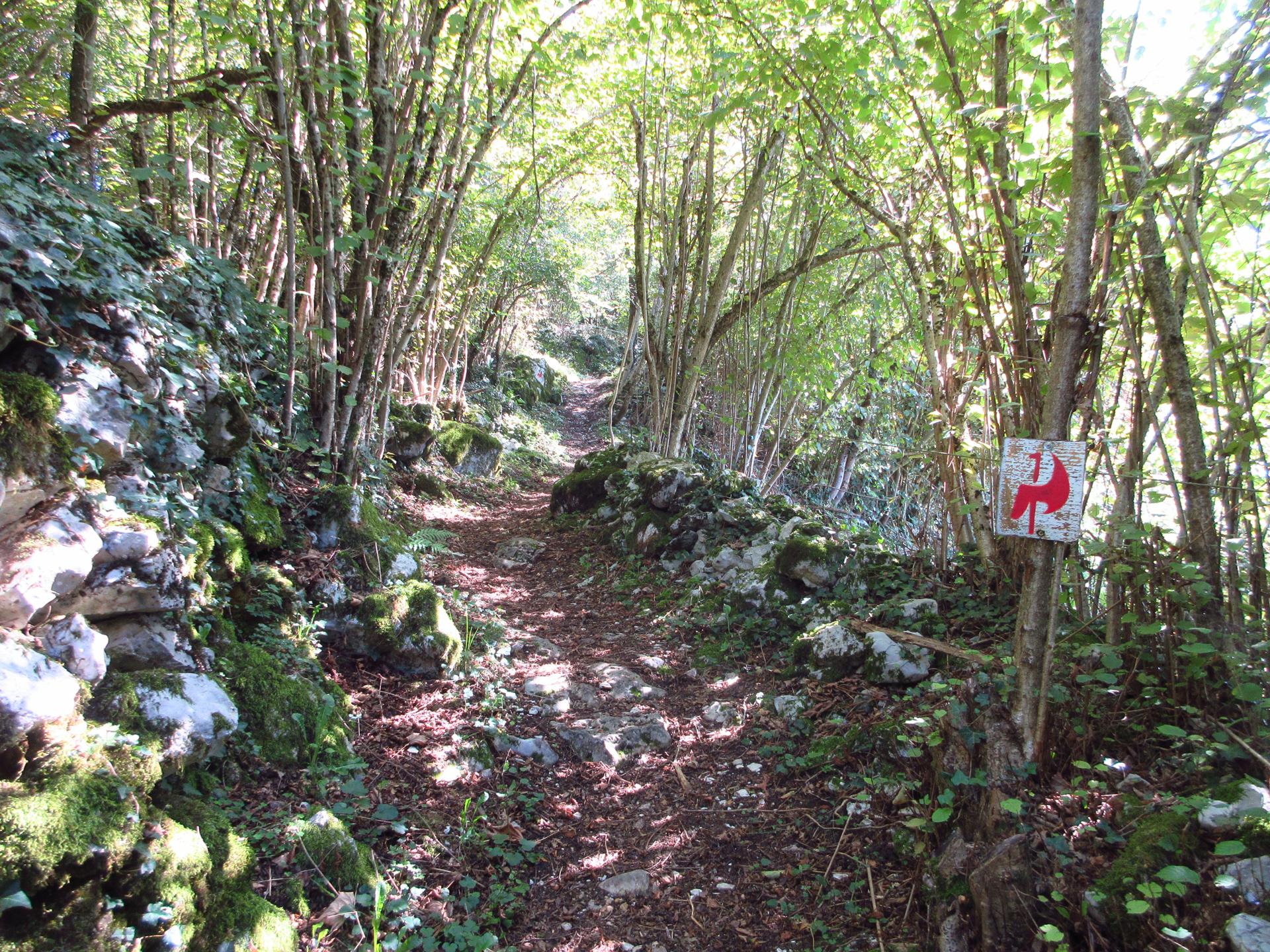 Dopo un brevissimo tratto inizia un suggestivo sentiero nel bosco. Oltre alle tabelle segnaletiche, lungo il percorso si notano anche dei segni rossi a forma di picca, tracciati su sassi o tronchi, che aiutano a seguire l’itinerario.