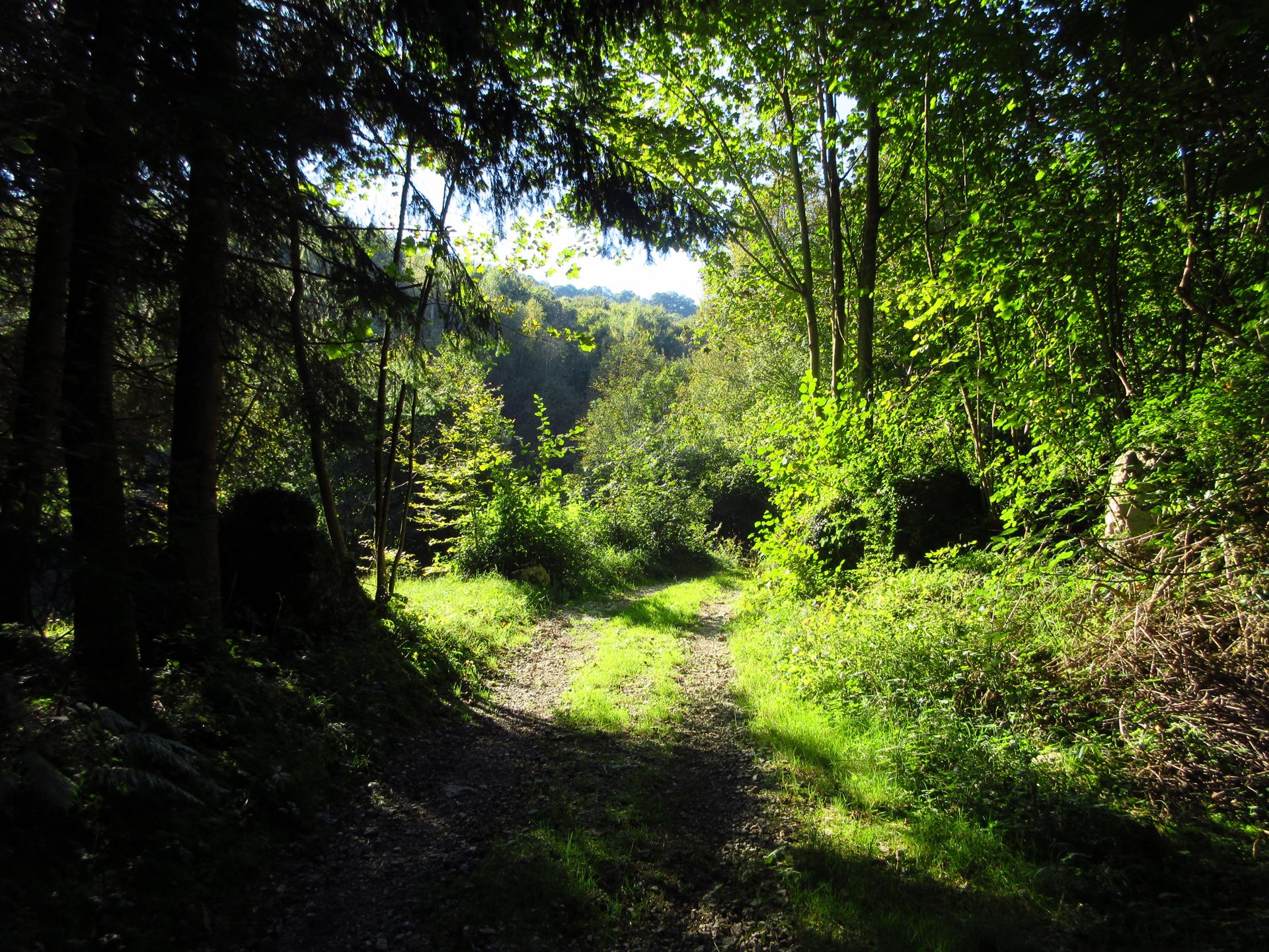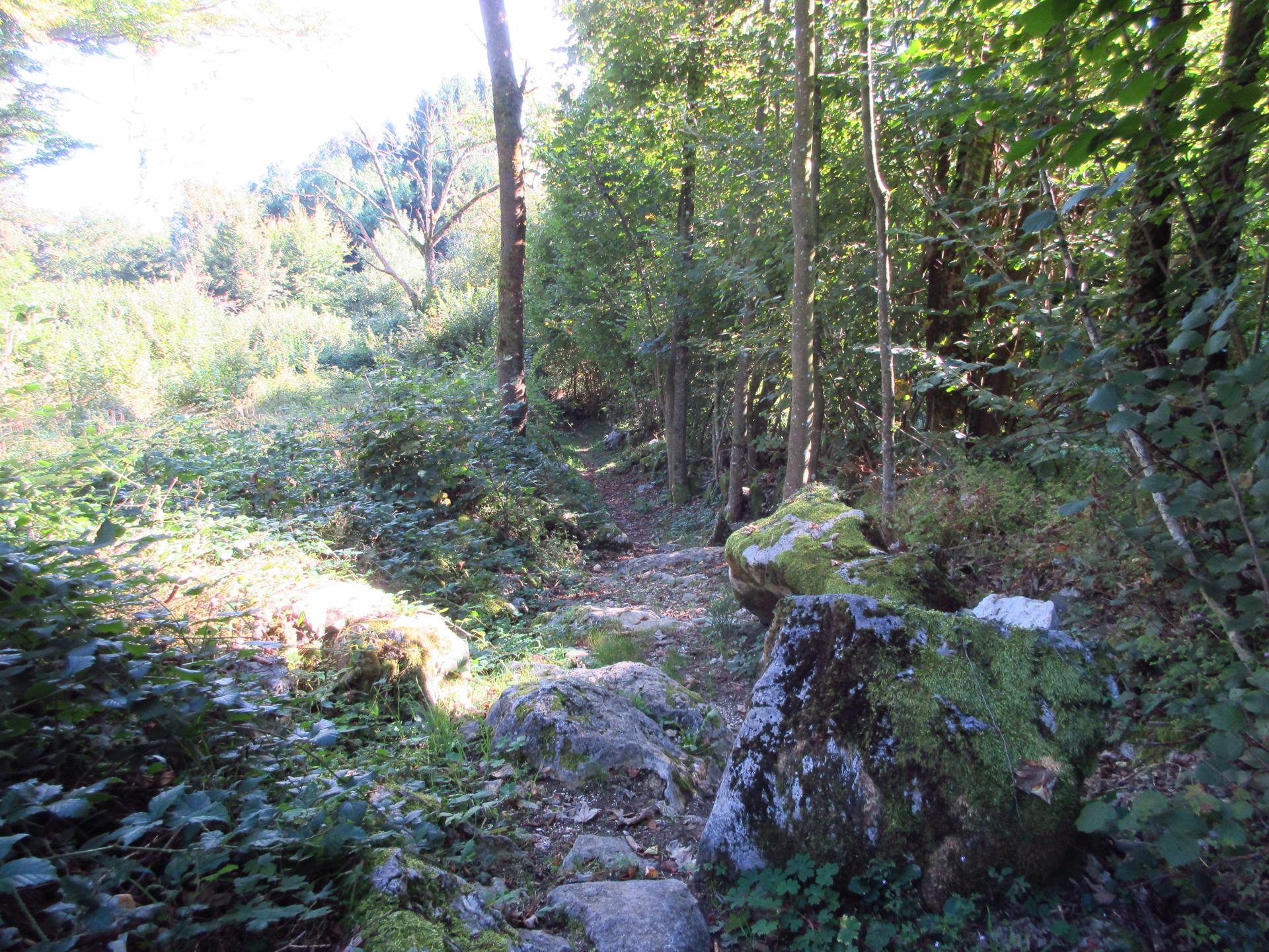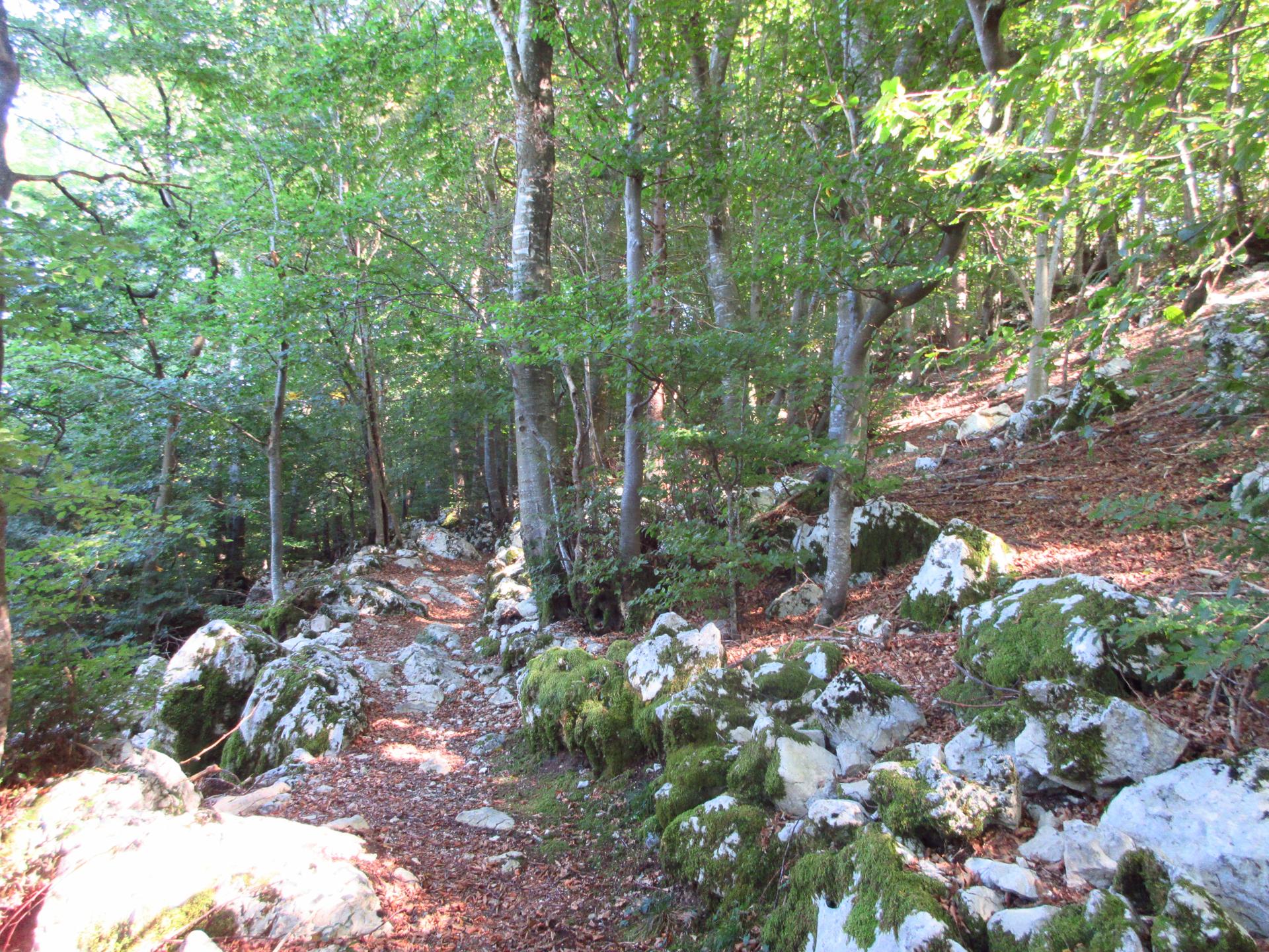 Dopo un brevissimo tratto inizia un suggestivo sentiero nel bosco. Oltre alle tabelle segnaletiche, lungo il percorso si notano anche dei segni rossi a forma di picca, tracciati su sassi o tronchi, che aiutano a seguire l’itinerario.