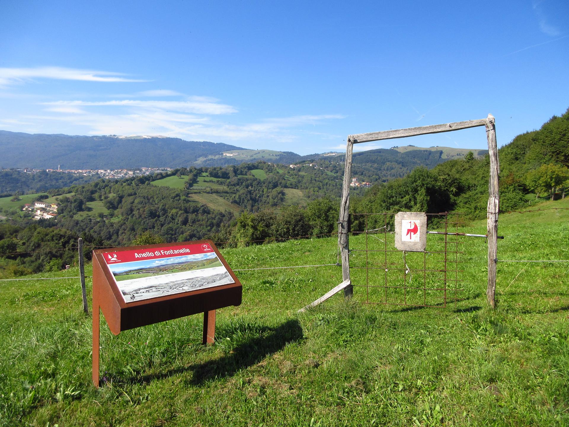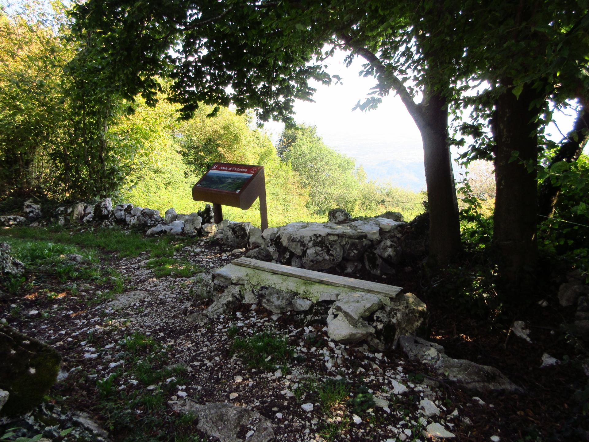 Si raggiunge il punto più alto del percorso, dove un’altra tabella illustra il panorama che si apre di fronte, aiutando a riconoscere le località visibili all’orizzonte.