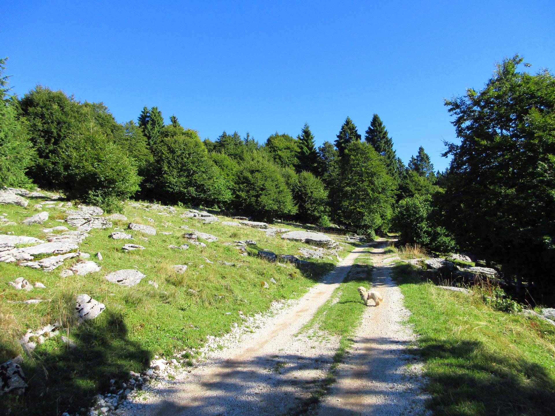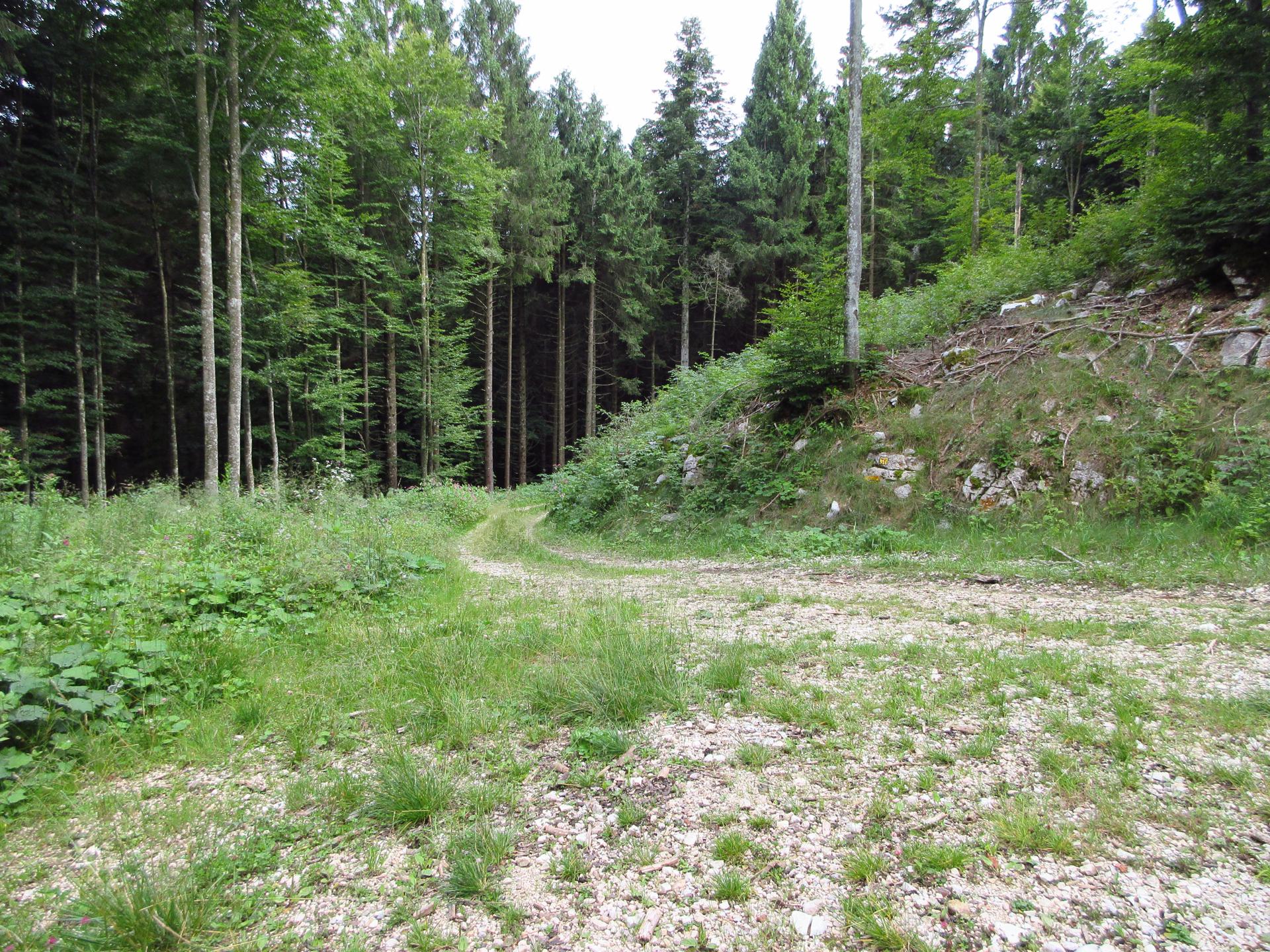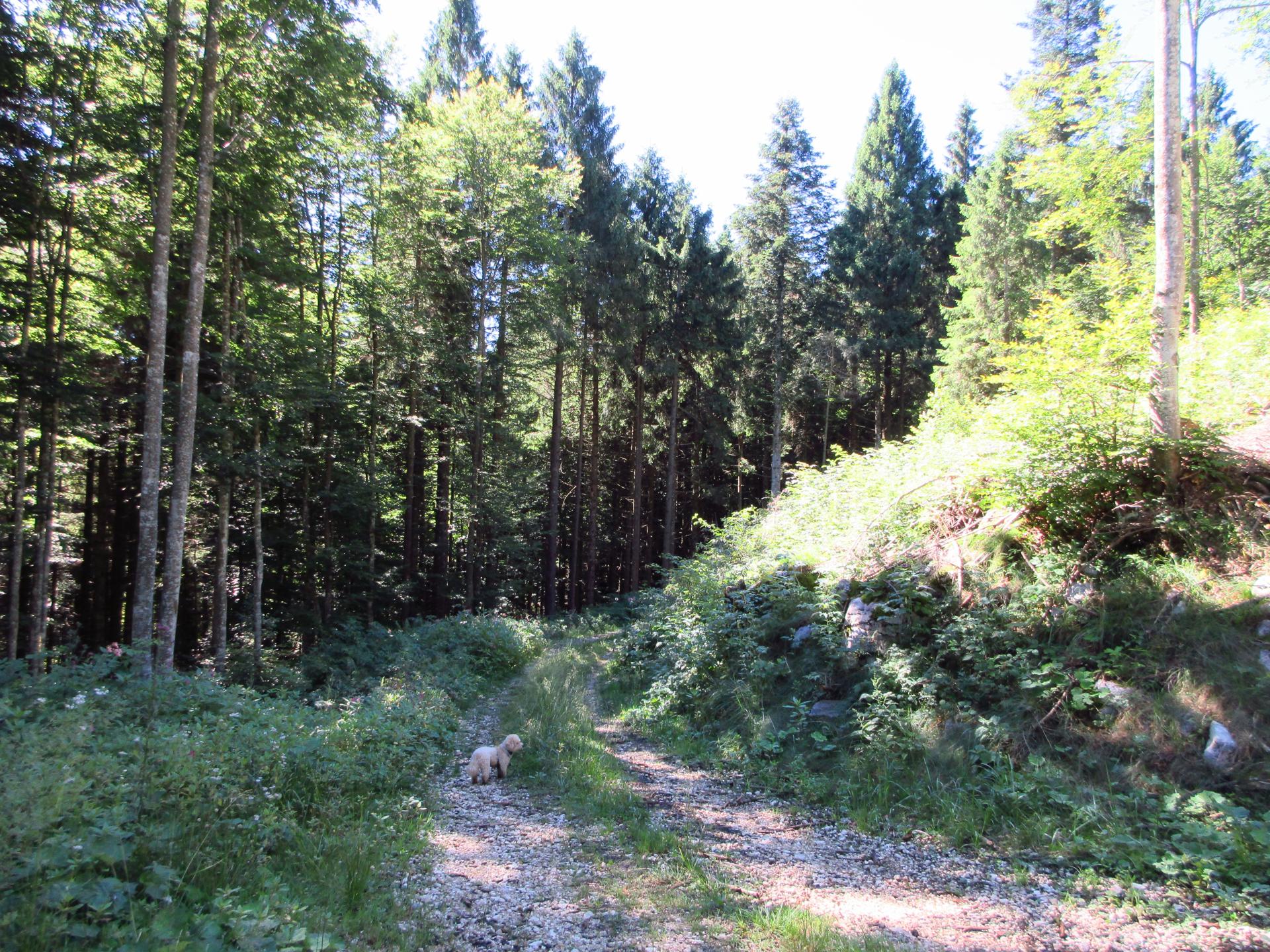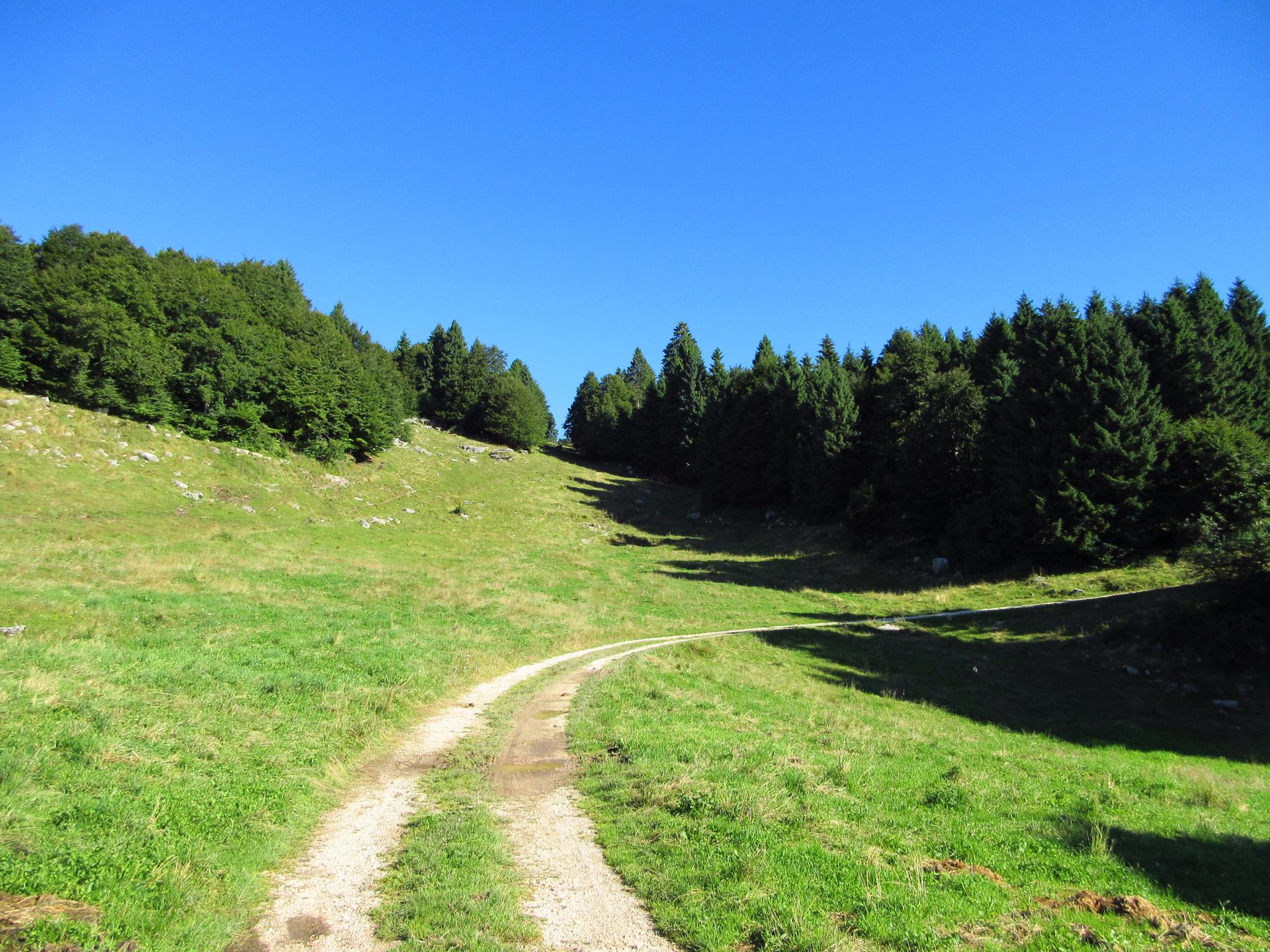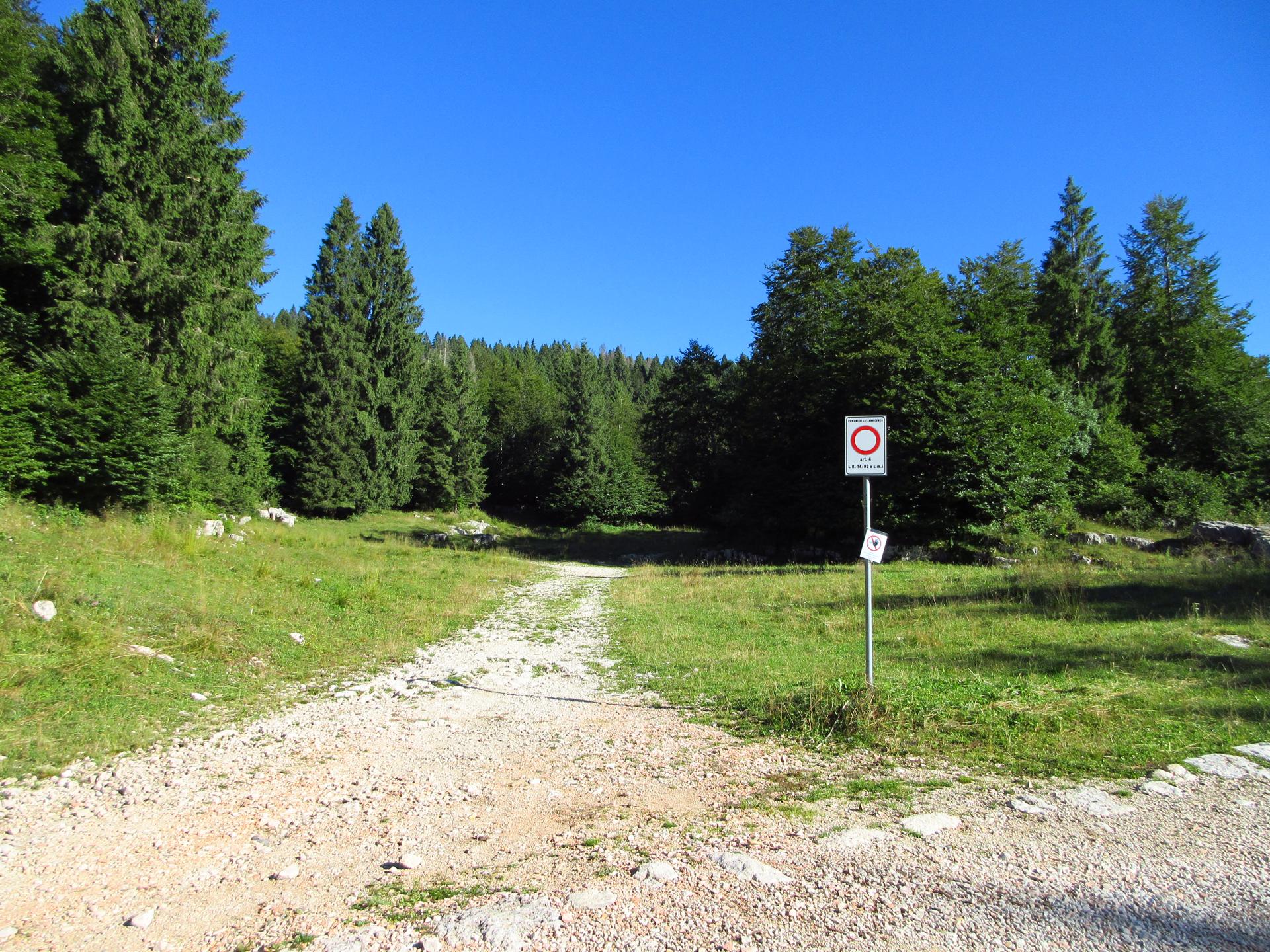 Al primo incrocio proseguiamo ancora dritto, la strada diventa più terrosa e verso la fine del bosco è chiusa con un reticolato che delimita la zona di una malga.