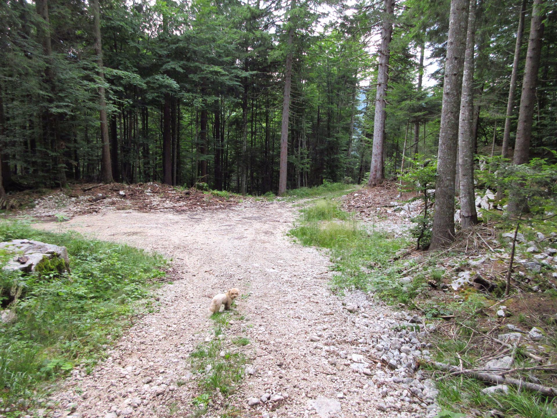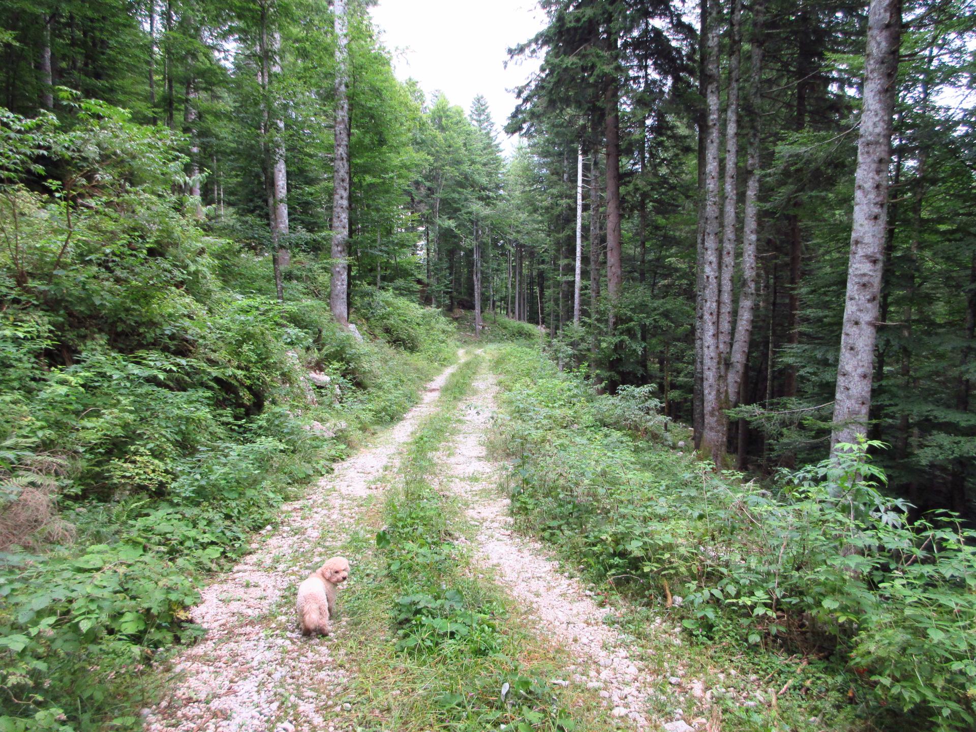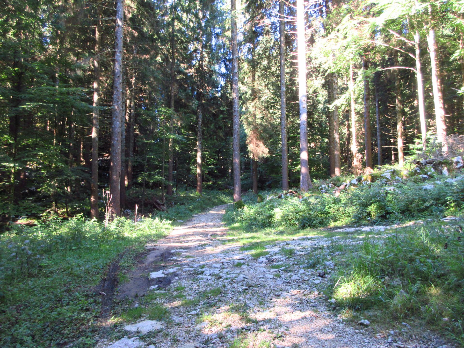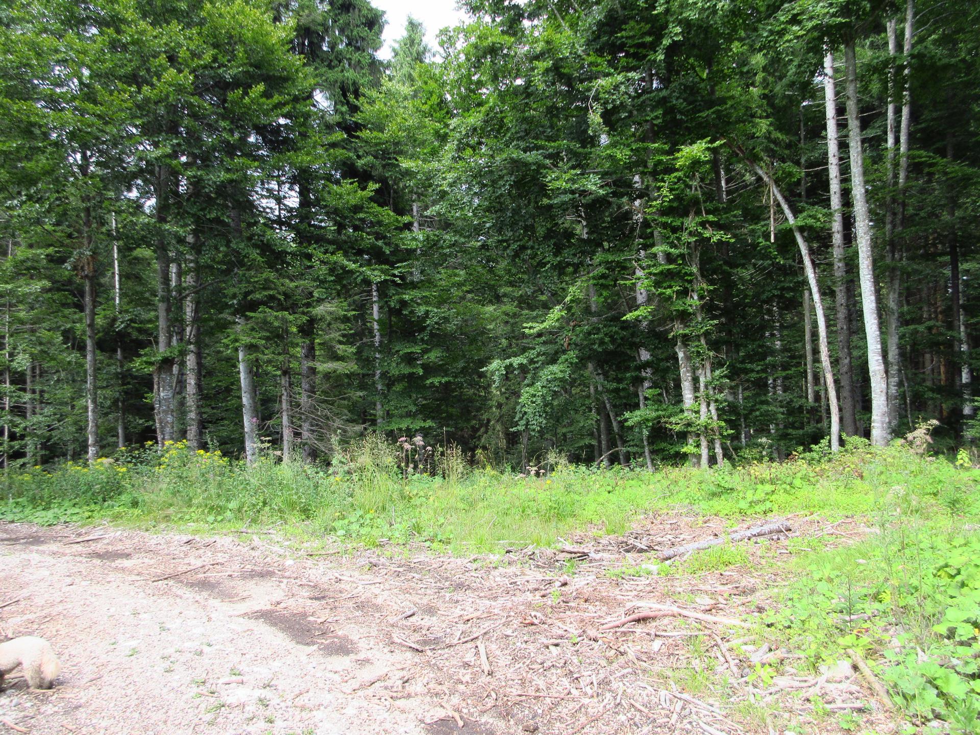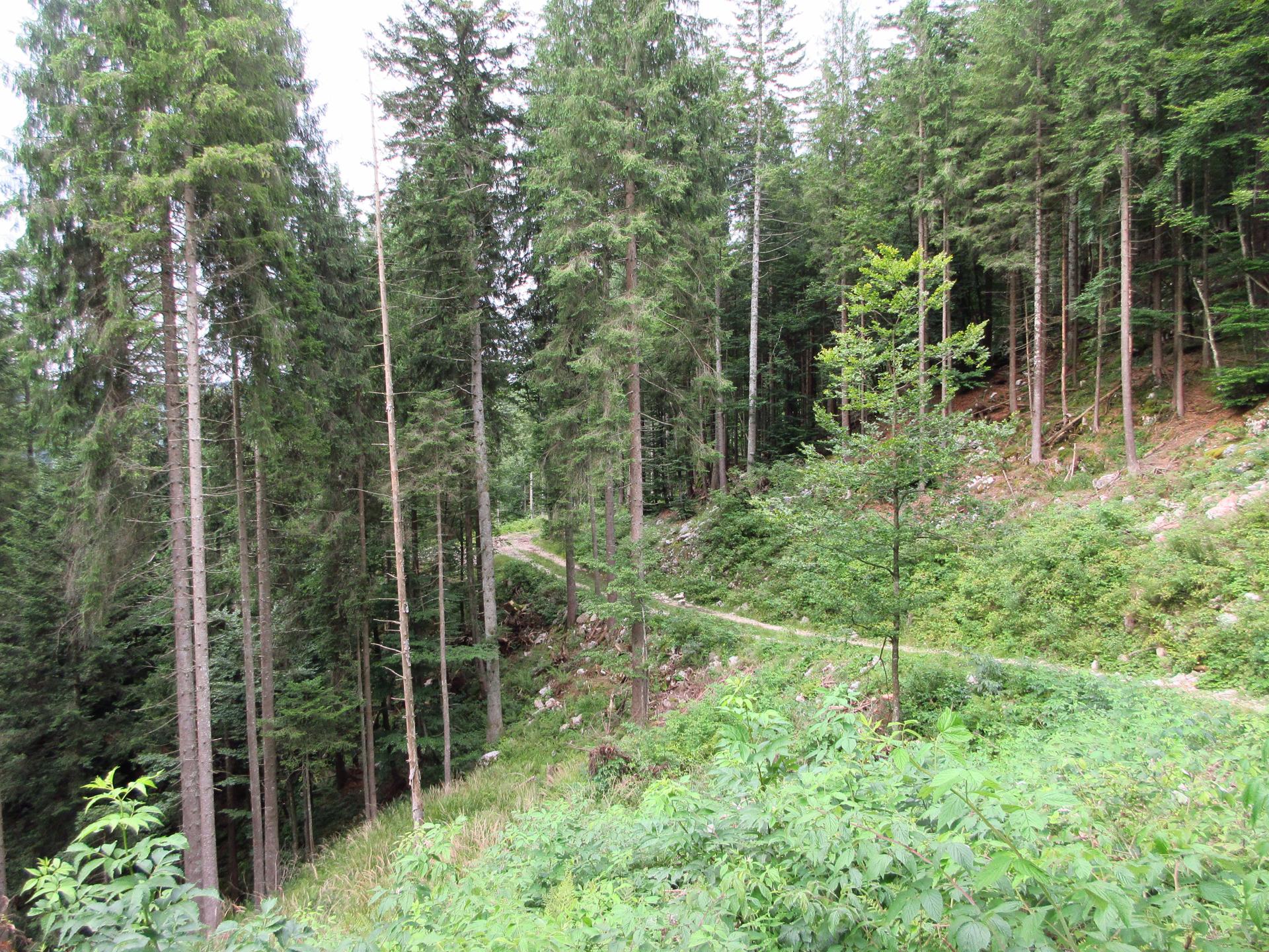 Al primo incrocio proseguiamo ancora dritto, la strada diventa più terrosa e verso la fine del bosco è chiusa con un reticolato che delimita la zona di una malga.