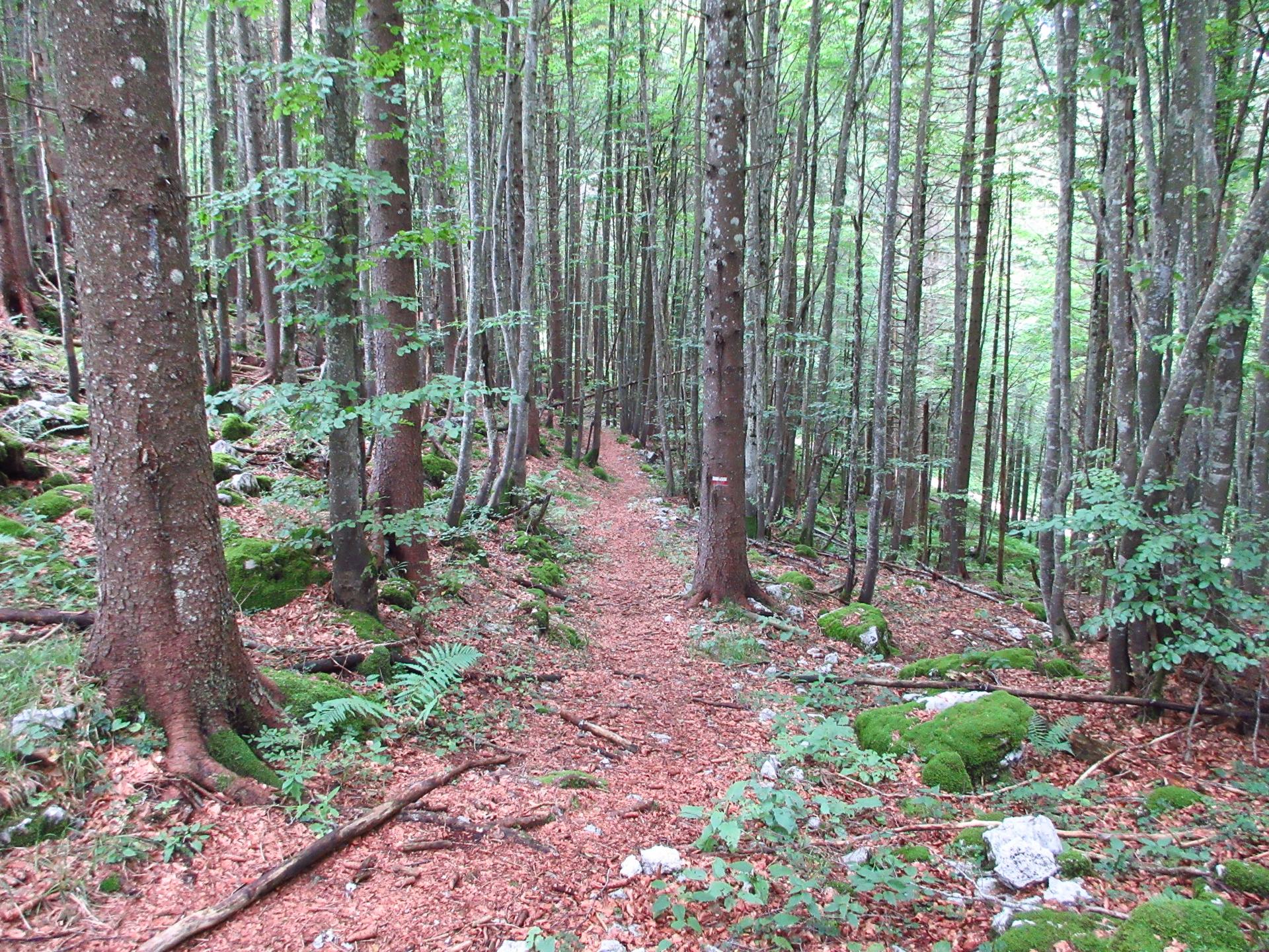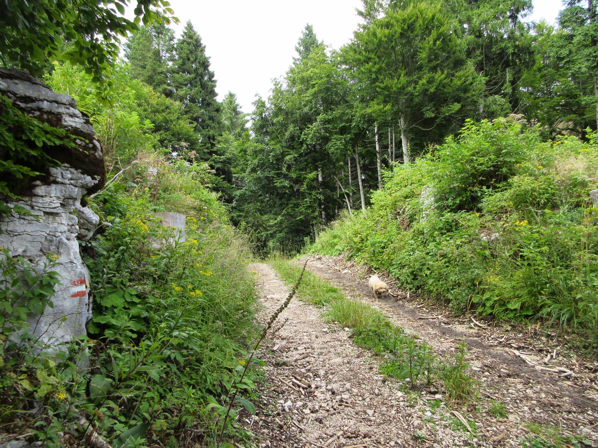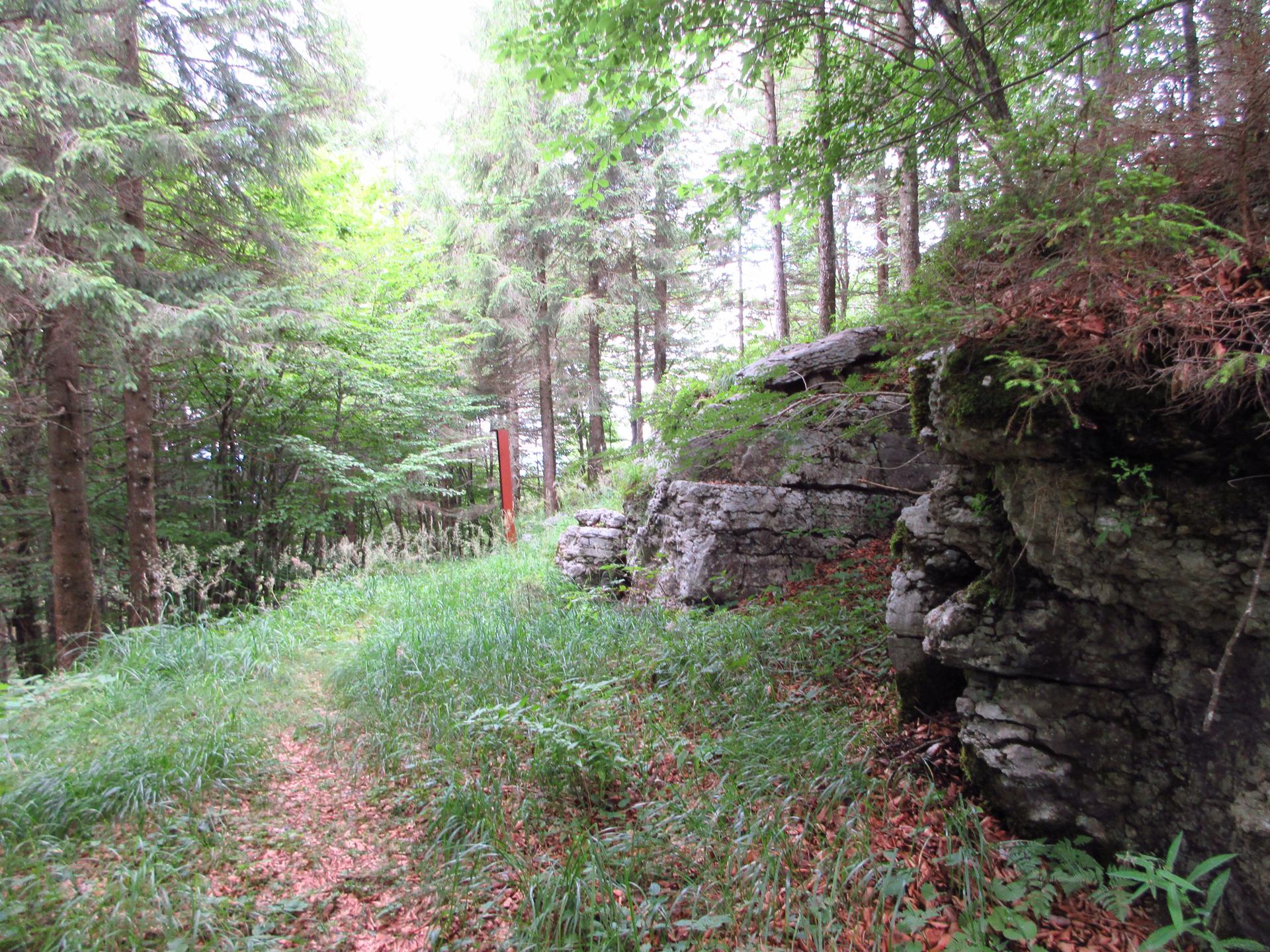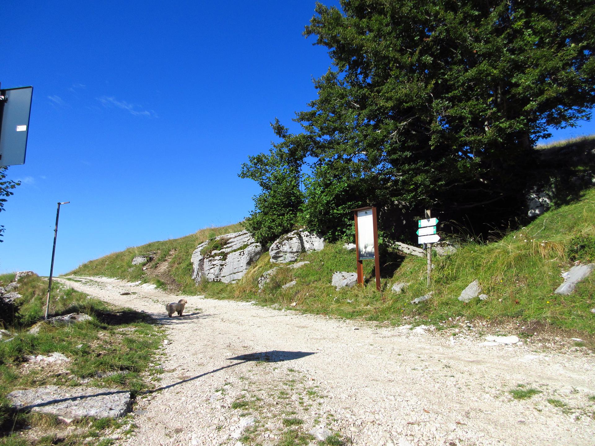 Superata la sella il percorso esce dalla strada principale sulla destra. Non è molto segnalato, su un albero si vede il classico segnavia bianco-rosso. Se, sbagliando, proseguite dritti, vi troverete ad un quadrivio dopo un centinaio di metri e quindi tornate indietro.