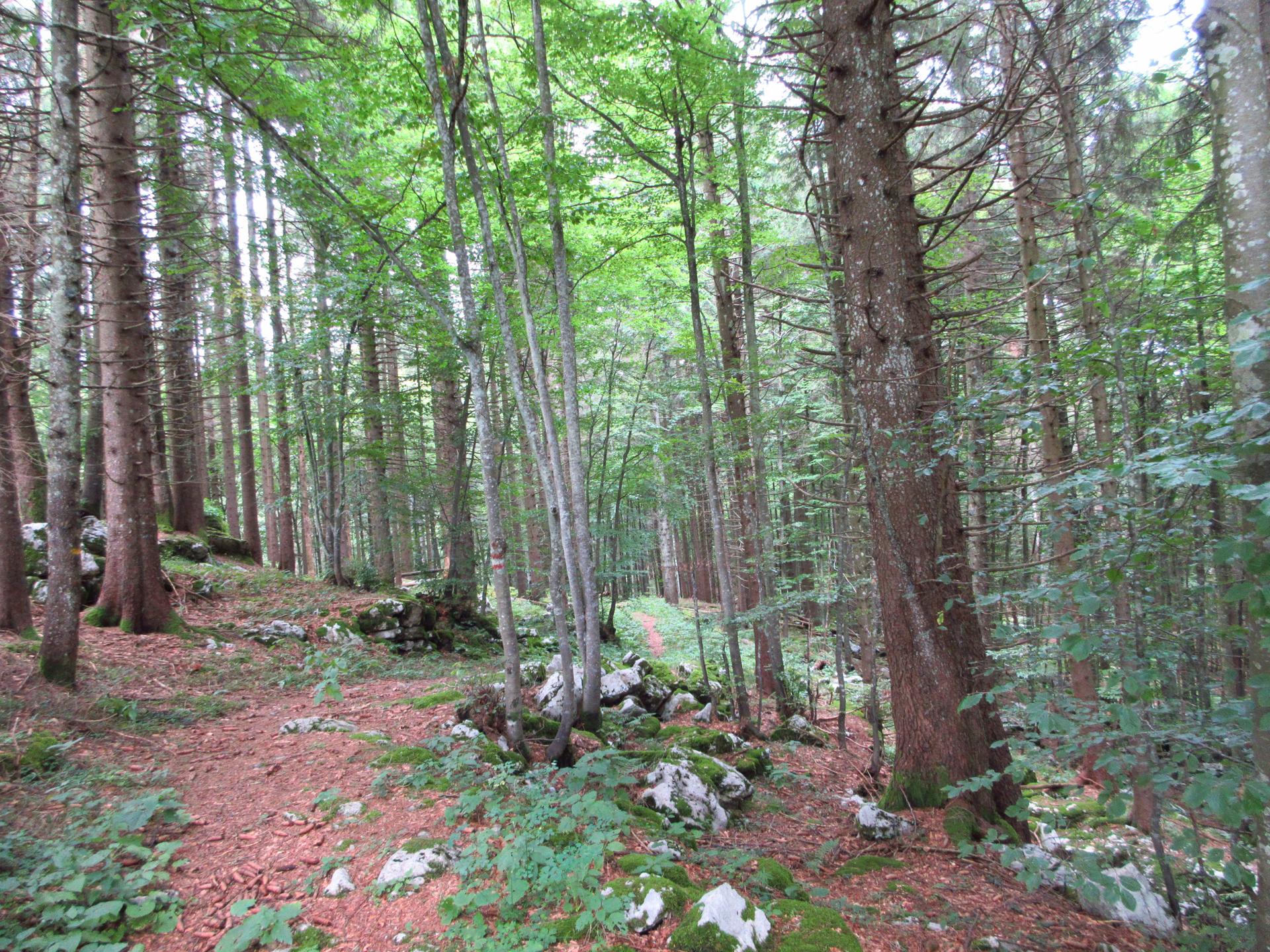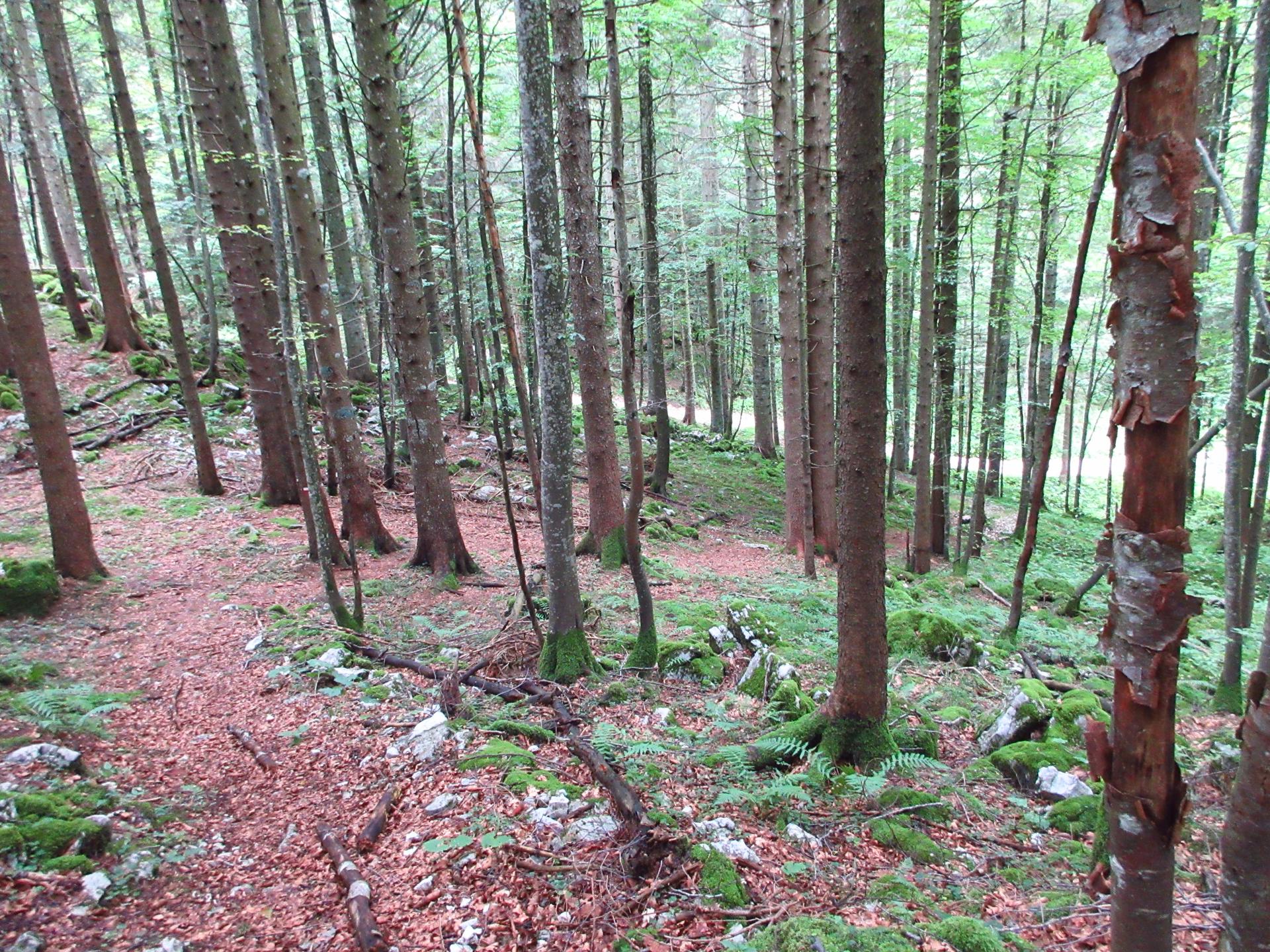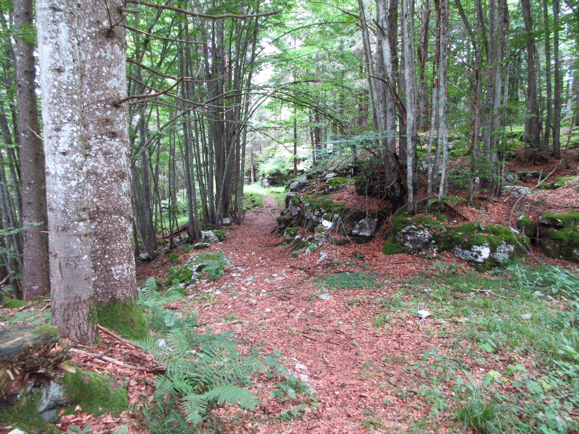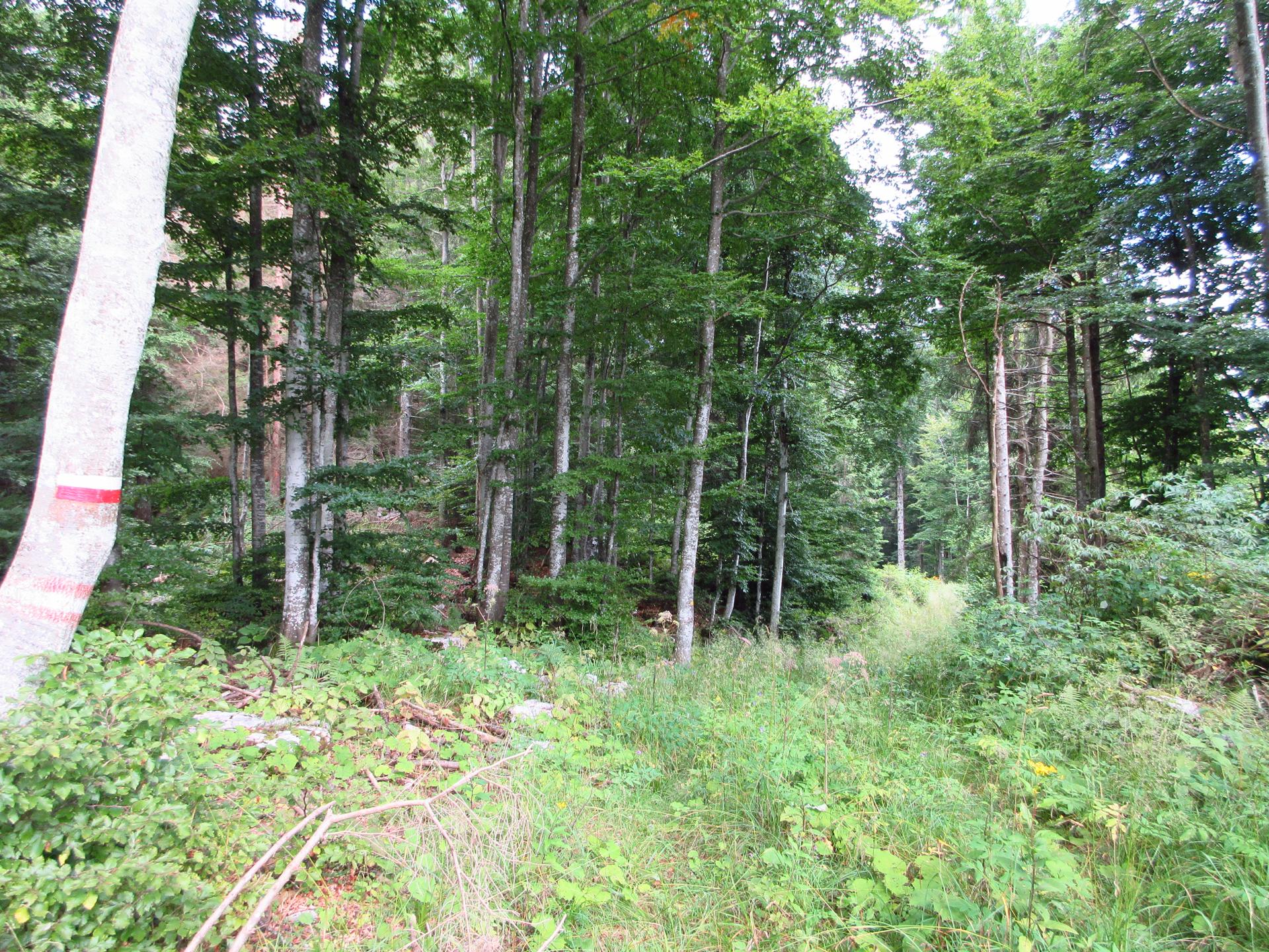 Superato facilmente il reticolato, il bosco si apre per entrare su sentiero erboso.