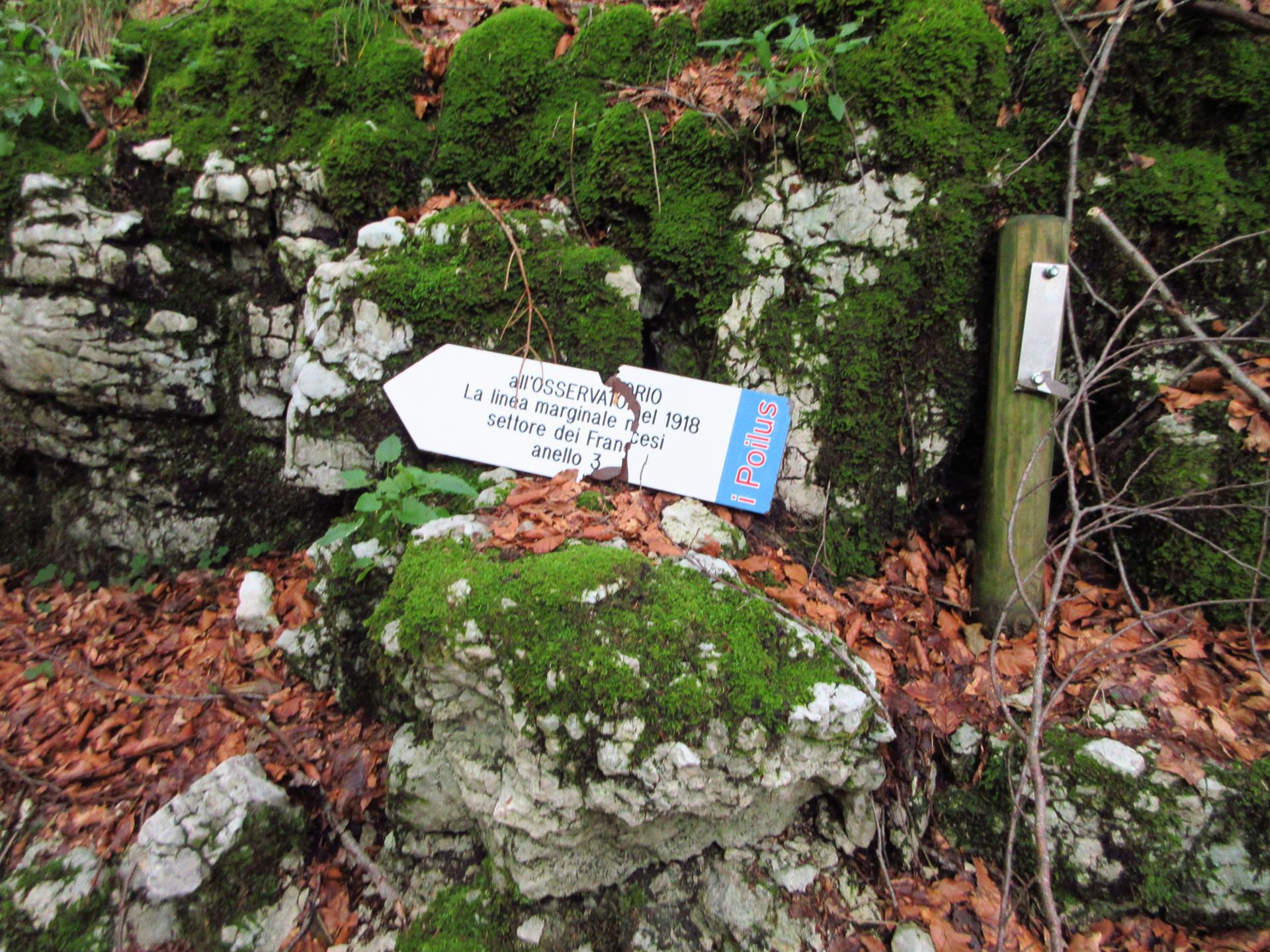 Poi si rientra nel bosco e, quando il sentiero svolta repentinamente a sinistra, si trova una tabella rotta e ricostruita, appoggiata ad una roccia che indica "all'osservatorio del 1918".