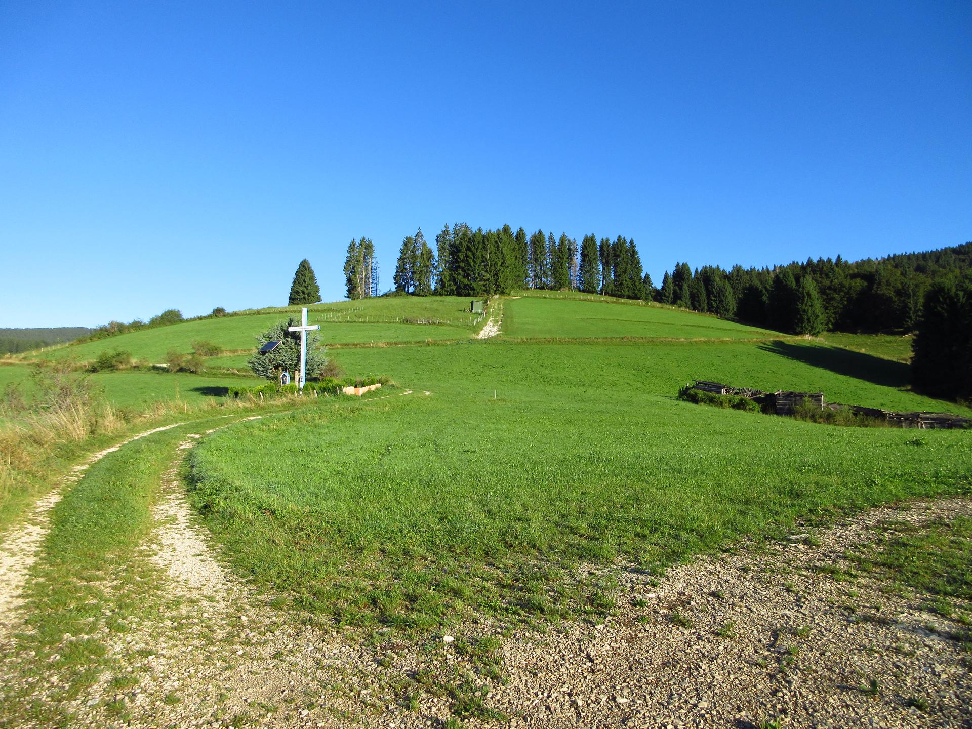 Dettaglio della strada verso la croce e gli abeti