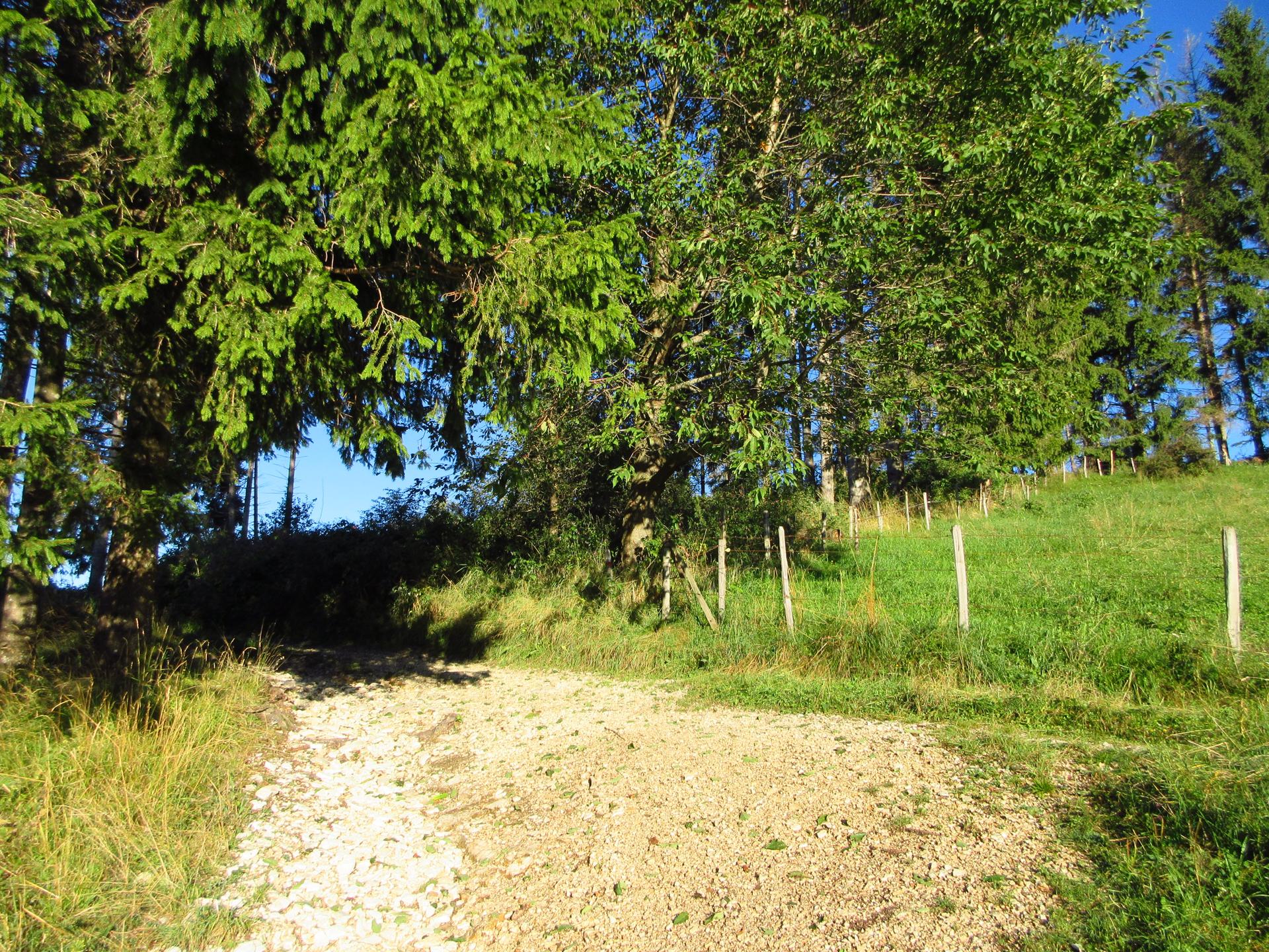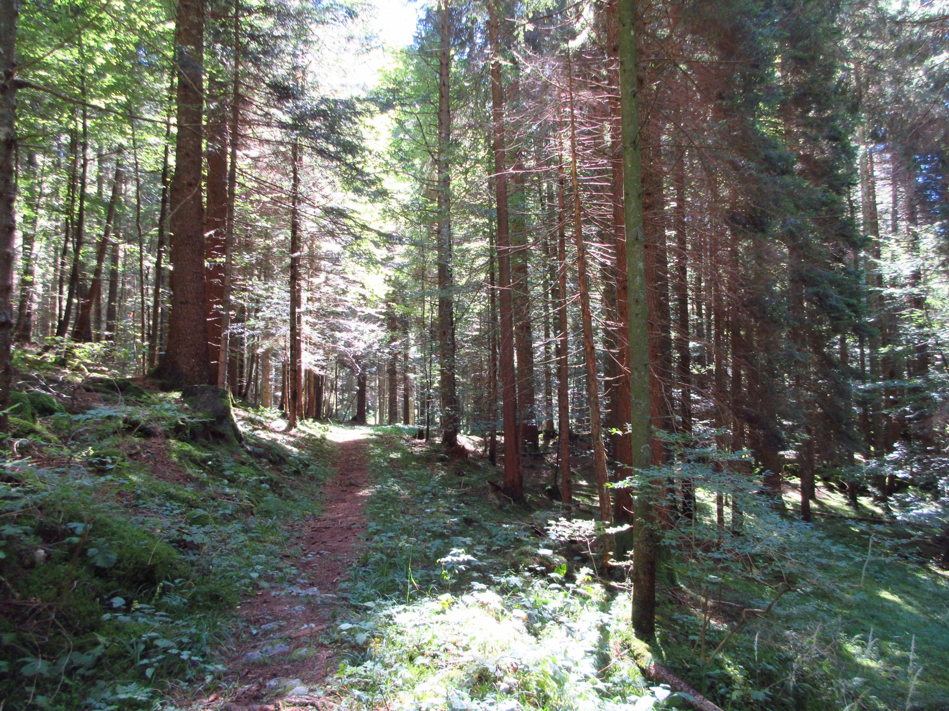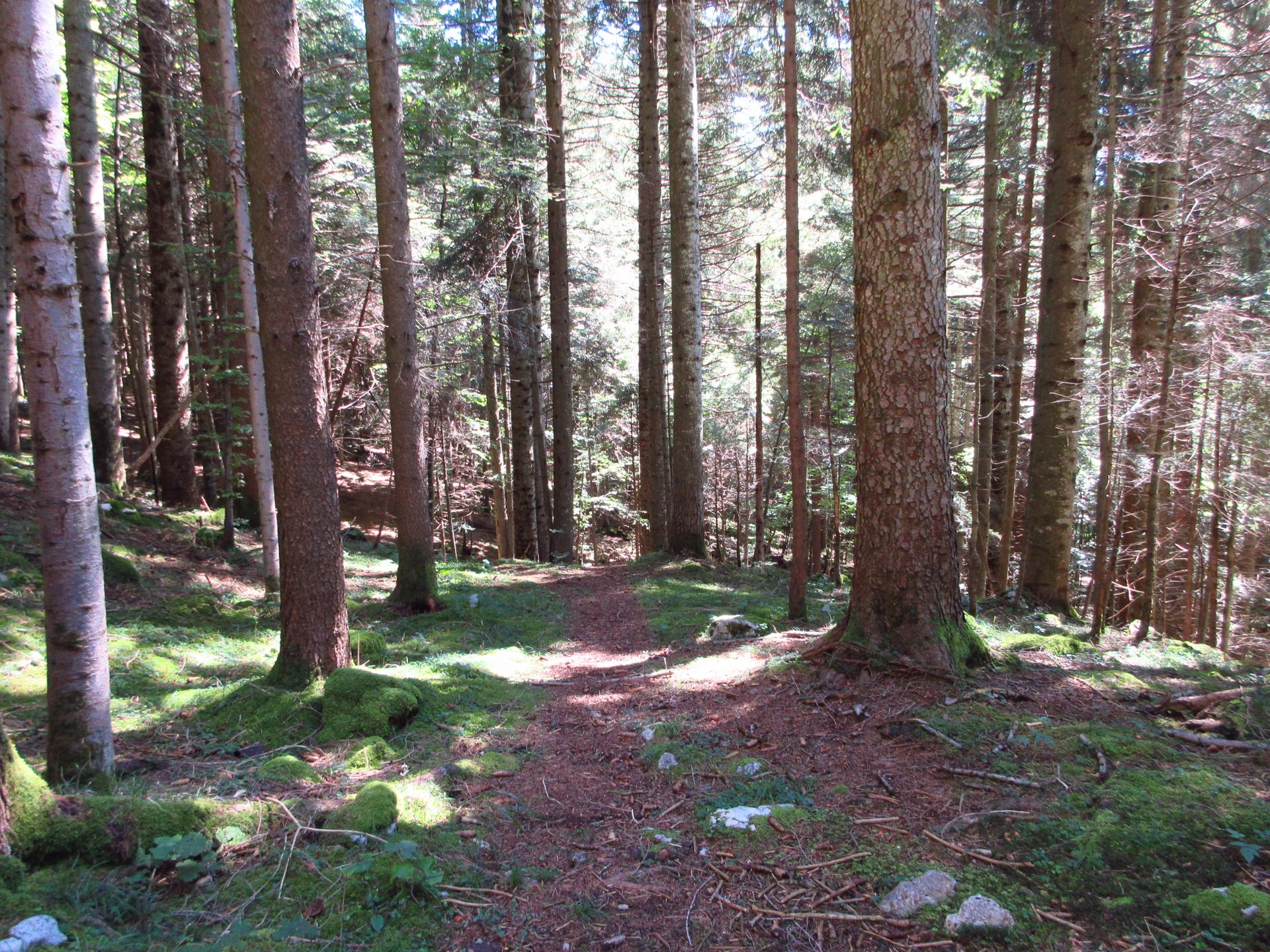 La strada prosegue in leggera salita, la pendenza aumenta gradualmente fino a raggiungere i primi abeti, dove torna nuovamente a ridursi.
