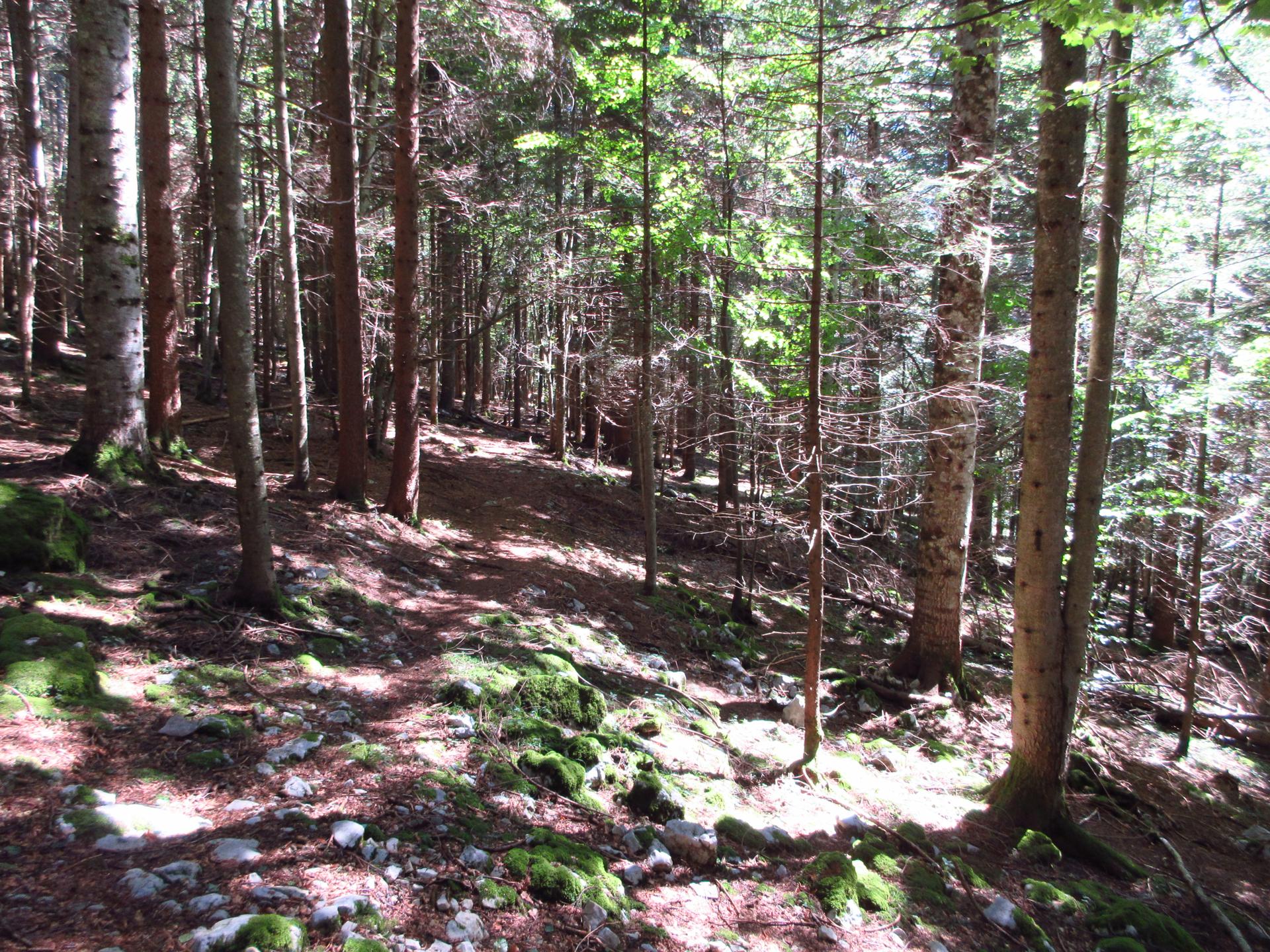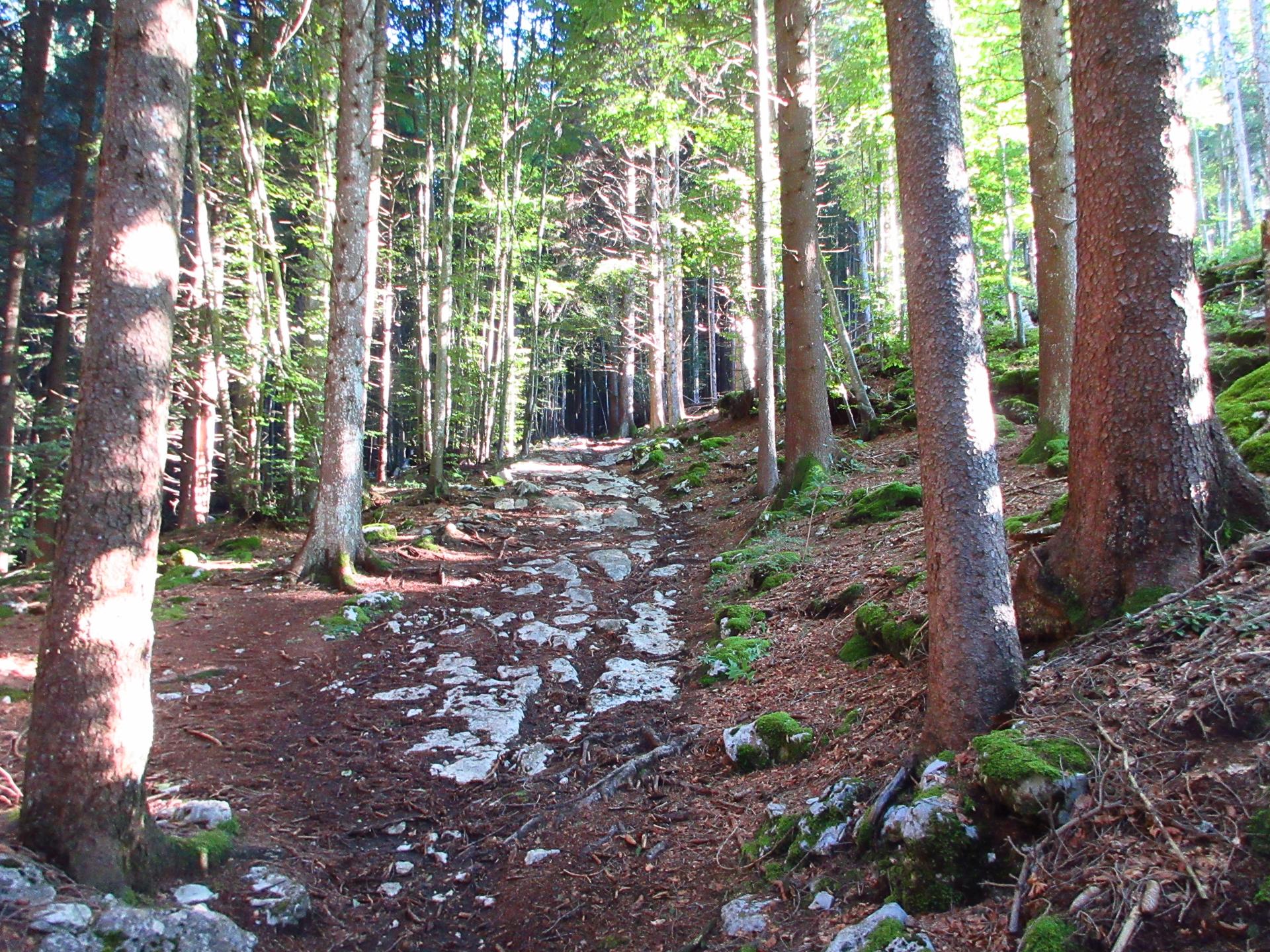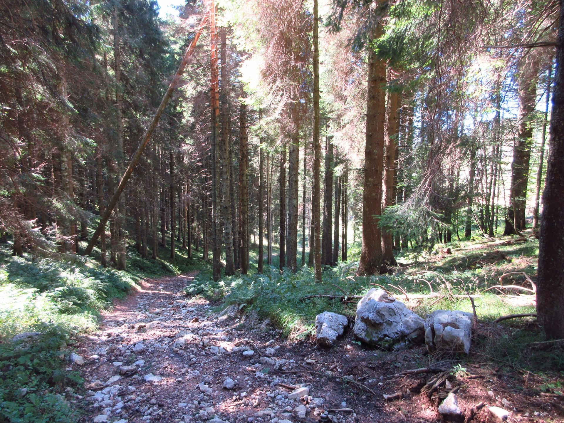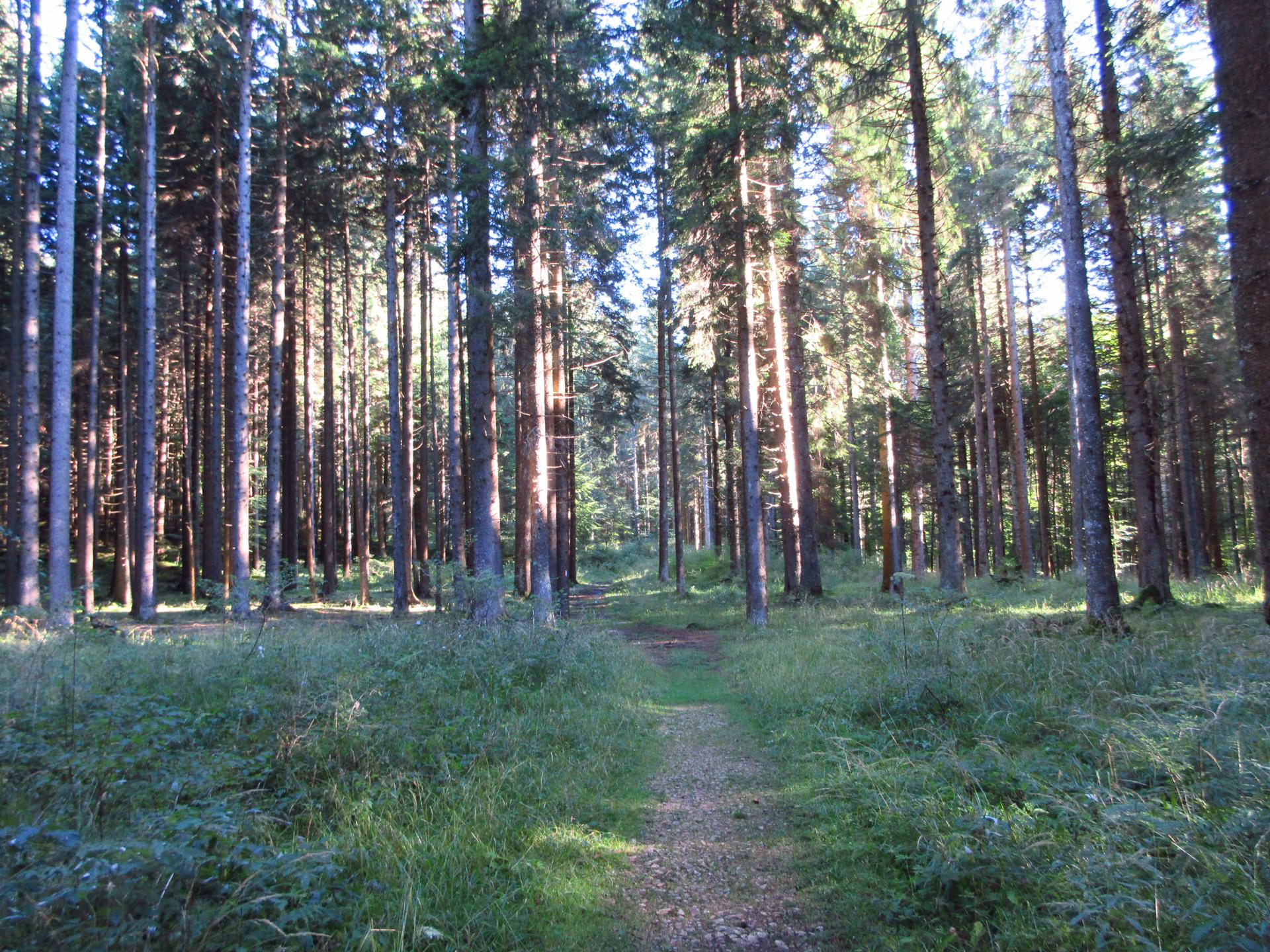 La strada prosegue in leggera salita, la pendenza aumenta gradualmente fino a raggiungere i primi abeti, dove torna nuovamente a ridursi.