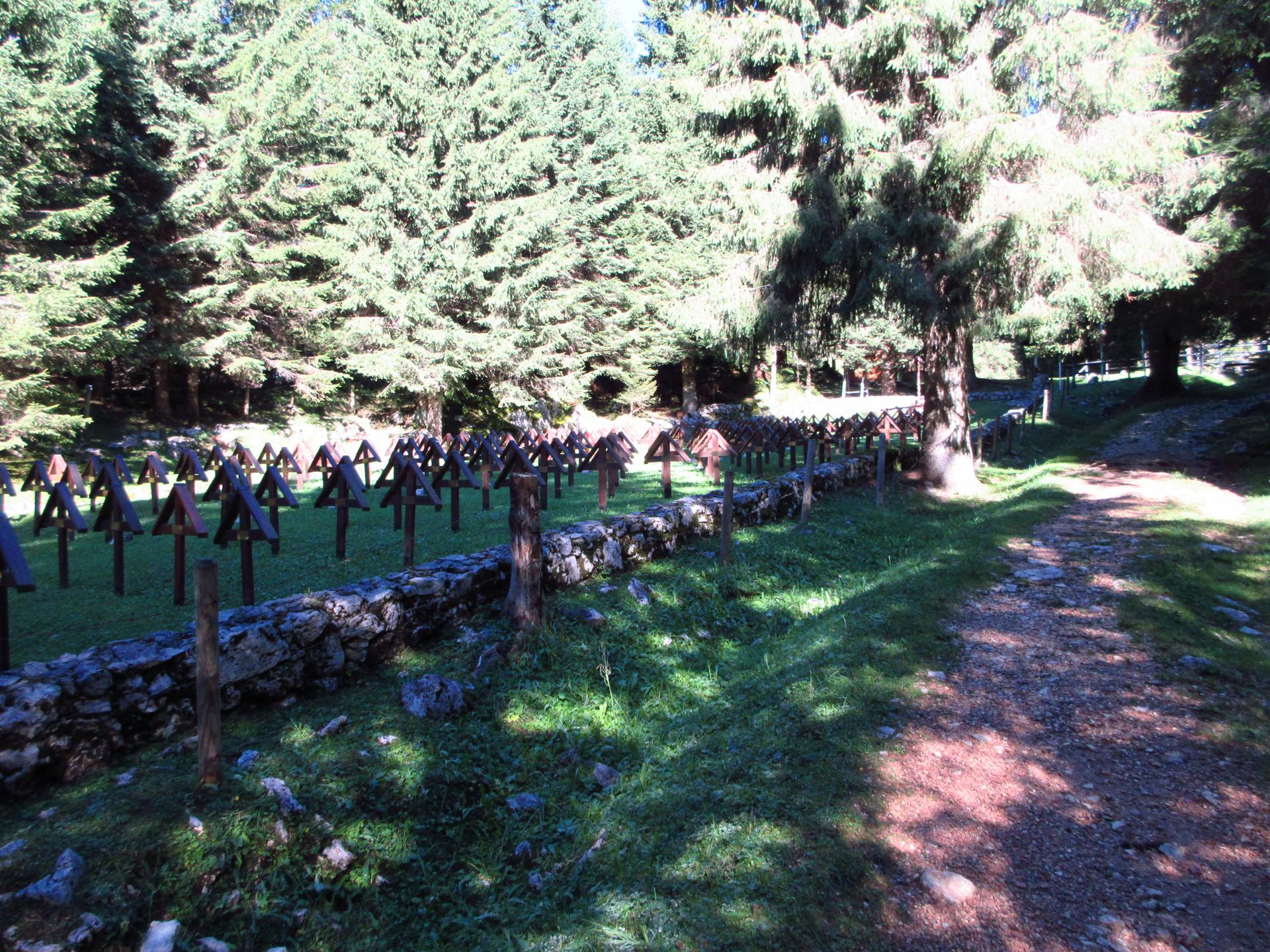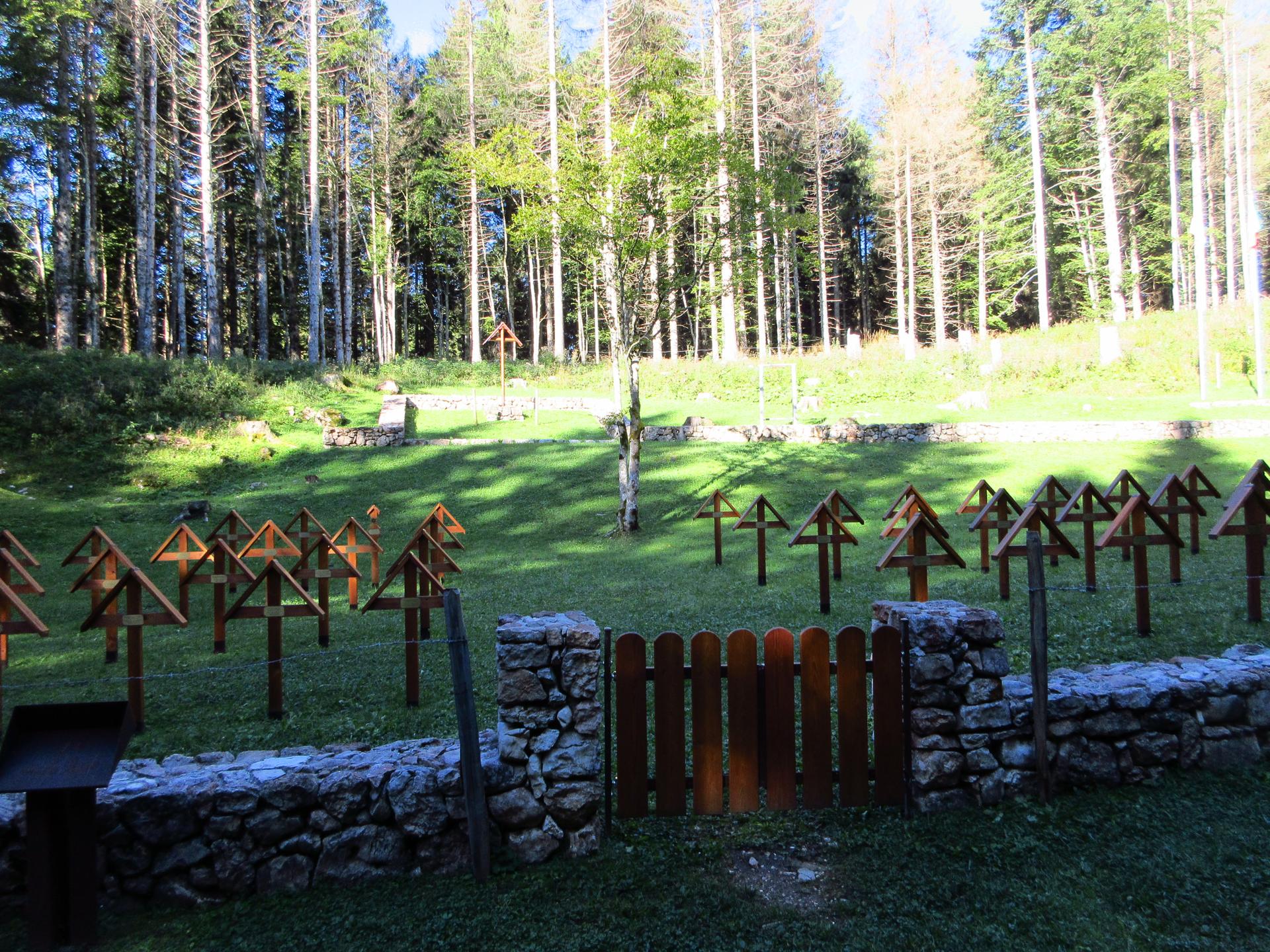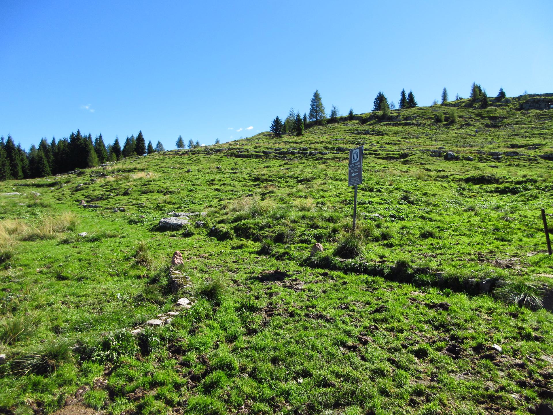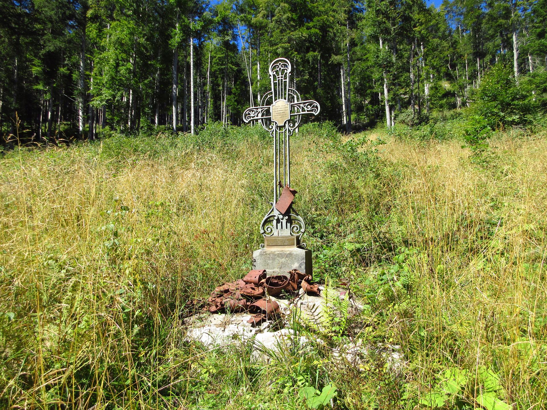Ancora un breve tratto in salita, con zig zag tra sassi e trincee, conduce alla zona sacra del Monte Zebio, dove per cause accidentali l’esplosione di una mina italiana costò la vita anche a soldati connazionali.