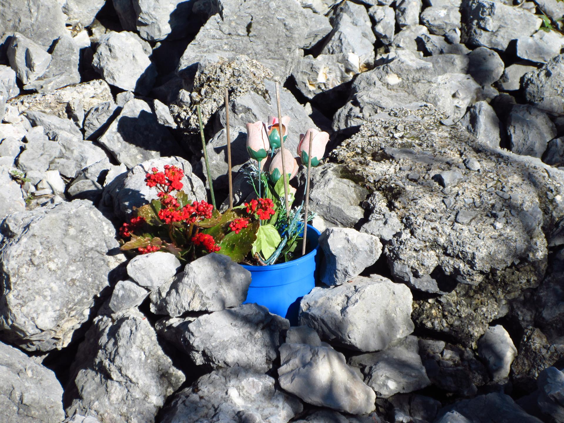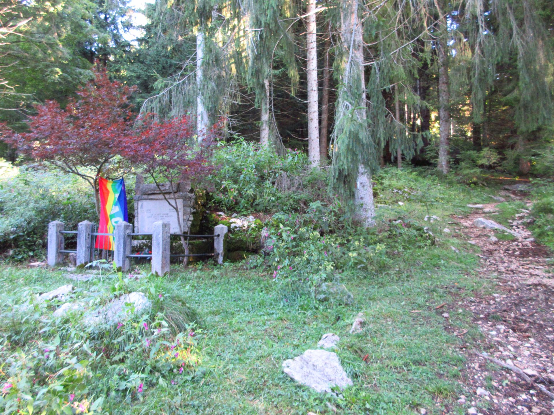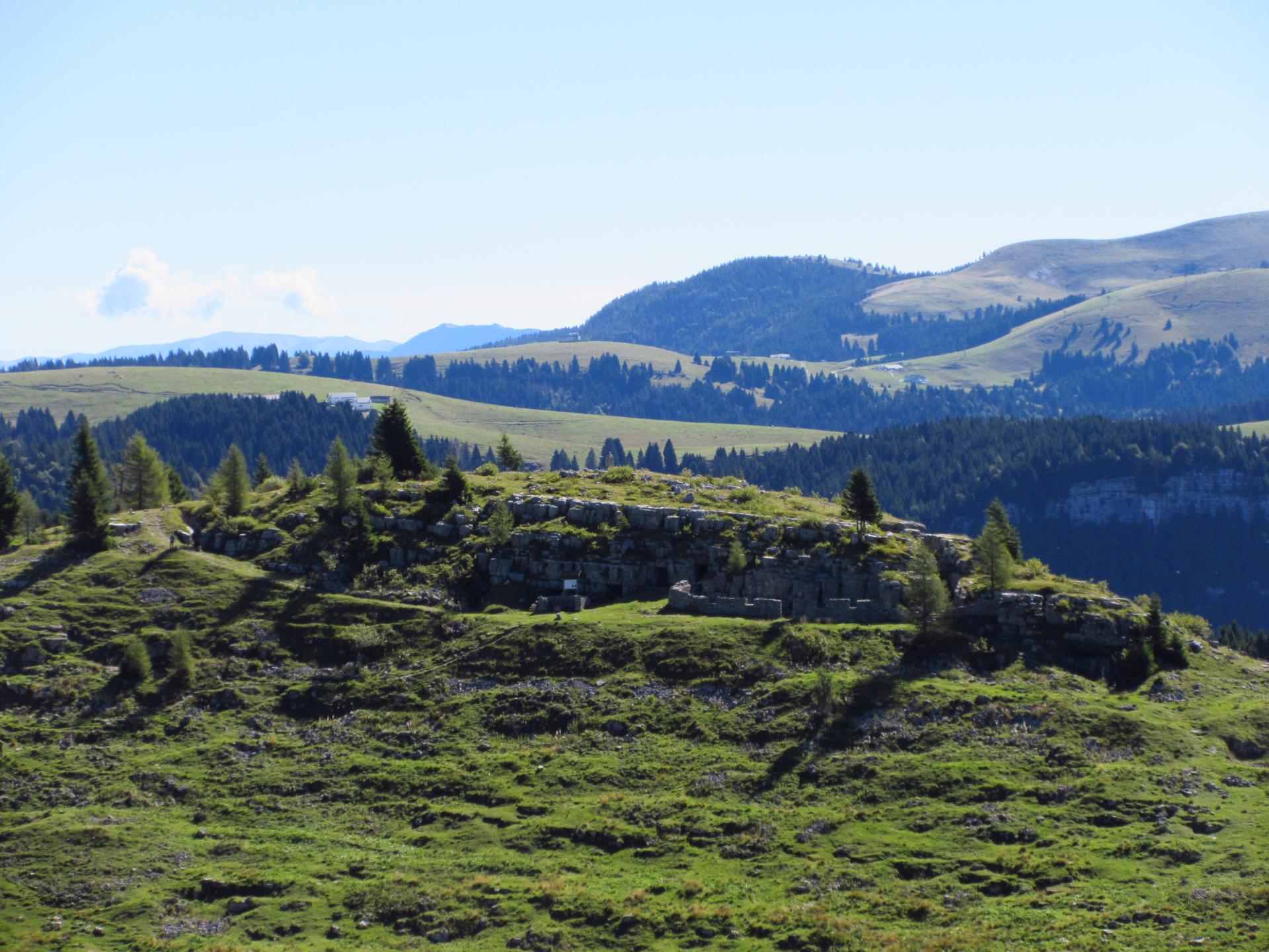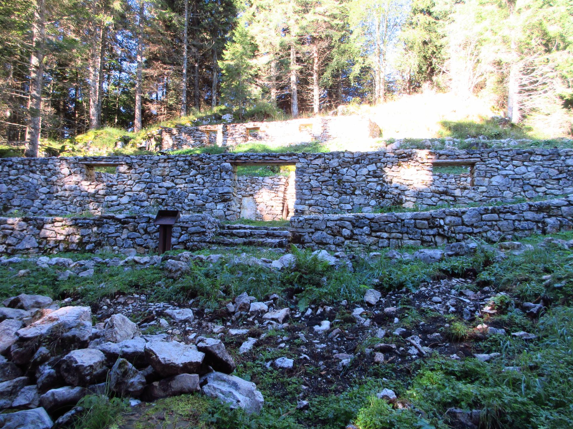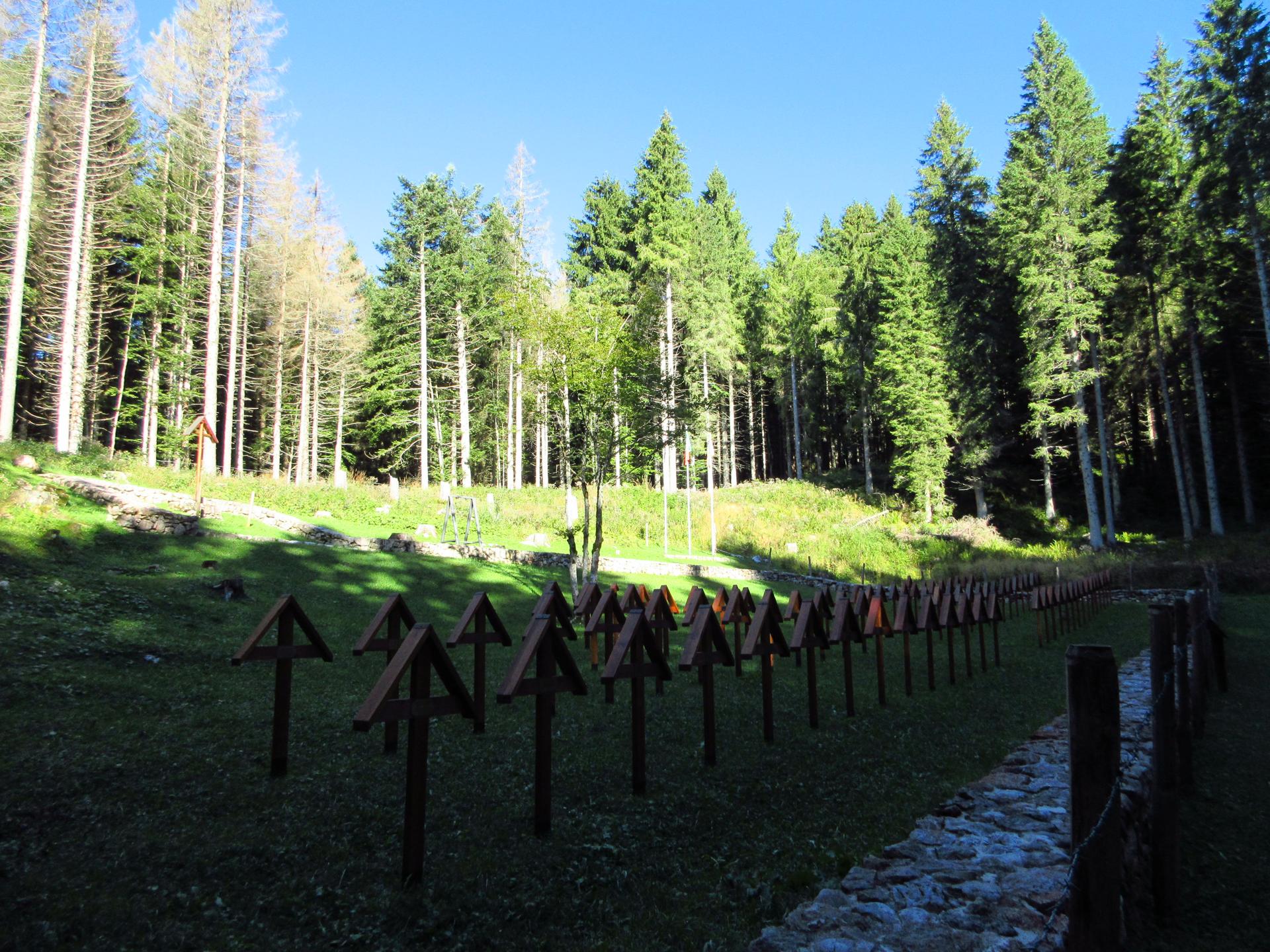 Ancora un breve tratto in salita, con zig zag tra sassi e trincee, conduce alla zona sacra del Monte Zebio, dove per cause accidentali l’esplosione di una mina italiana costò la vita anche a soldati connazionali.