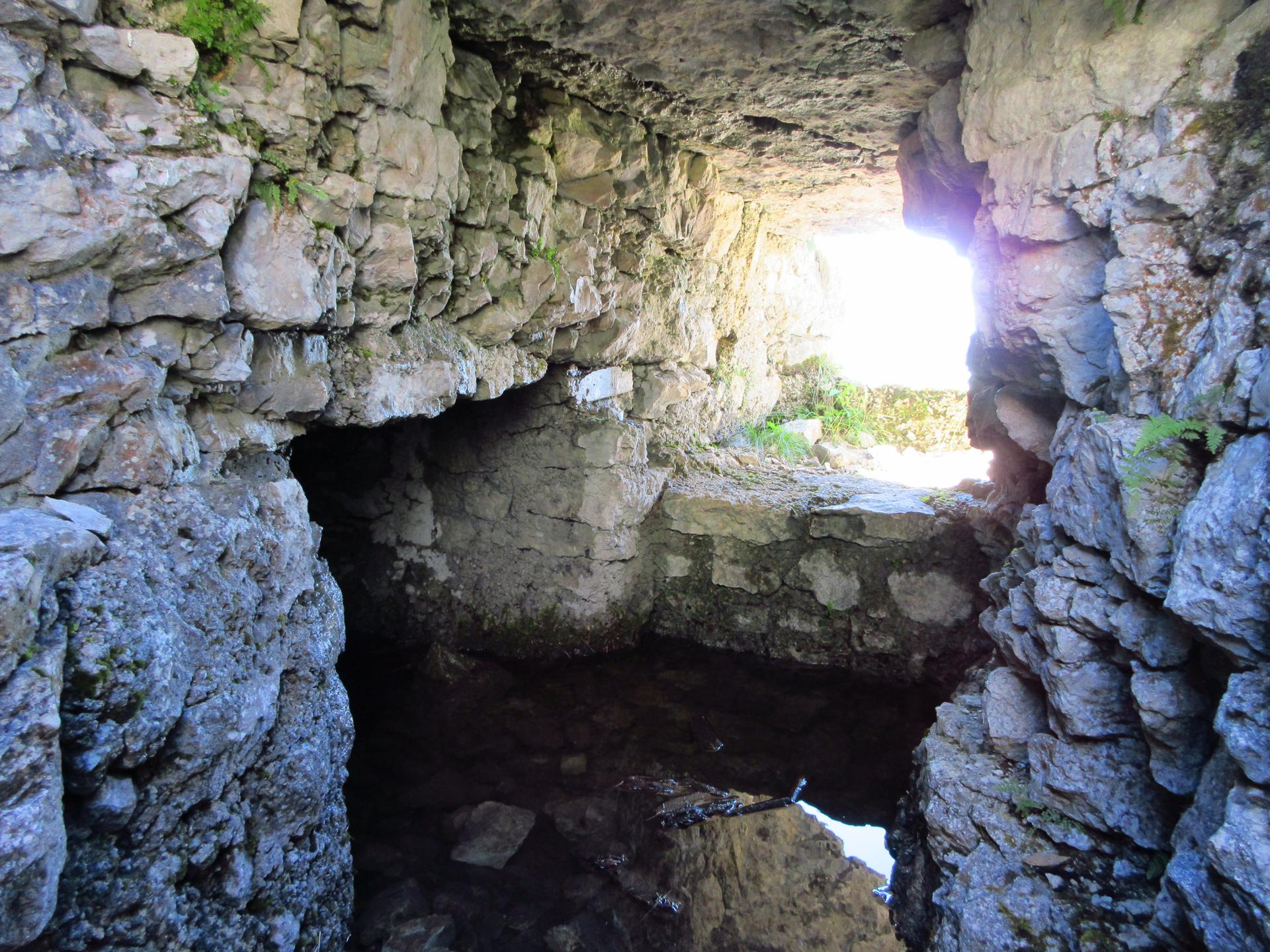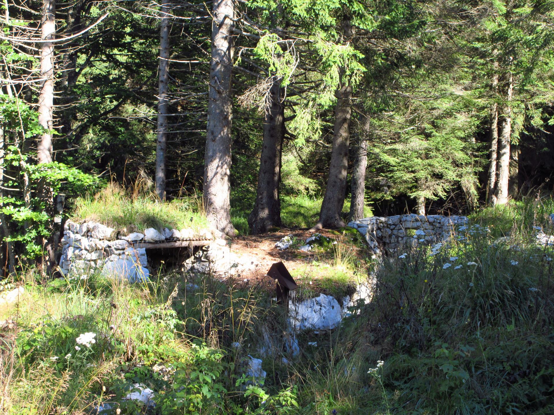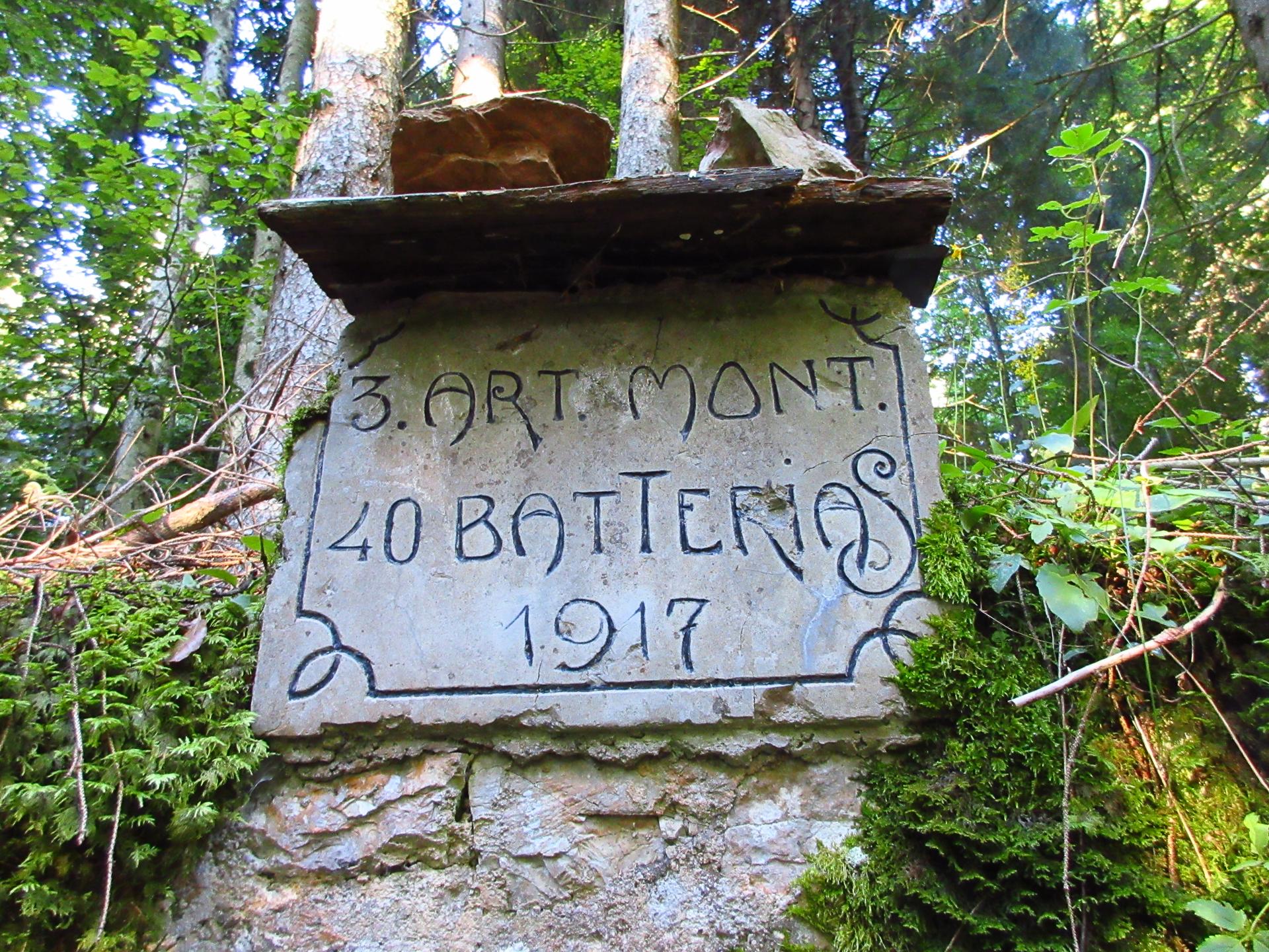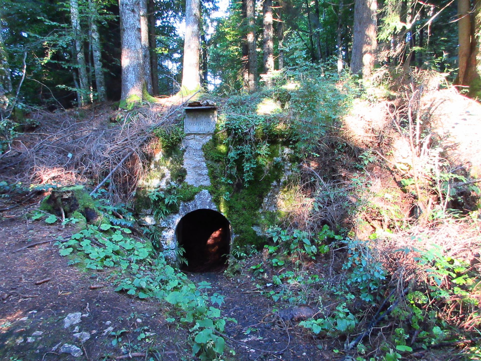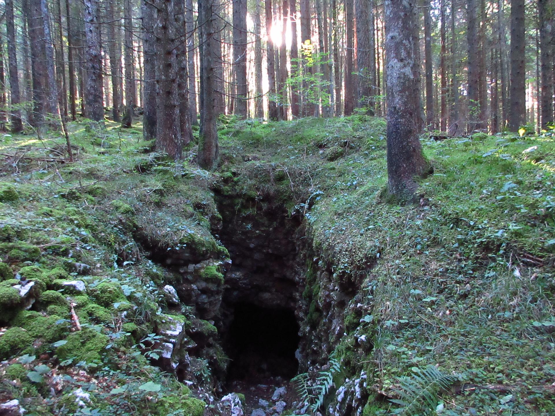 Proseguendo nel bosco, il sentiero costeggia una postazione di artiglieria in caverna risalente alla Grande Guerra.