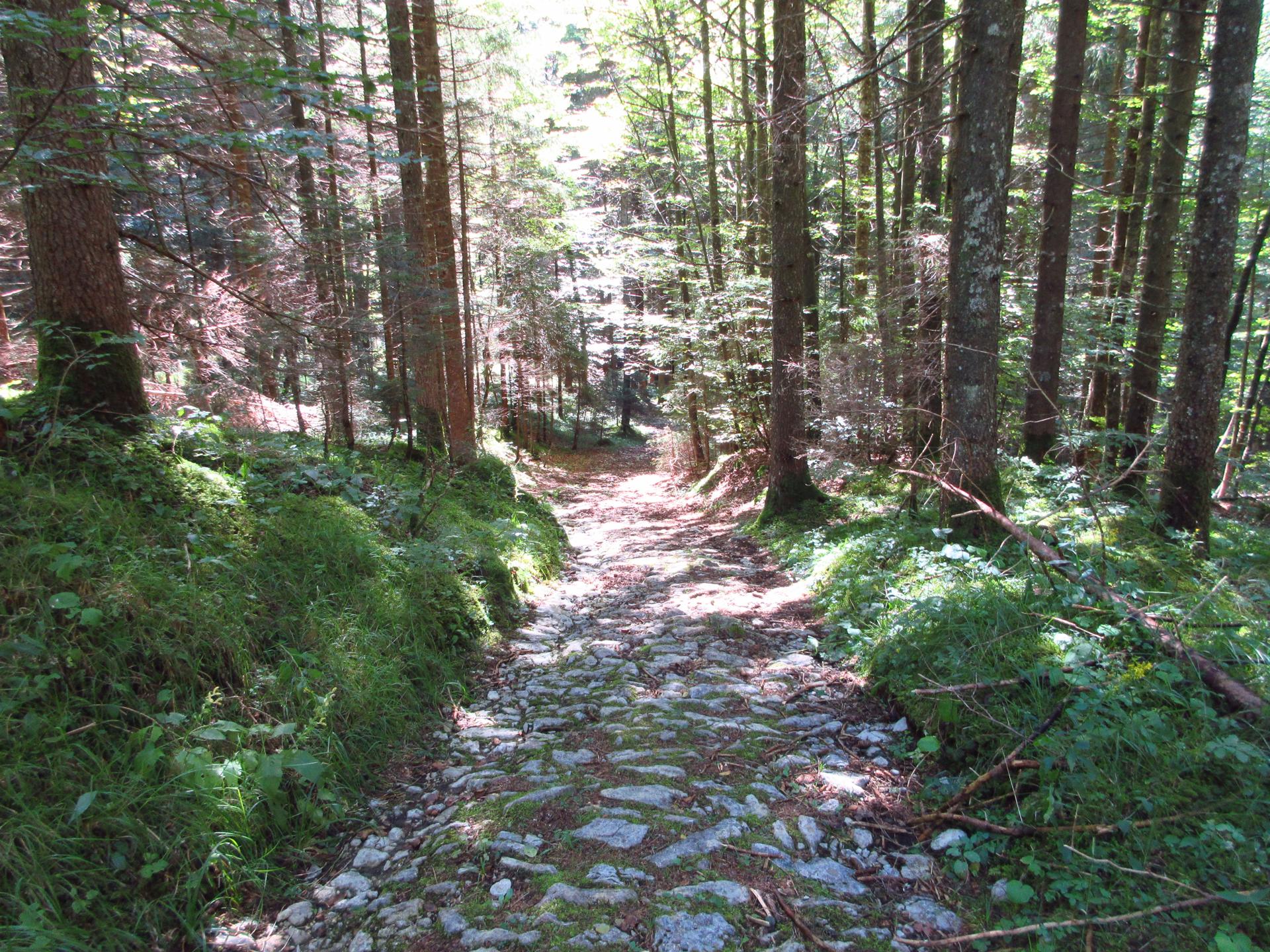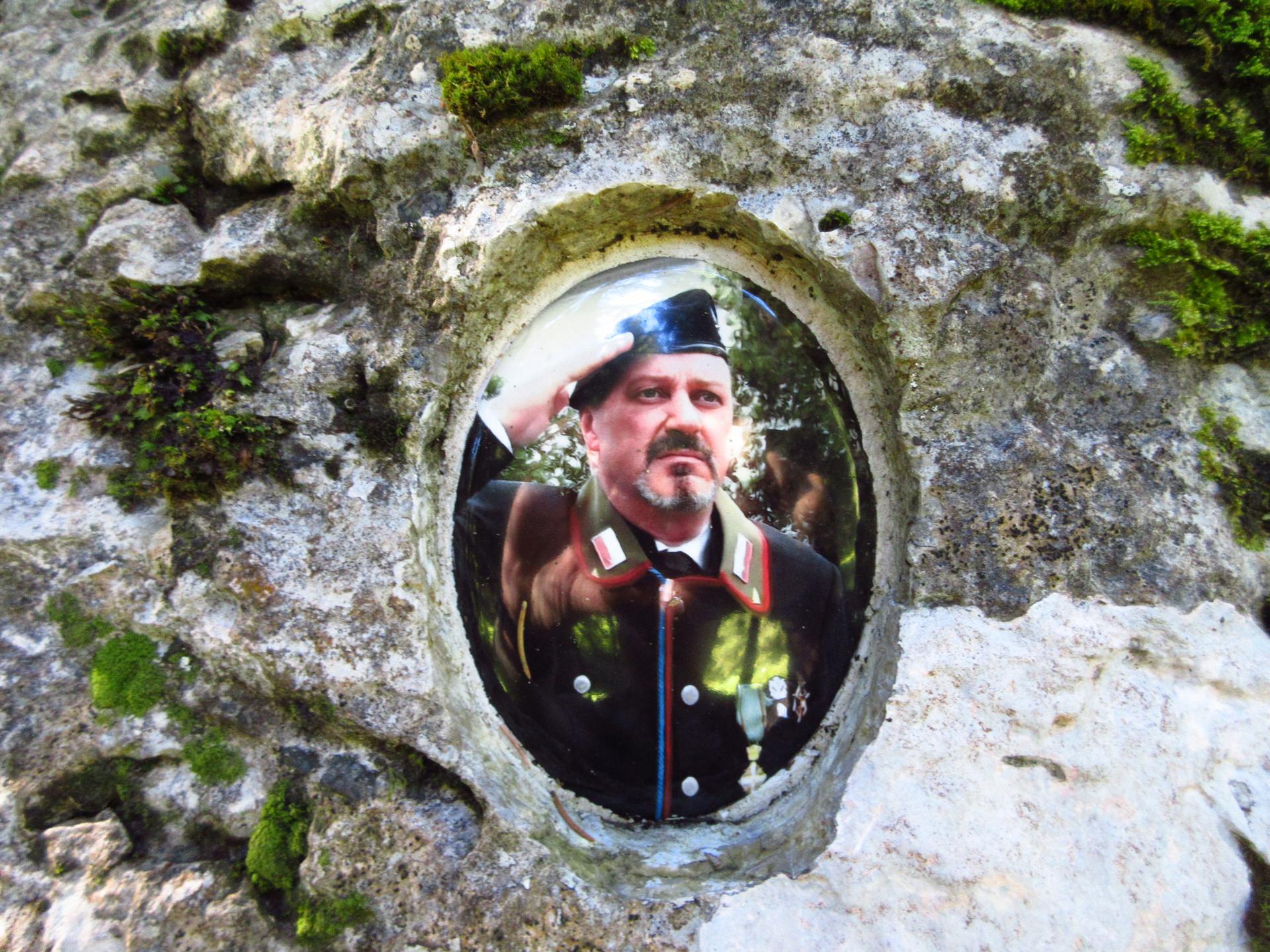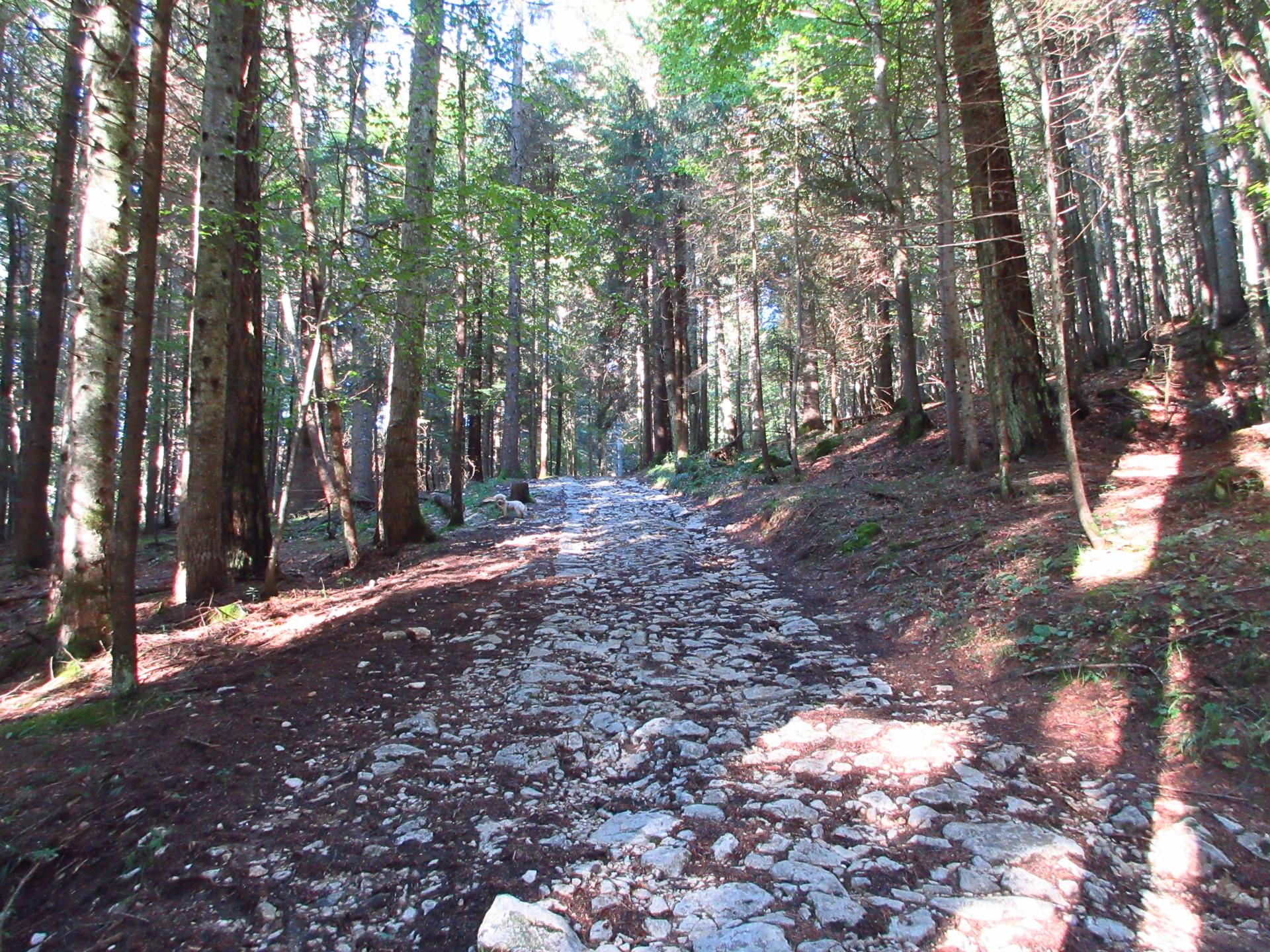 La strada si trasforma in una mulattiera militare lastricata, uno straordinario manufatto della Grande Guerra riportato alla luce con cura. Forse anche Emilio Lussu vi passò più volte, e chissà quanti altri soldati la percorsero soltanto una volta, faticosamente, in salita.