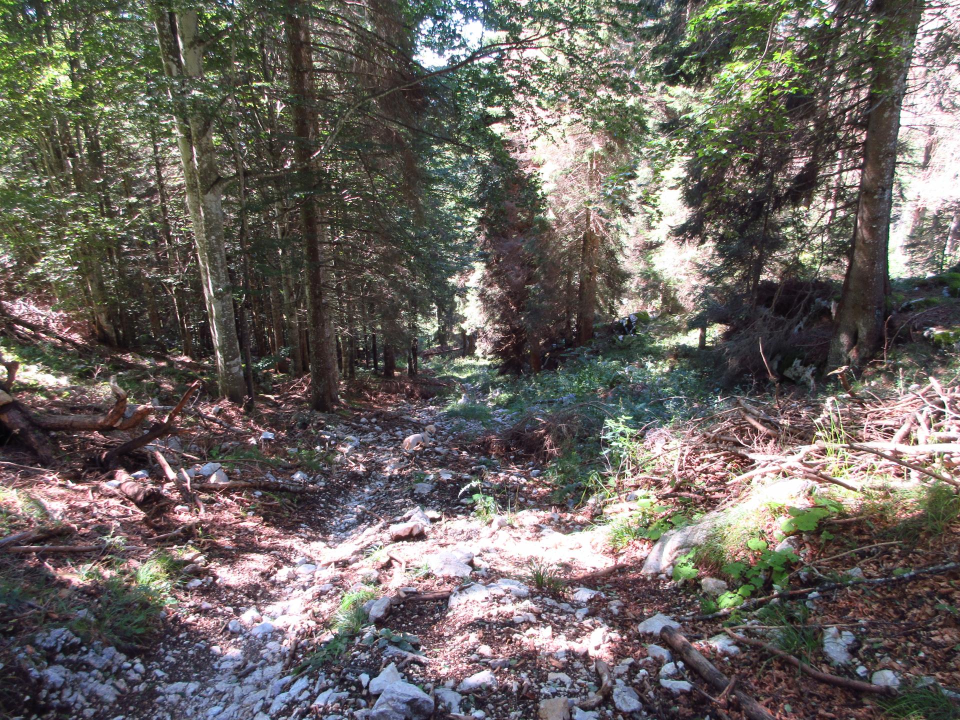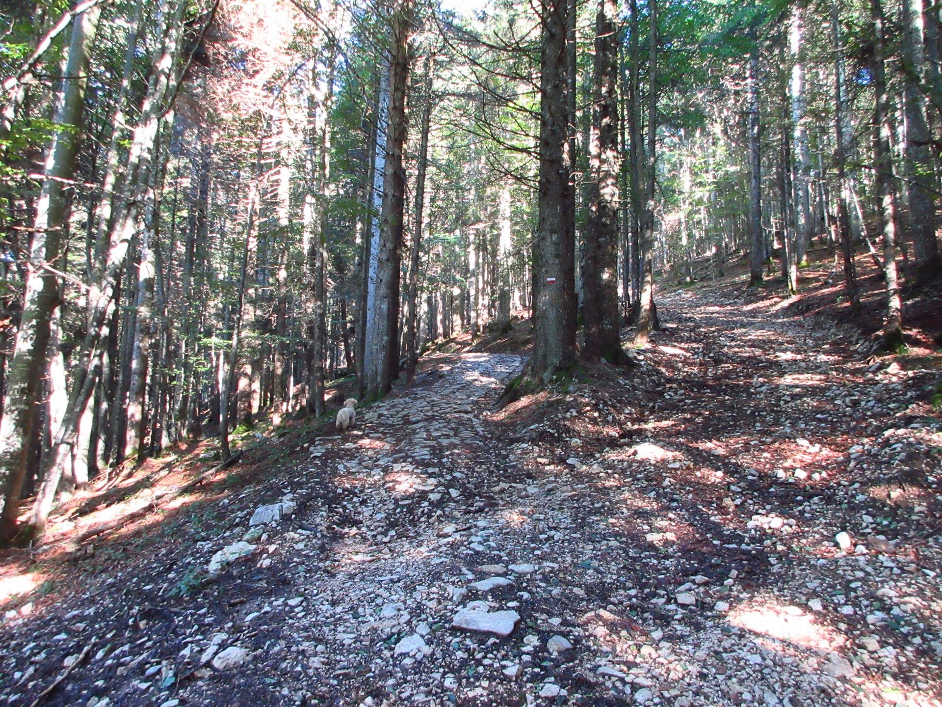All'incrocio con la strada forestale si prosegue in salita, svoltando a sinistra in direzione nord-est.