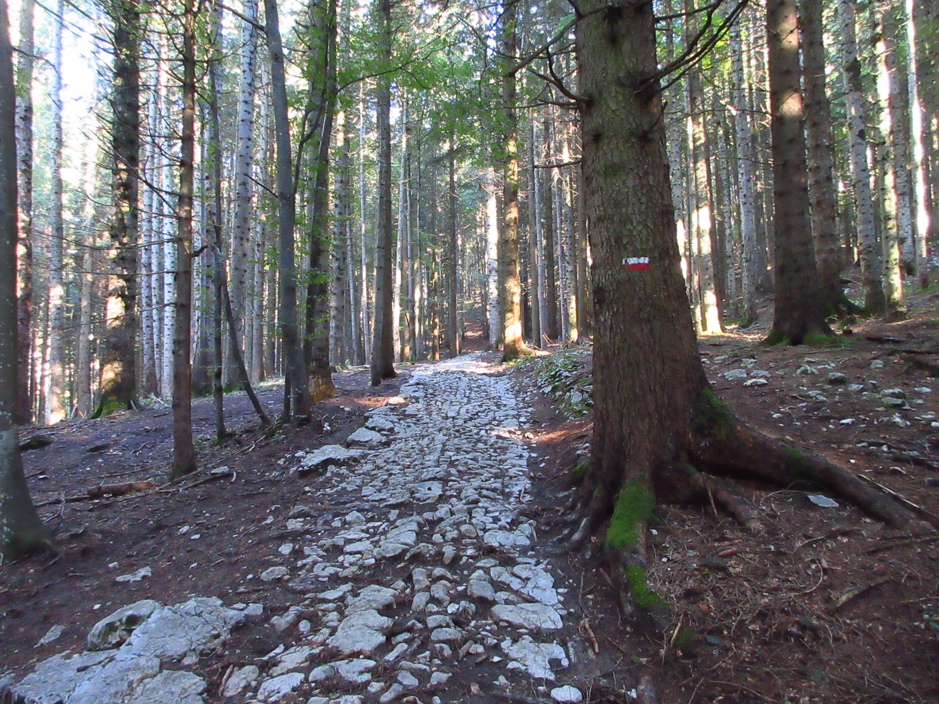 Dopo un ampio tornante a sinistra, la strada lastricata si biforca: si prosegue a destra in salita, seguendo i segni bianco-rossi del segnavia ben visibili.