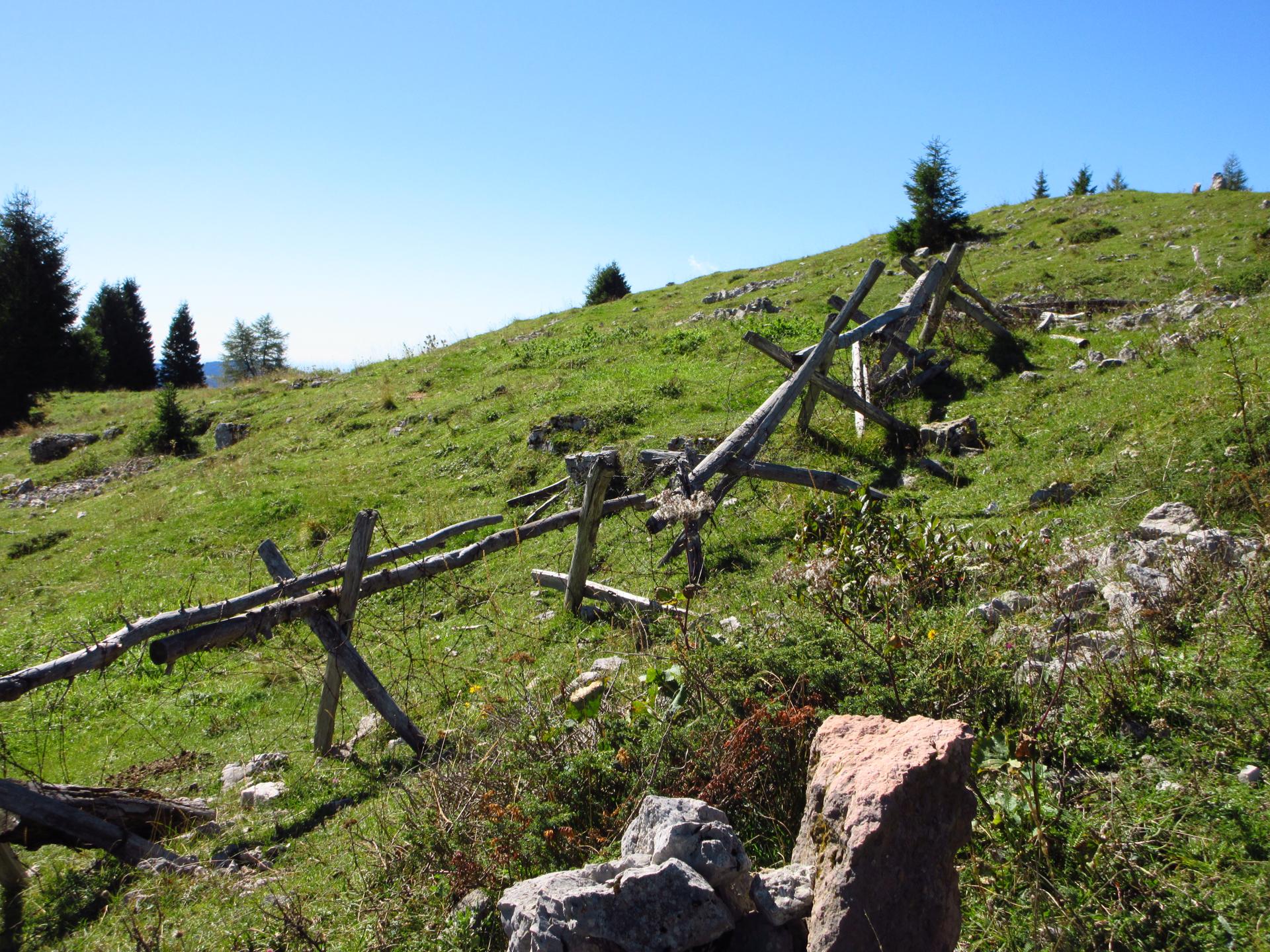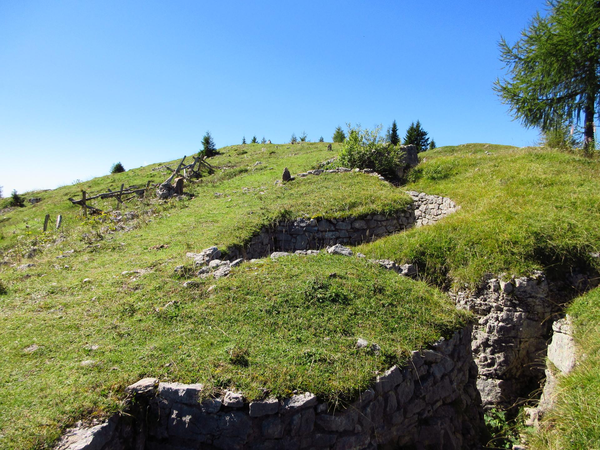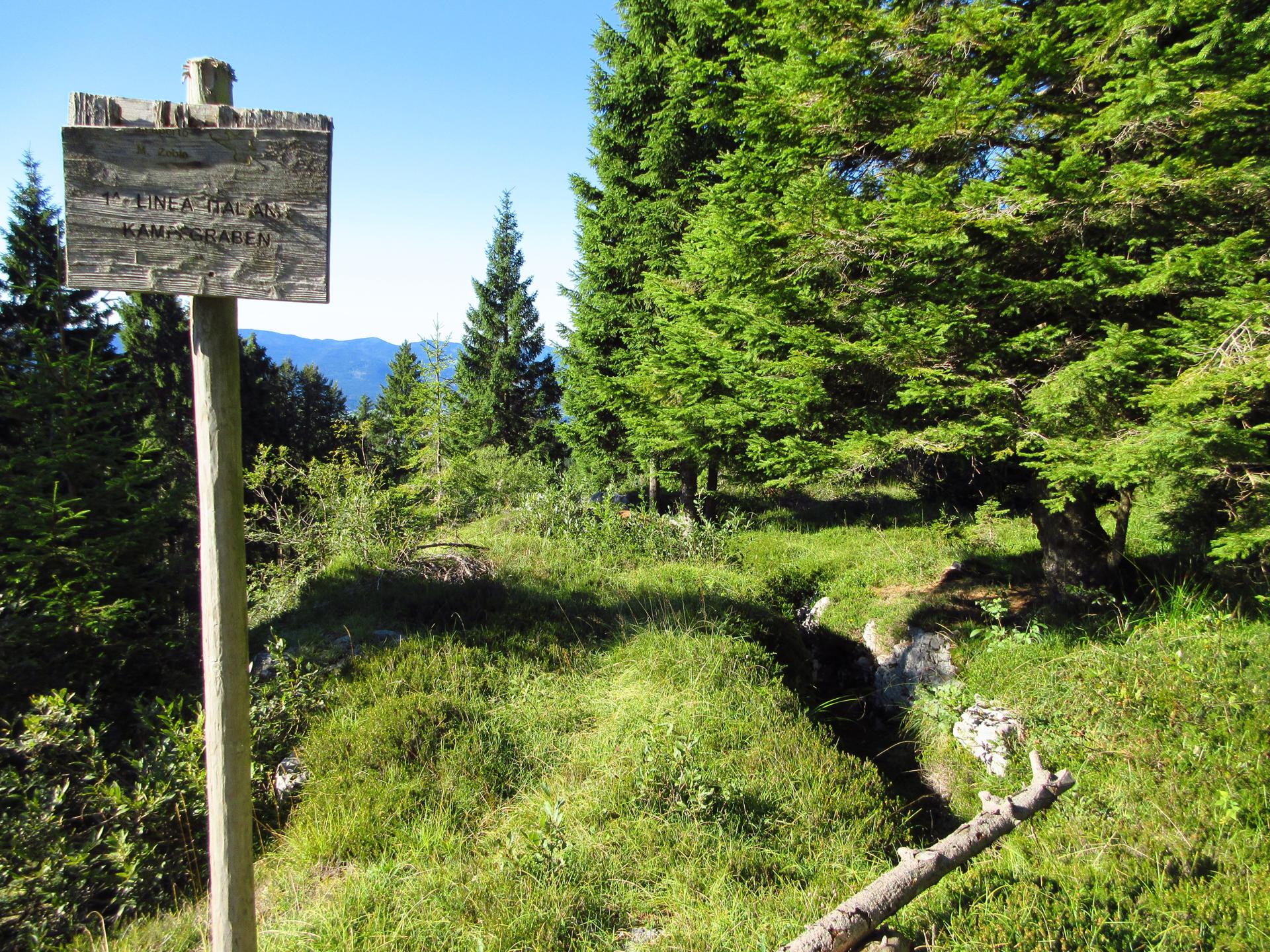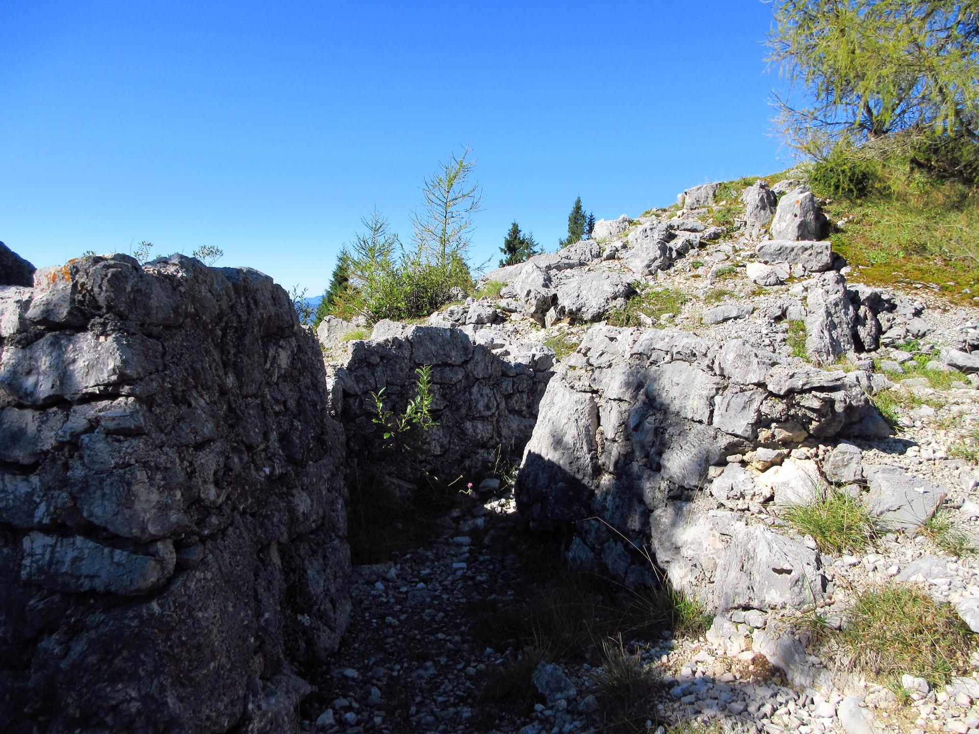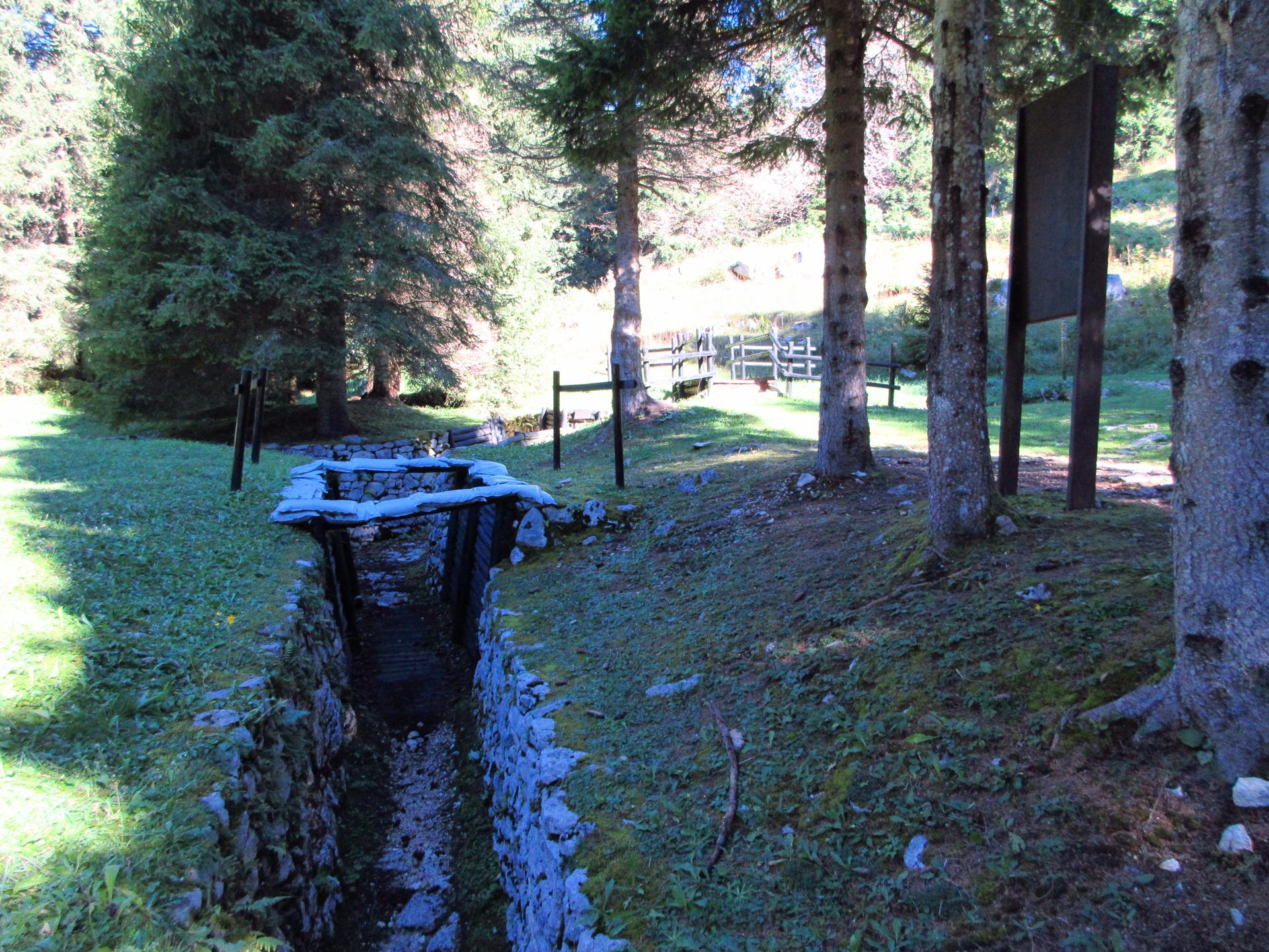 Proseguendo si incontra una croce recente e, seguendo le vecchie segnaletiche, si raggiunge la zona delle trincee, ufficialmente ancora chiusa al pubblico ma comunque facilmente oltrepassata dai turisti, visti i vari passaggi lungo la recinzione arancione di plastica.