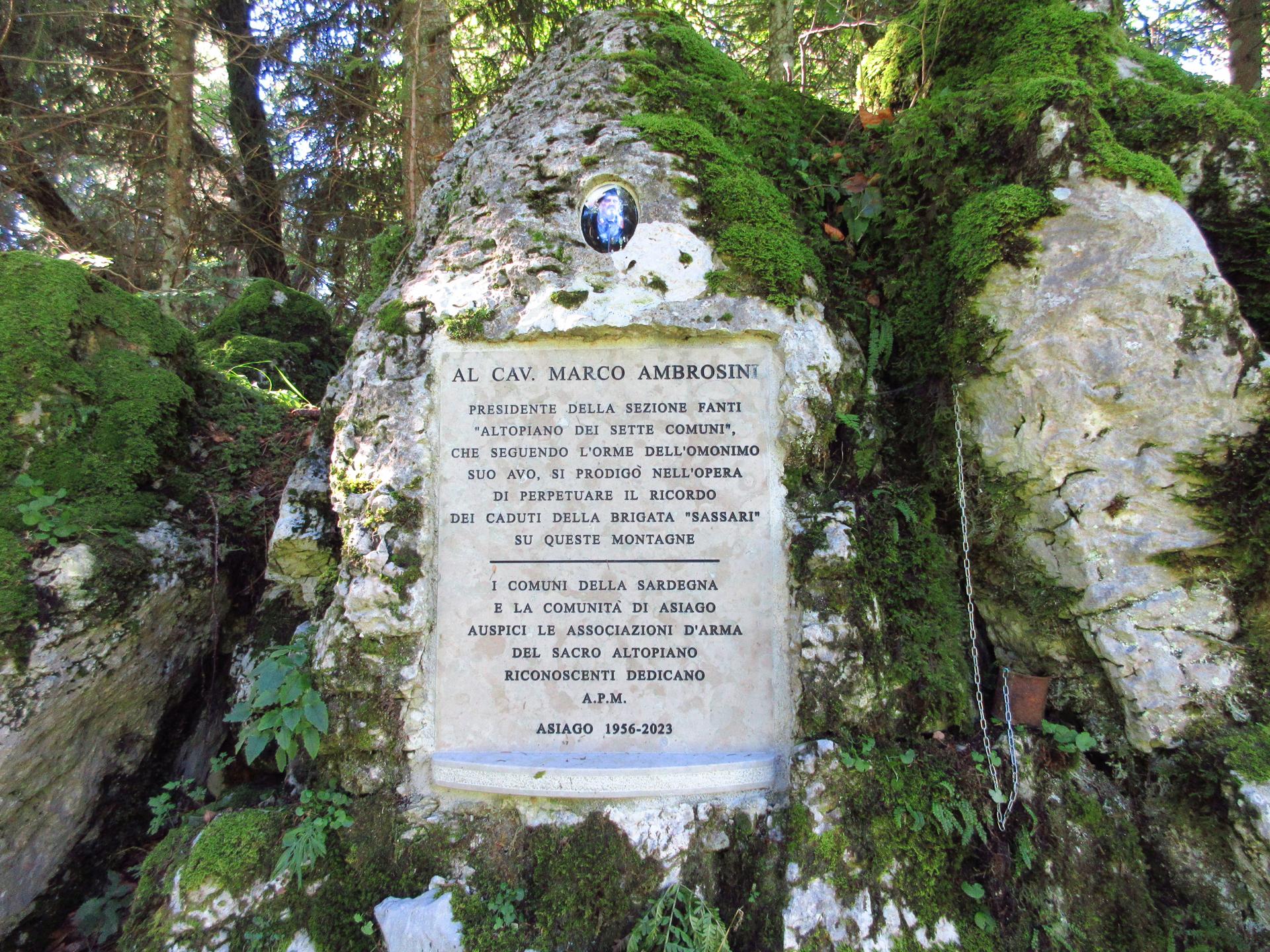 Di fronte alle medaglie d'oro, oltrepassata la trincea, su di una roccia un po' nascosta, si trova anche questa lapide al Cav. Marco Ambrosini: Presidente della sezione fanti "Altopiano dei Sette Comuni", che seguendo l'orme dell'omonimo suo avo, si prodigò nell'opera di perpetuare il ricordo dei caduti della Brigata "Sassari" su queste montagne.