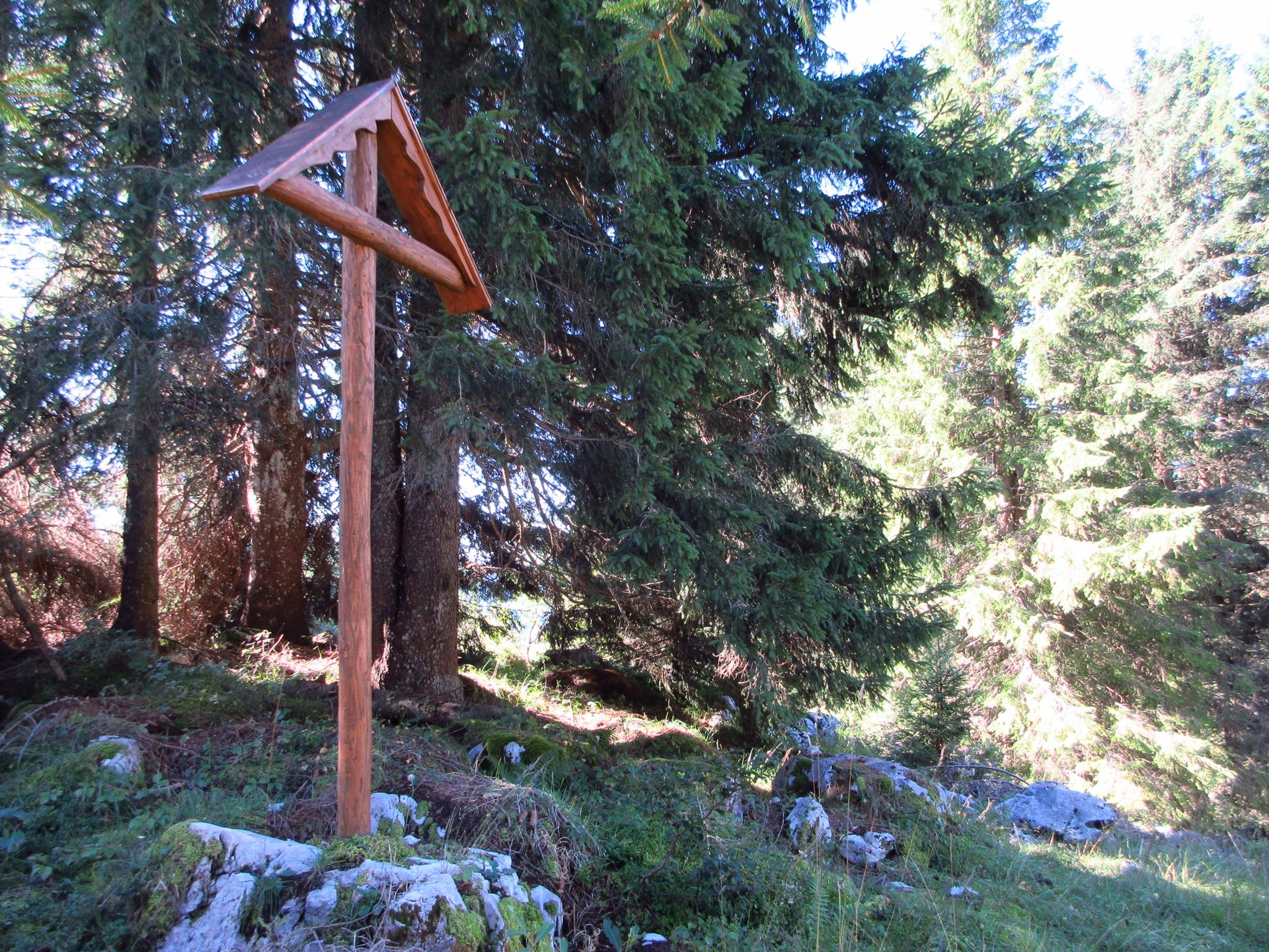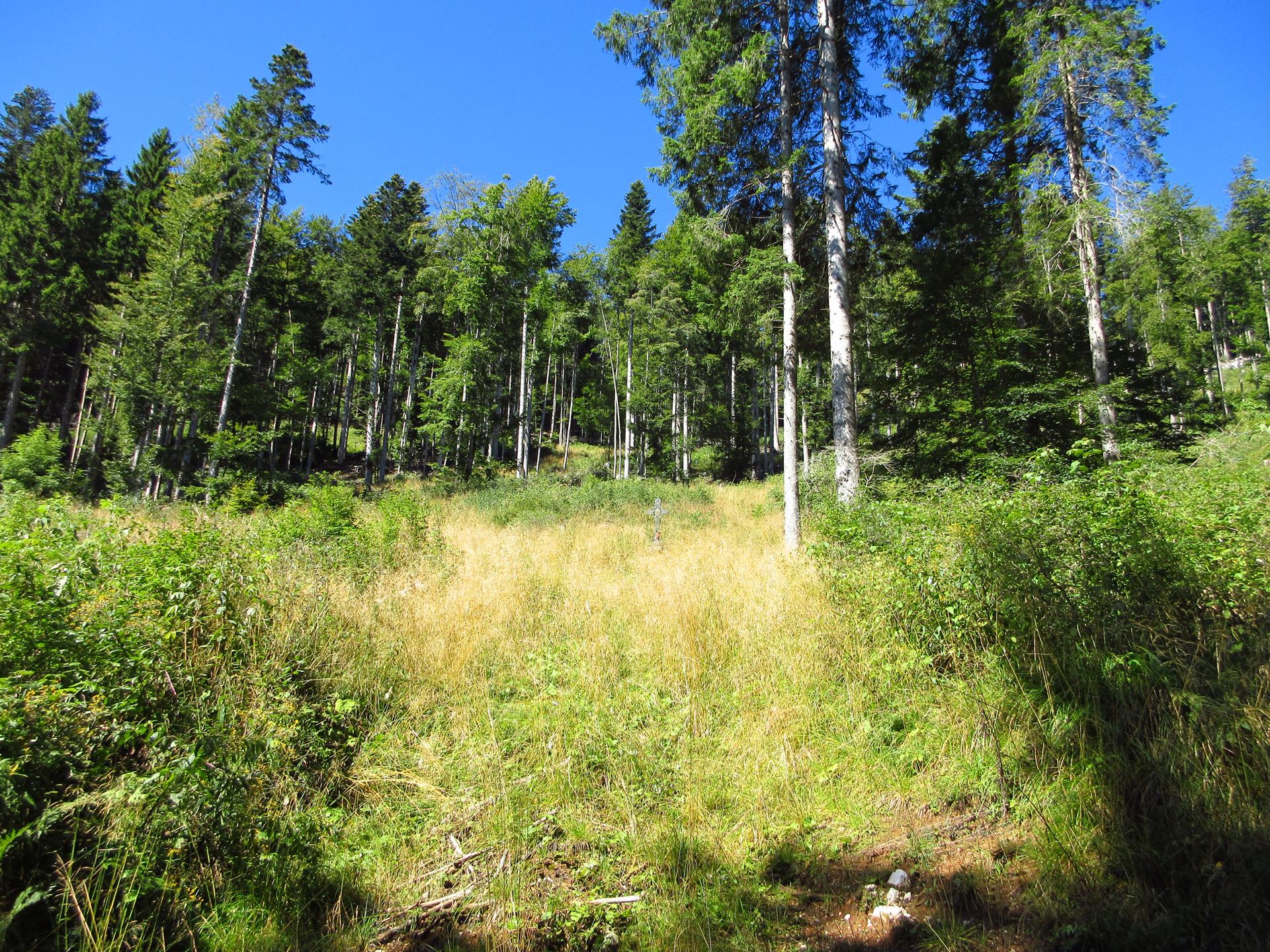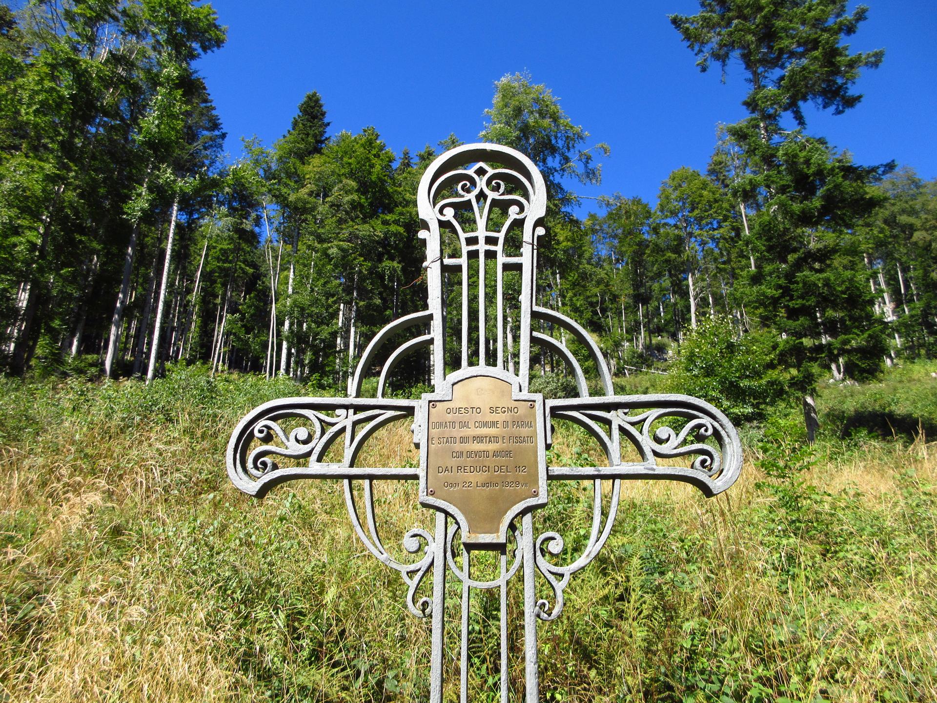 Per fortuna, a un certo punto la discesa si addolcisce e, in un tratto pianeggiante, il sentiero esce dal bosco. Poco più in alto, una decina di metri sulla destra, si trova la Croce di Parma — purtroppo non segnalata — eretta in memoria del 112° Fanteria, che combatté su queste pendici dal 26 giugno 1916 al 26 giugno 1917.