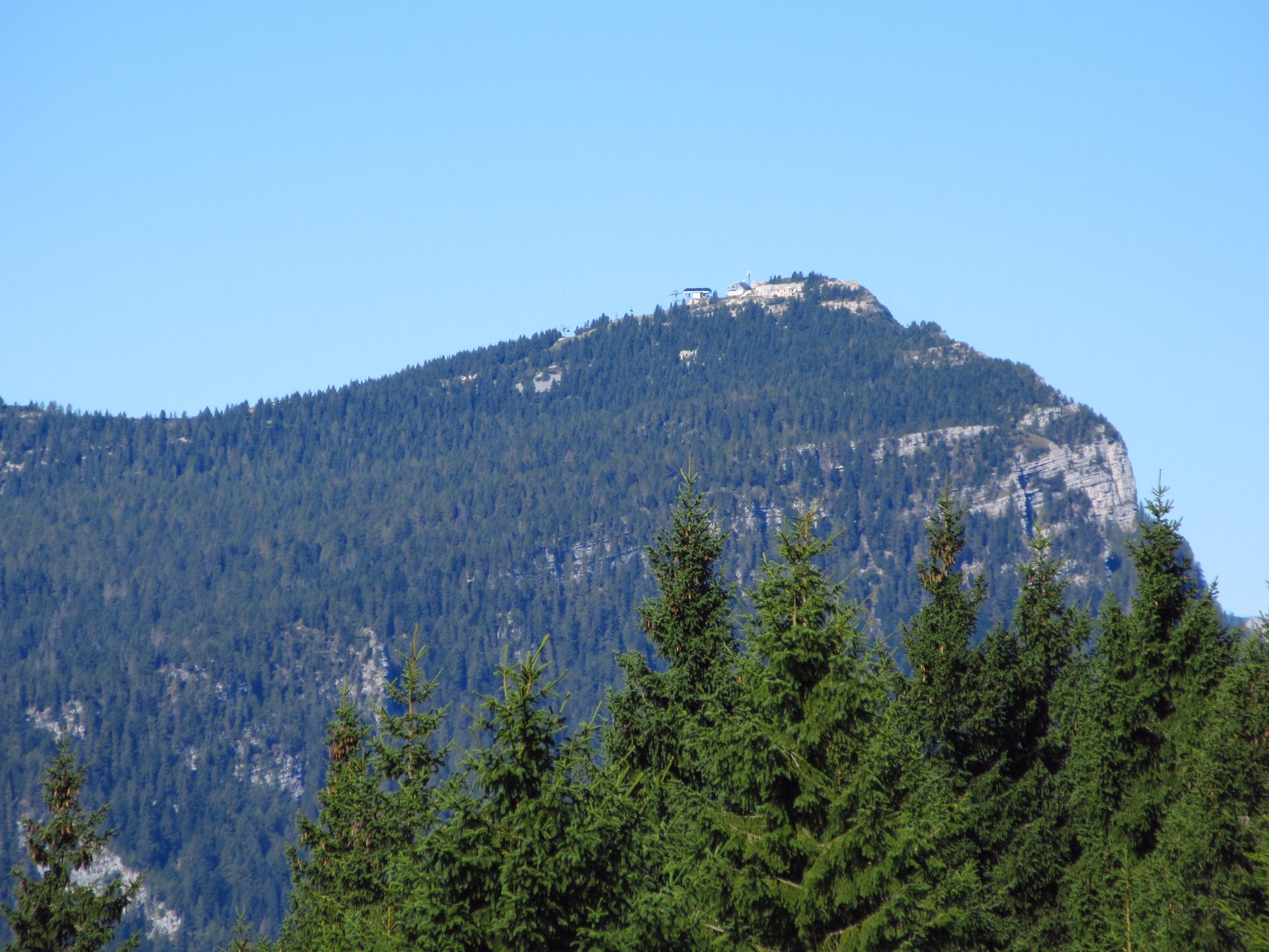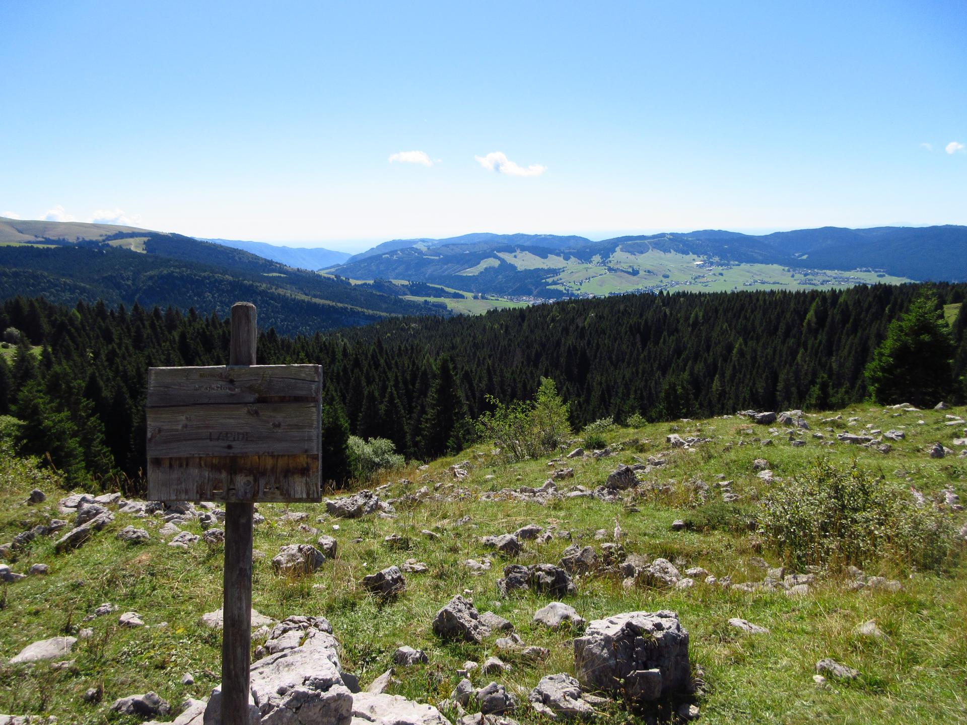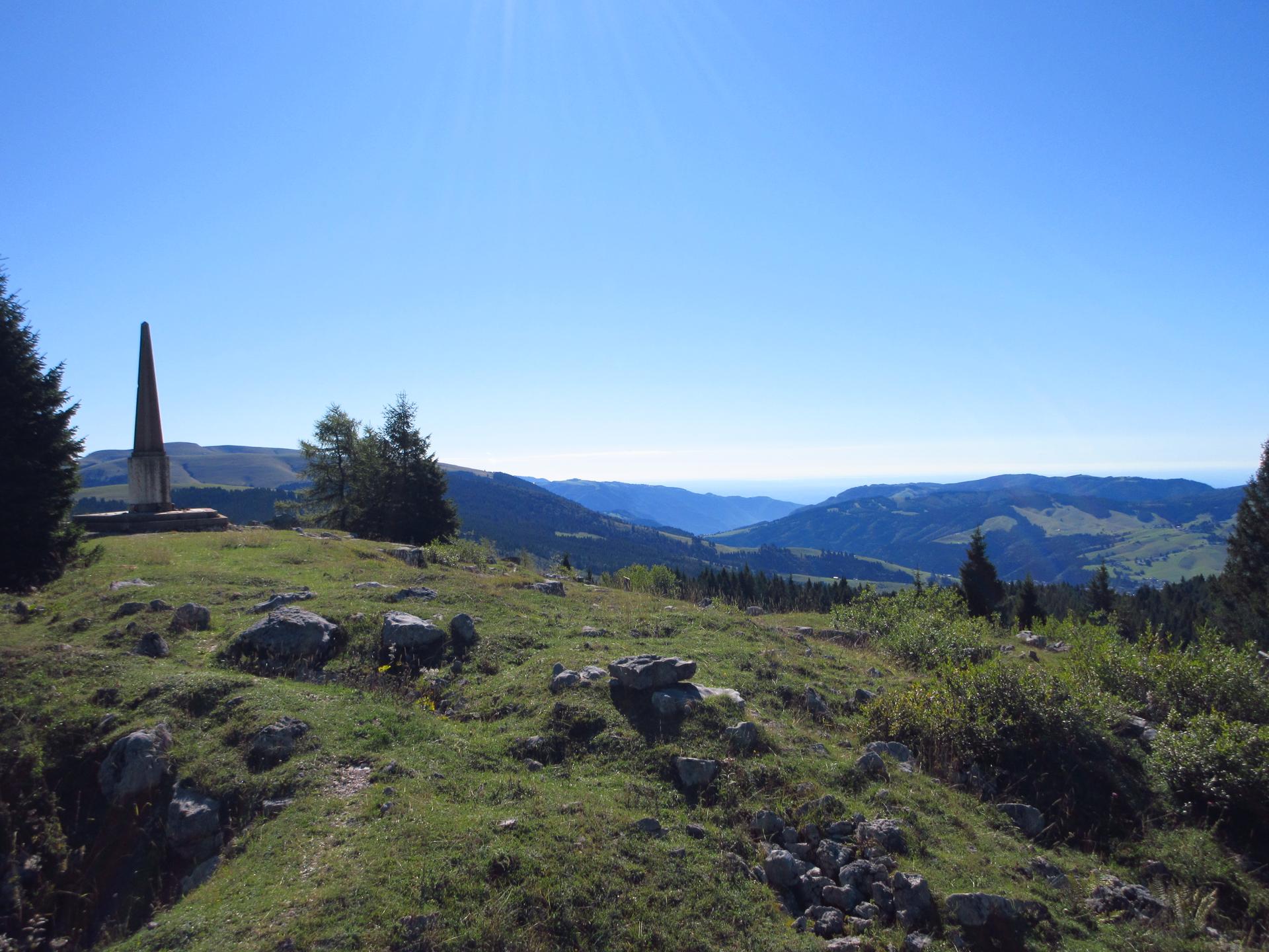 Avvicinandosi alla cima il bosco scompare e lo sguardo si apre su un ampio panorama, che spazia dal vicino Monte Verena fino alle lontane Dolomiti Bellunesi.