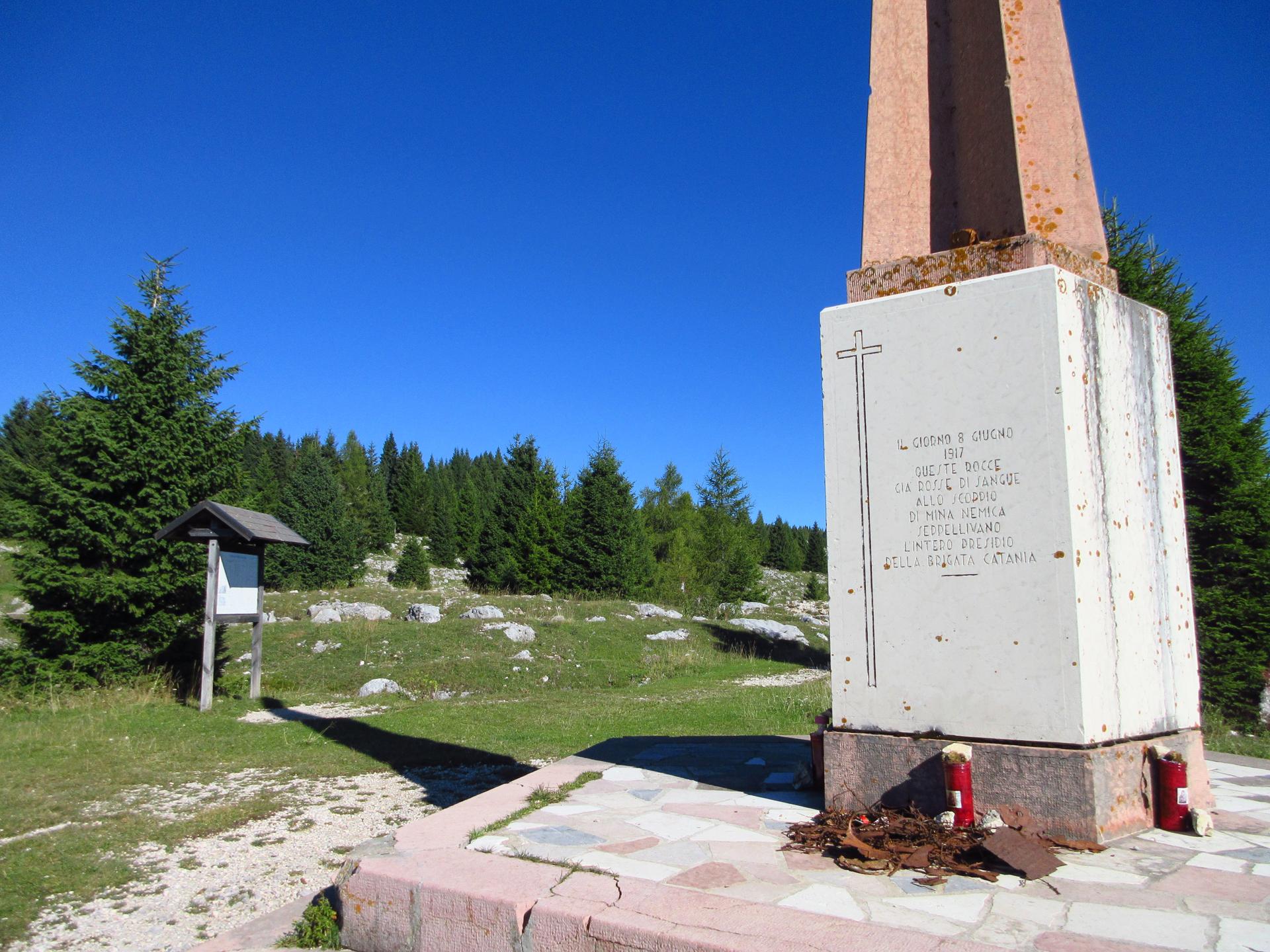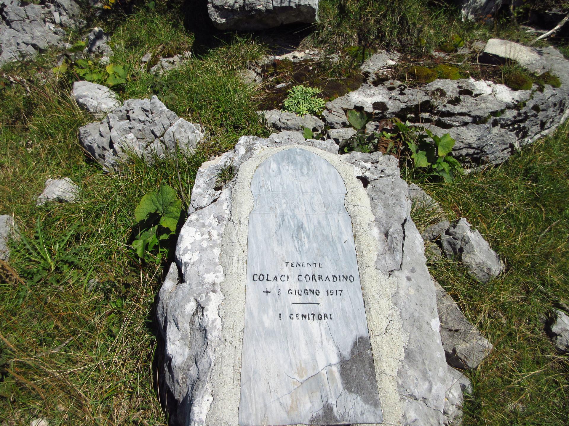 Scendendo ancora per pochi metri e superata una piccola sella sulla sinistra, si incontra una lapide dedicata al tenente Colaci Corradino, caduto l’8 giugno 1917, con la dedica dei suoi genitori.