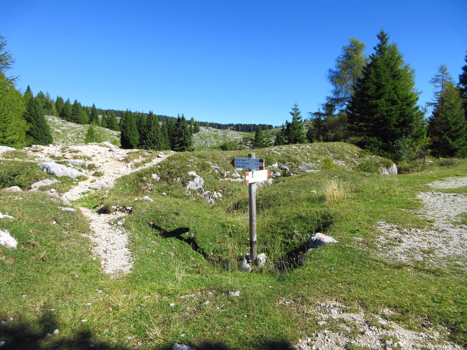 Nella valle alla destra si scorge Malga Zebio e, poco più in alto, la Crocetta di Zebio.