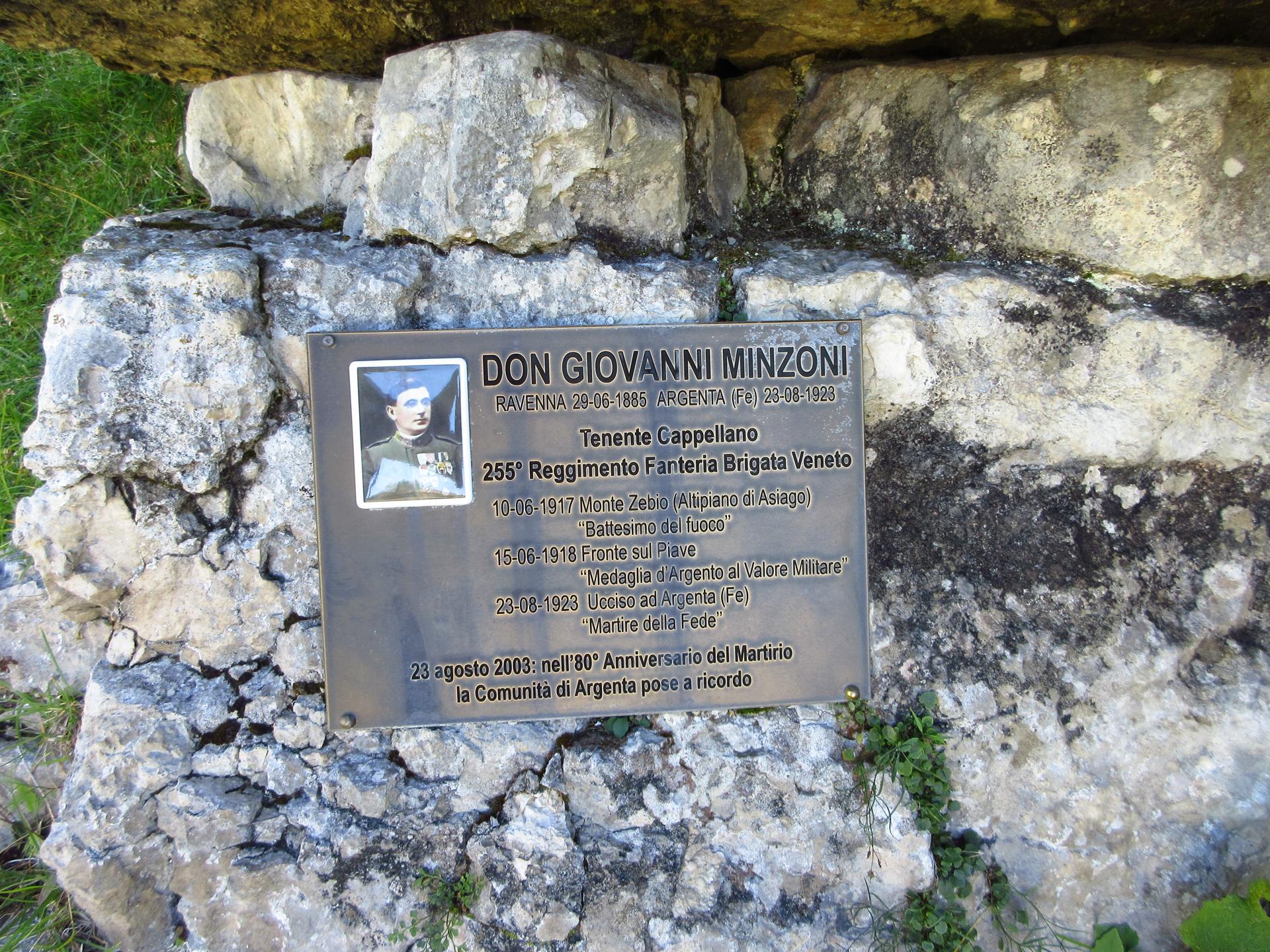 Usciti dalla trincea e scendendo a sinistra, sotto un piccolo riparo scavato nella roccia si incontra una targa dedicata al tenente cappellano Don Giovanni Minzoni, che proprio sullo Zebio ebbe il suo battesimo di fuoco e fu poi decorato con la medaglia d’argento al valore sul fronte del Piave.