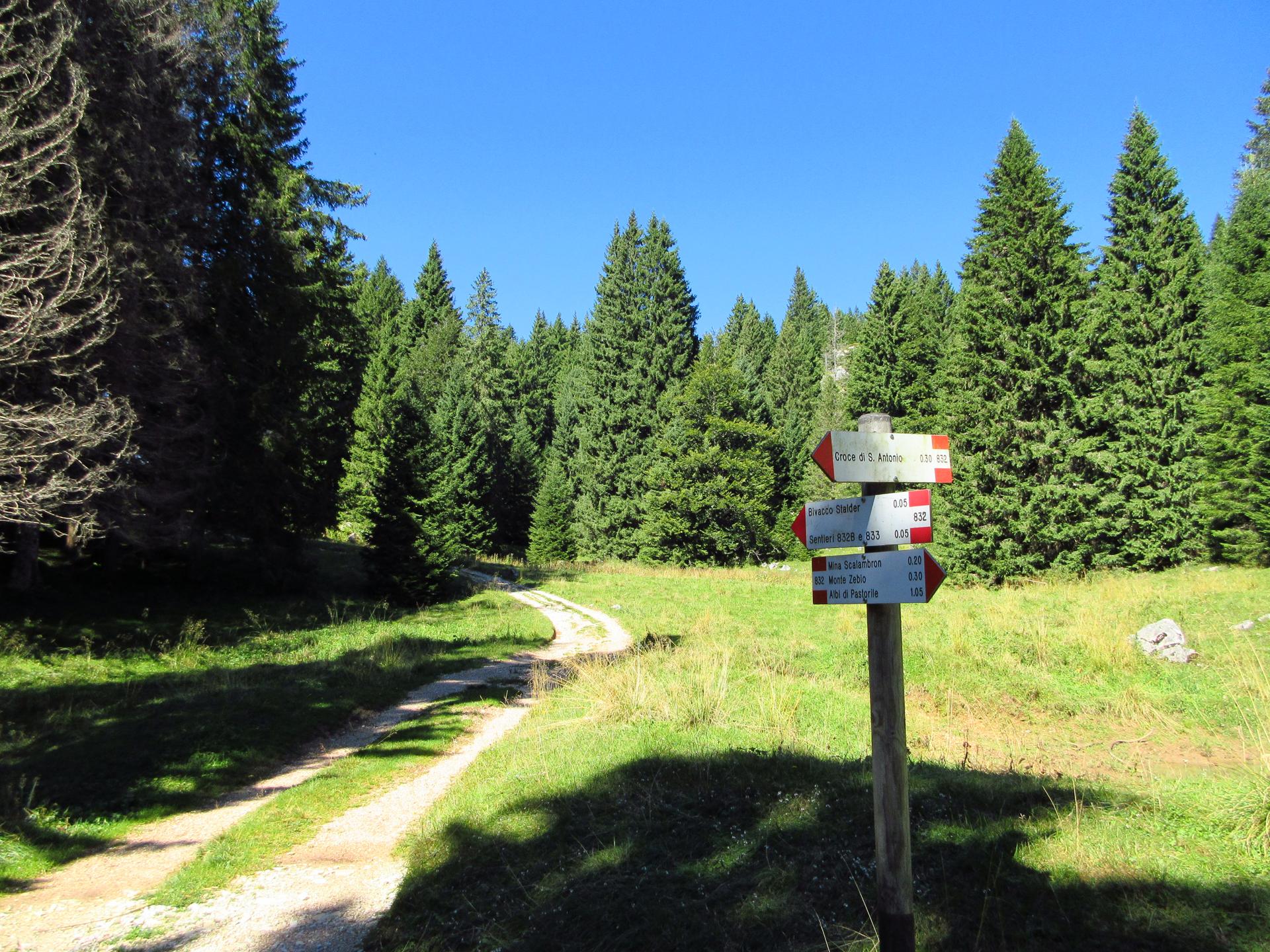 All'ingresso del bosco la strada si trasforma in sentiero e, poco dopo, si incontra un bivio. Qui si prosegue a destra, costeggiando una lapide dedicata a Giuseppe e Rinaldo Rigoni, “che su queste montagne caddero sotto il piombo nazifascista per la libertà”.