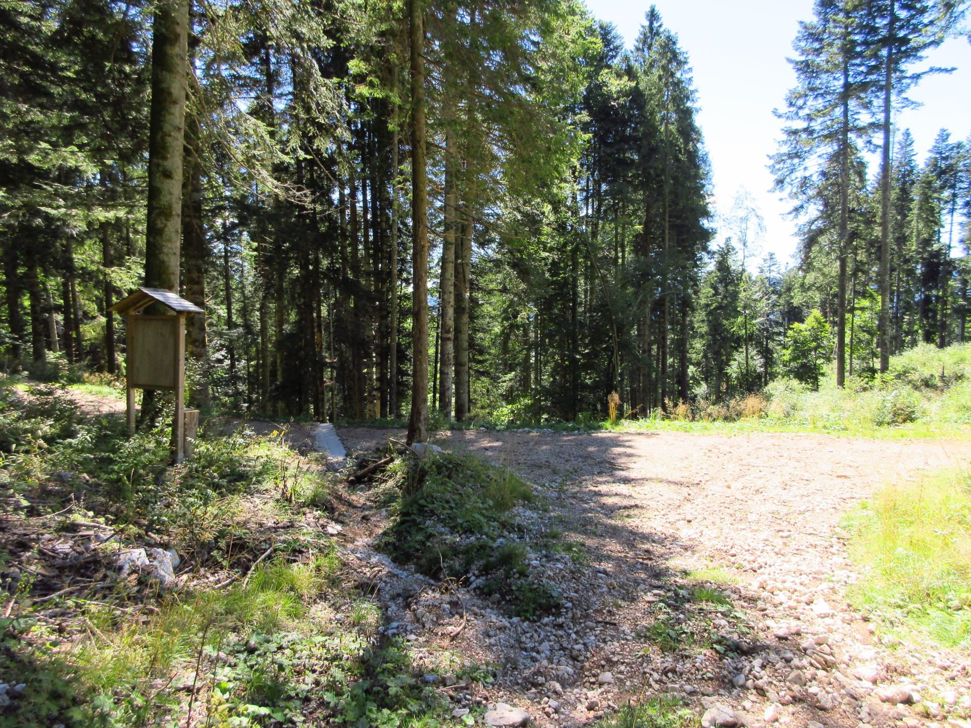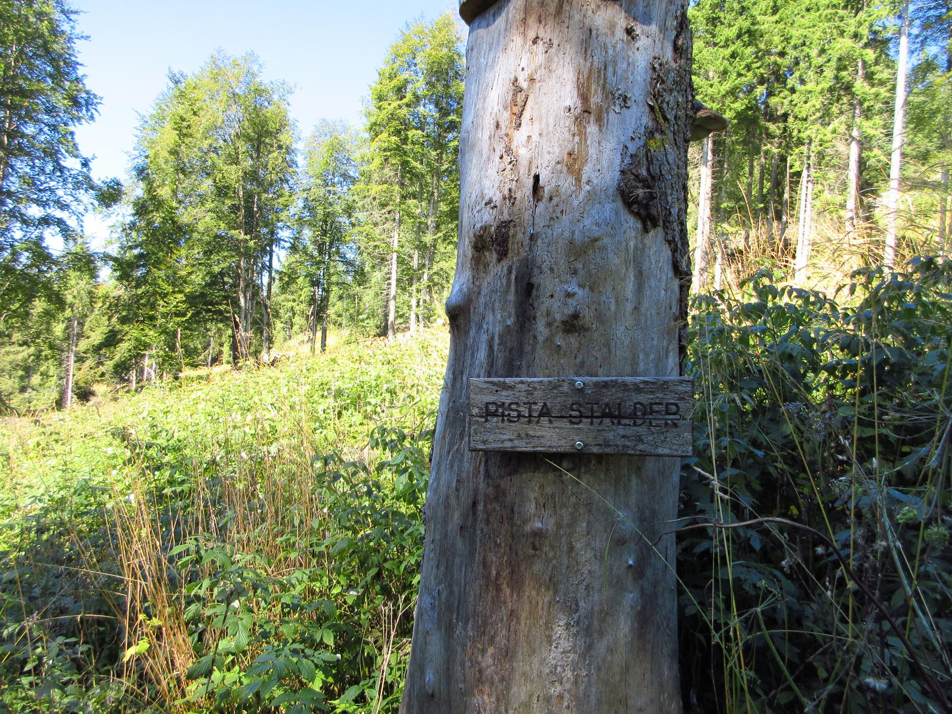 Si continua a scendere lungo la pista Stalder fino a incrociare una strada forestale, dove si svolta a sinistra in direzione est.