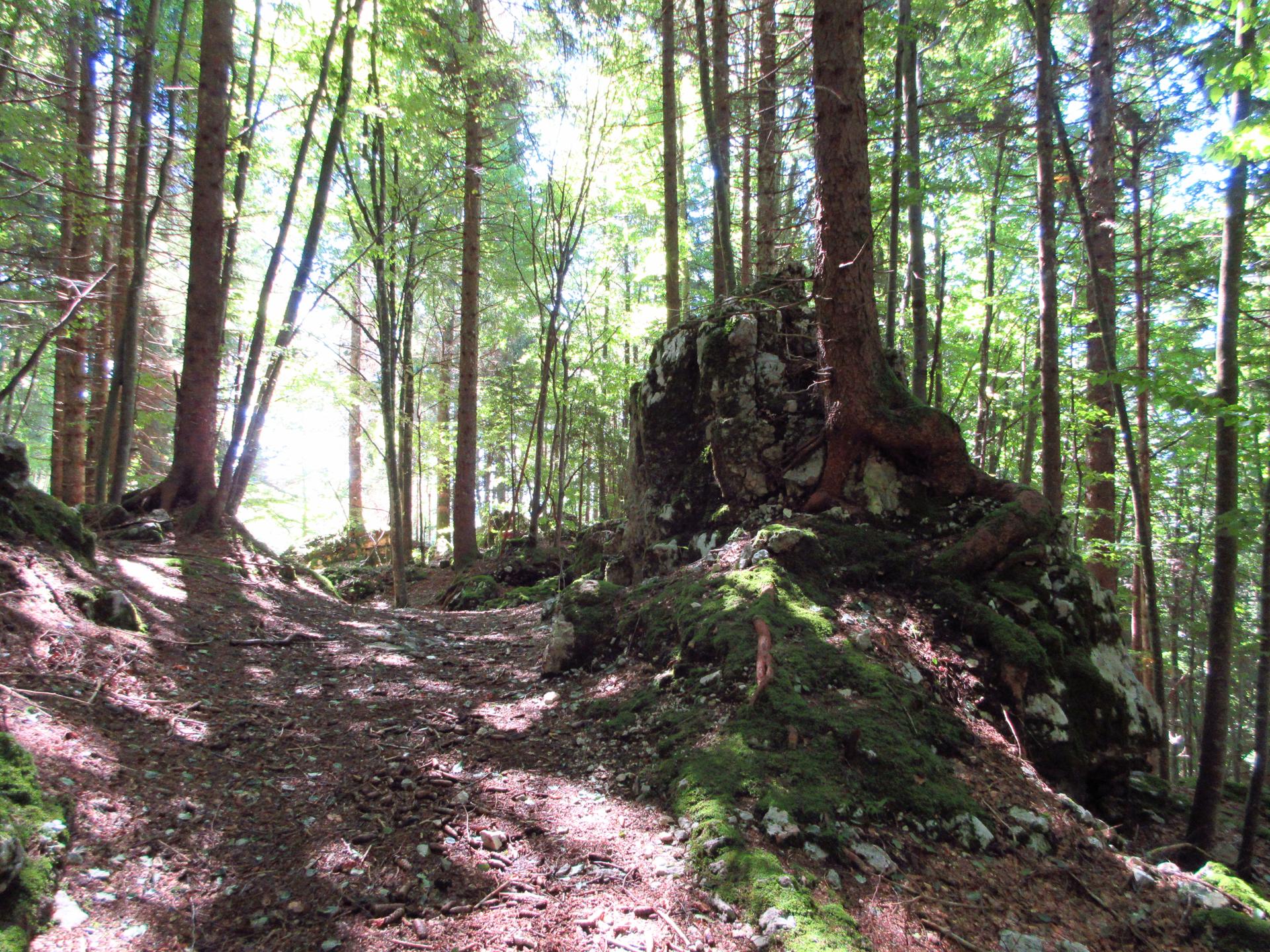 Il sentiero prosegue la sua salita nel bosco, dove si possono scorgere altre grotte e trincee.