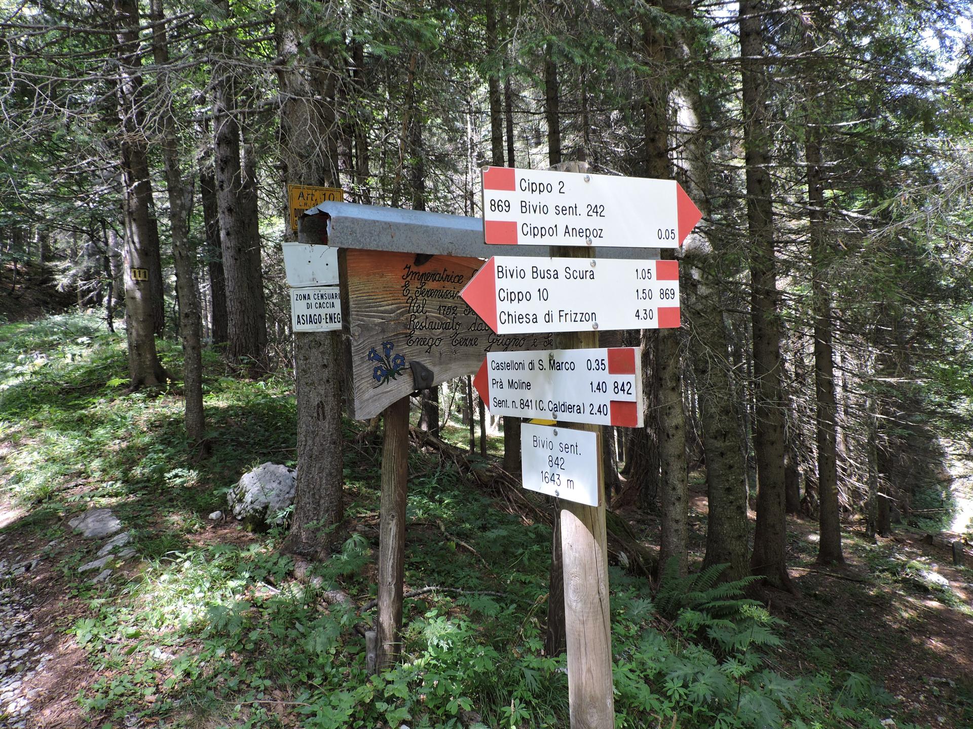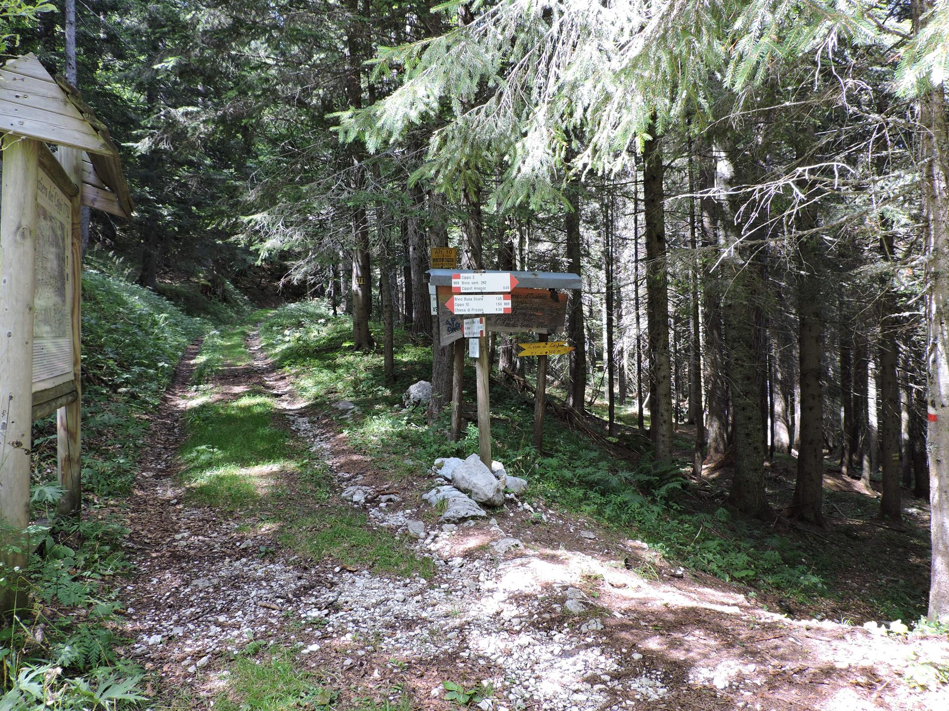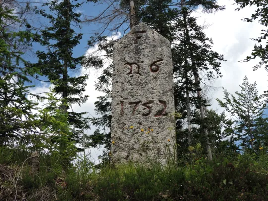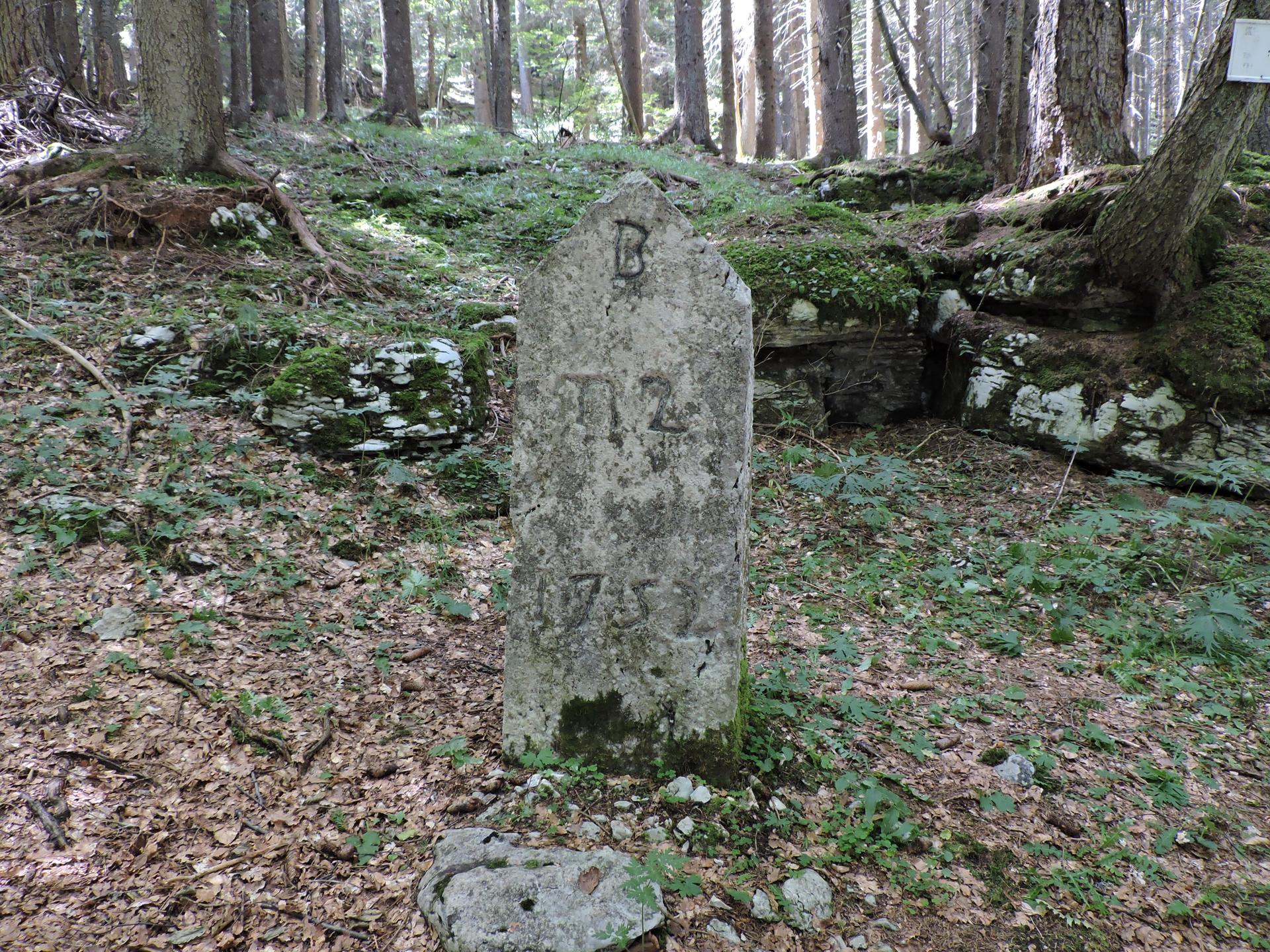 Torniamo lungo il sentiero di andata, ma all'incrocio proseguiamo verso il cippo nr.2. Da qui si raggiunge la strada principale con alcune tabelle che indicano il Sentiero dei Cippi 1752 e un po' di storia.