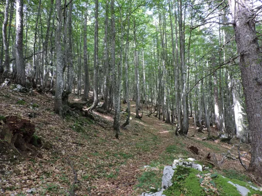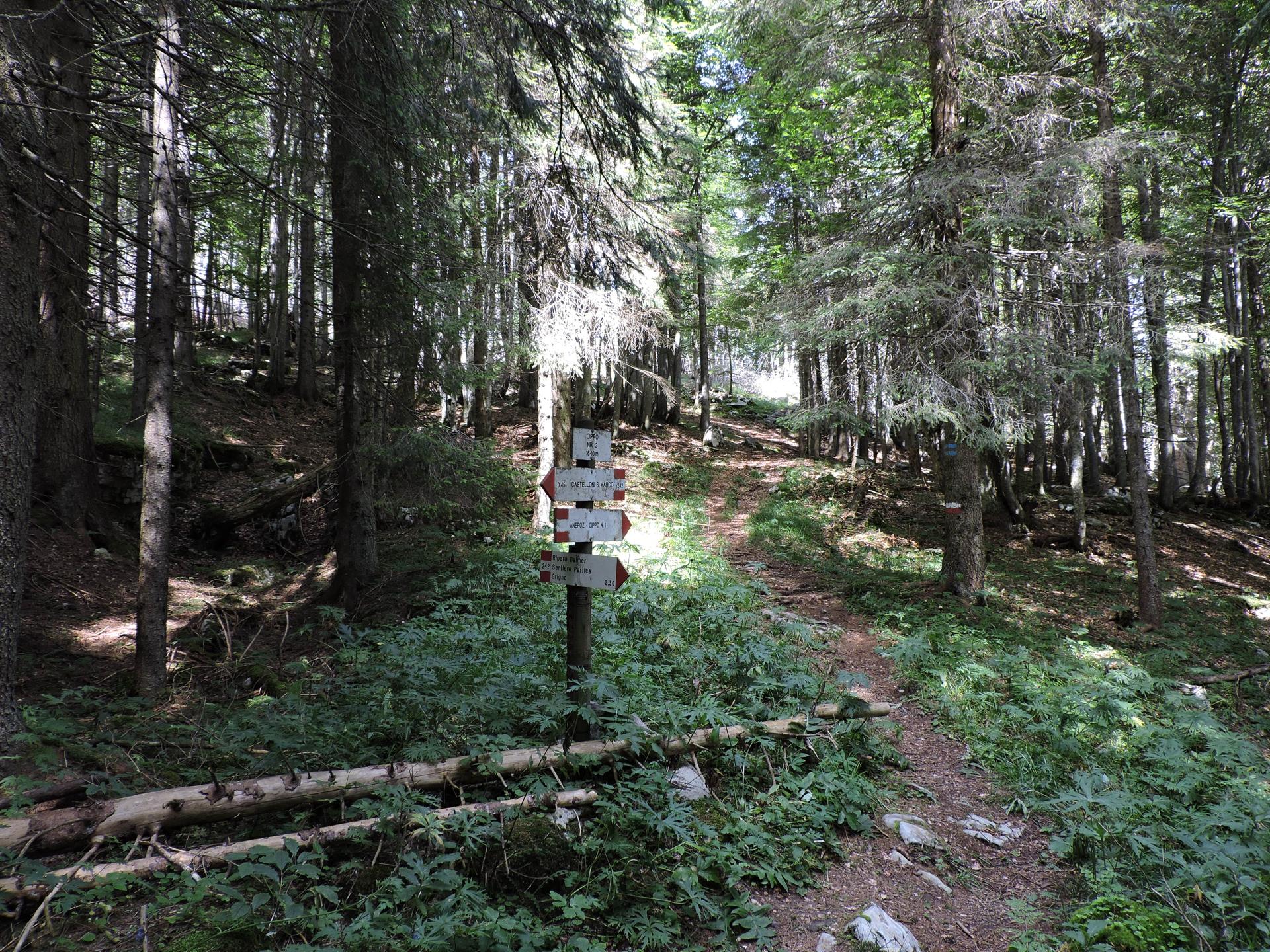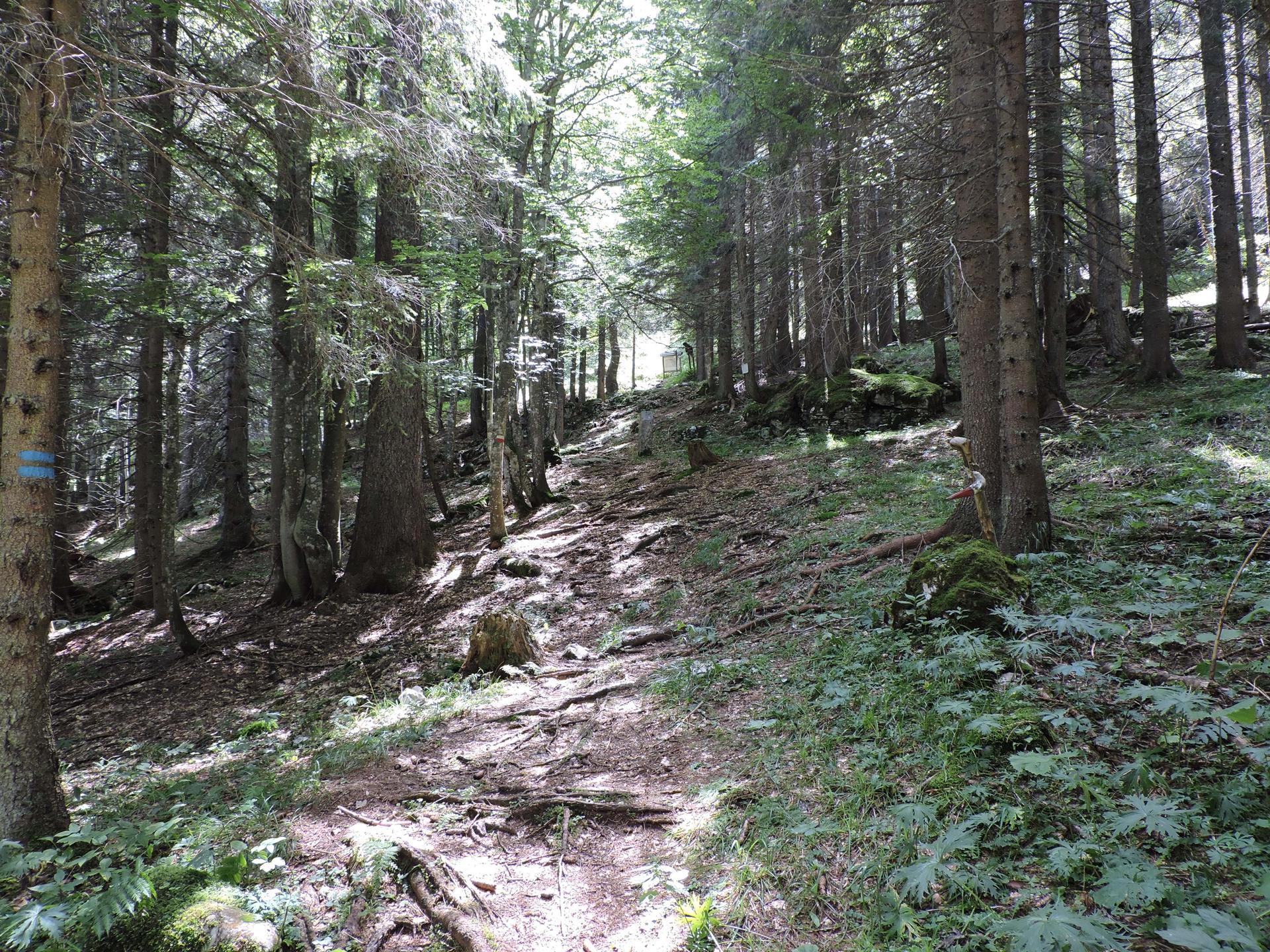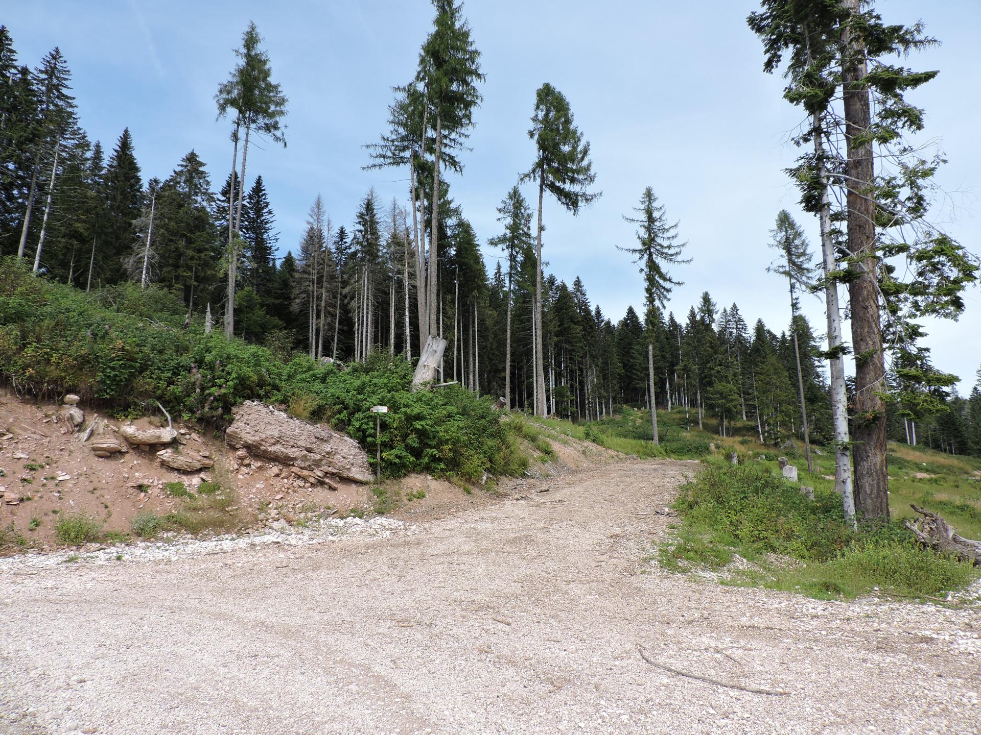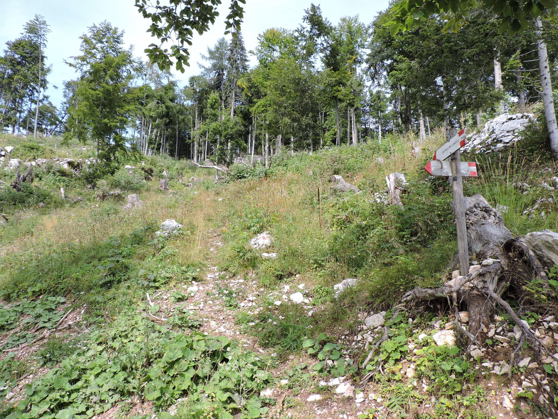 In questa strada la salita è più lieve. Raggiunta la fine della stessa, un nuovo cartello indica il sentiero da prendere. Bisogna prestare un po' di attenzione perché esce bruscamente a sinistra rispetto al percorso fatto da qualche macchina forestale taglialegna. Ci sono dei segnali su un sasso e poi su un sottile albero ... Se non si sbaglia strada il resto del sentiero è facilmente visibile e ben segnalato.