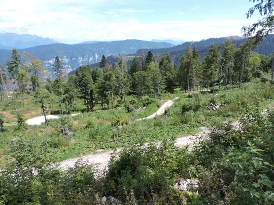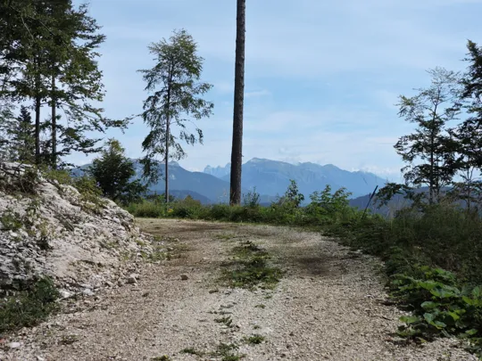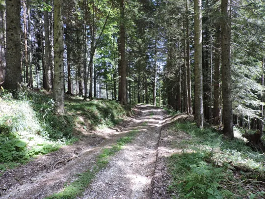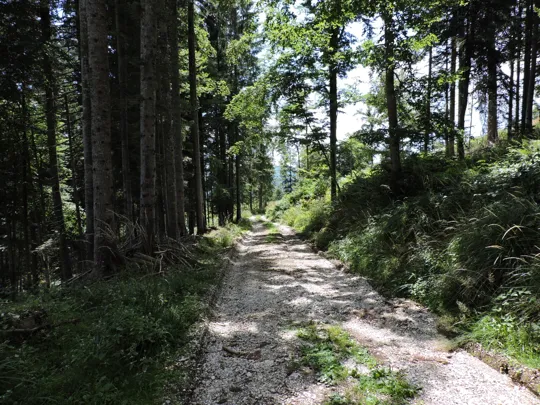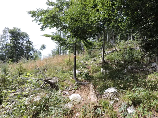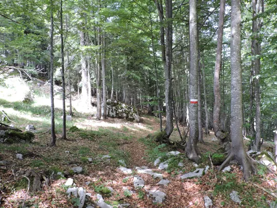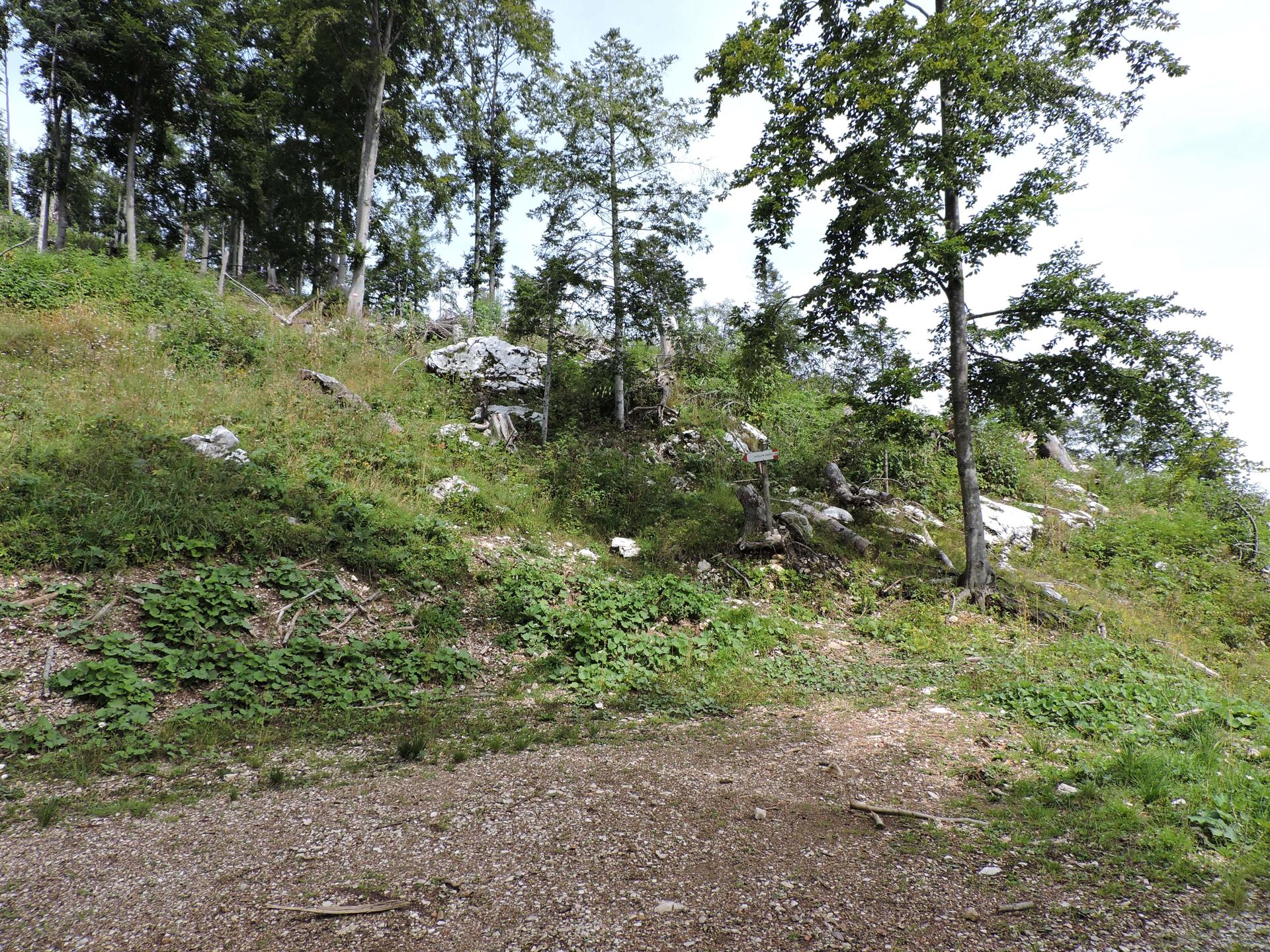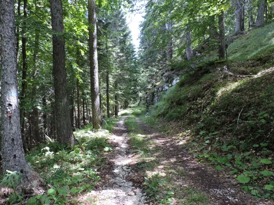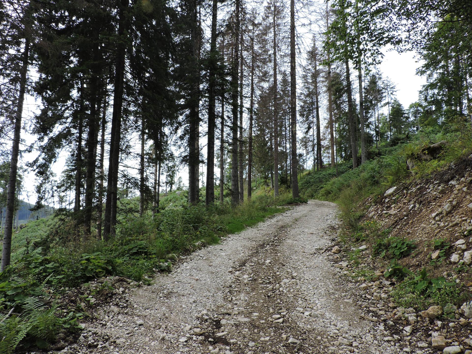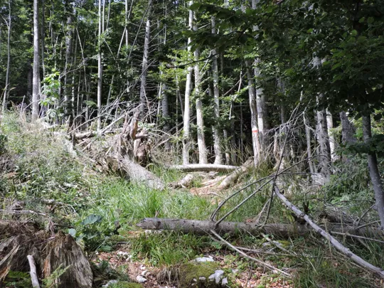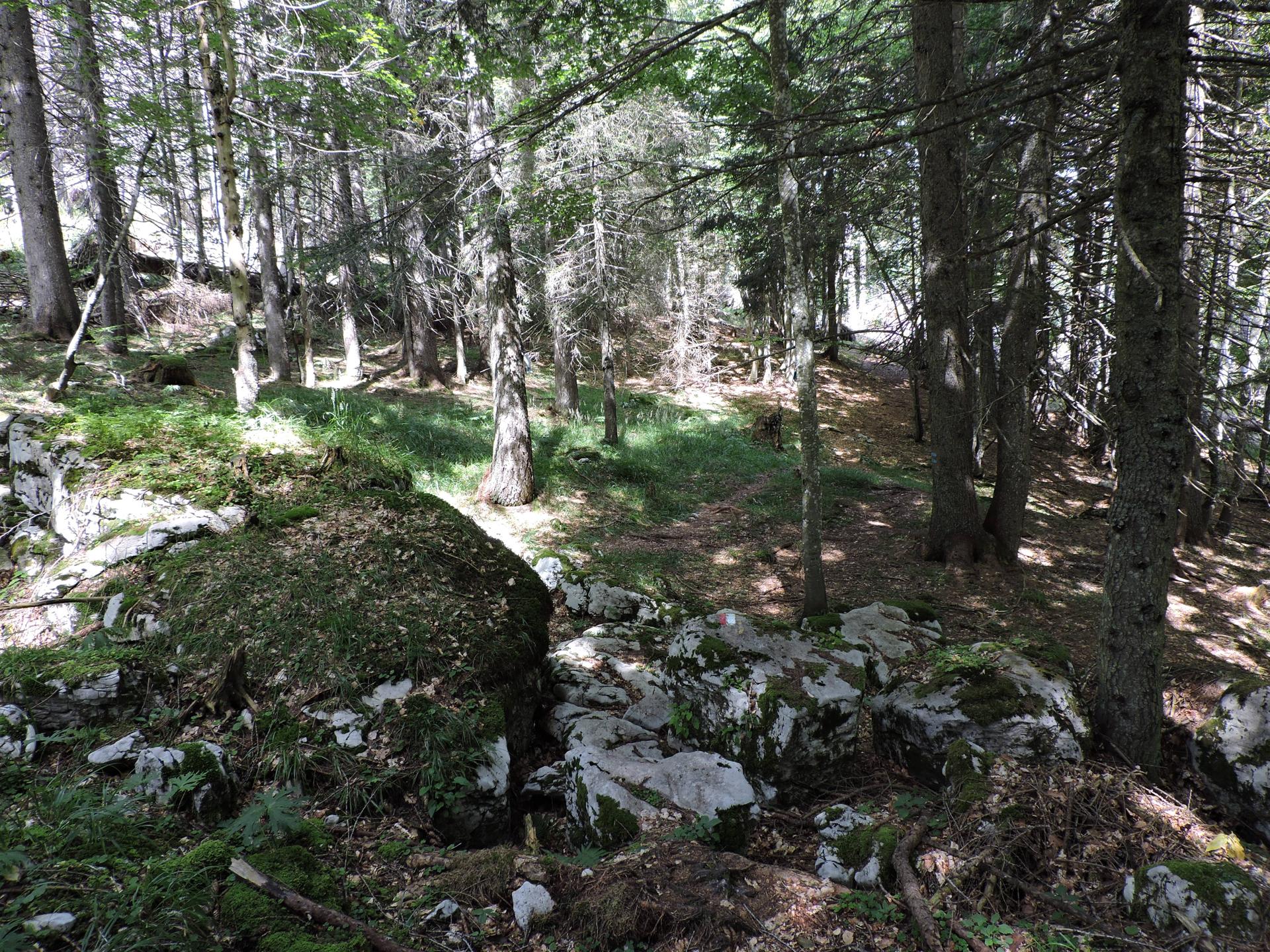 In questa strada la salita è più lieve. Raggiunta la fine della stessa, un nuovo cartello indica il sentiero da prendere. Bisogna prestare un po' di attenzione perché esce bruscamente a sinistra rispetto al percorso fatto da qualche macchina forestale taglialegna. Ci sono dei segnali su un sasso e poi su un sottile albero ... Se non si sbaglia strada il resto del sentiero è facilmente visibile e ben segnalato.
