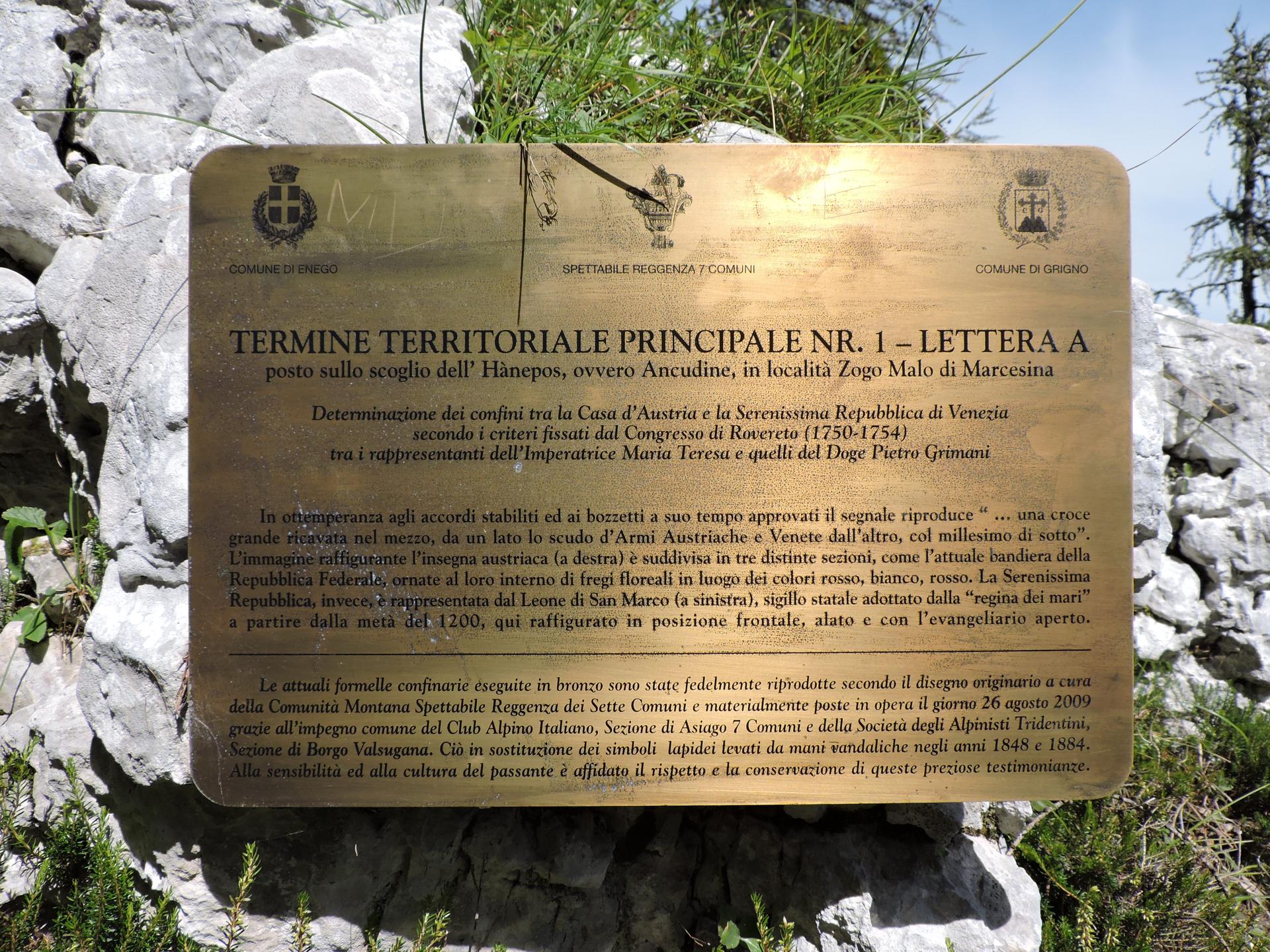 Nell'anno 1750, per volere dell'Imperatrice Maria Teresa d'Austria e del Doge della Serenissima Repubblica di Venezia Pietro Grimani, fu indetto un congresso internazionale a Rovereto per derimere la sanguinosa questione relativa alla linea confinaria tra i due Stati, compreso il territorio di Marcesina. Il 10 agosto 1751 i deputati congressisti di Vicenza e Grigno espressero le loro tesi e ragioni a sostegno e l'anno seguente furono messi in opera i cippi confinari oggi esistenti a conclusione di una controversia antica e dolorosa. Sulla sommità del Giogomalo il punto di confine fu segnato da un masso di circa due metri di lunghezza, a forma di incudine, chiamato per questo in cimbro "Anepoz" (è l'estremo nord del percorso) sul quale furono collocate due formelle in pietra, purtroppo andate perdute, con raffigurate le effigi del "Leone di San Marco" e lo "Scudo di Maria Teresa d'Austria"; sono rimasti solo due incavi rettangolari. Nei pressi del cippo n° 5, verso la fine dell'Ottocento, venne eretto un piccolo edificio adibito a Casermetta della Finanza per presidiare l'entrata dell'Altopiano e combattere il contrabbando ma alla fine della Prima Guerra mondiale il manufatto venne abbandonato ed ora rimangono poche resti della struttura verticale in pietra locale.