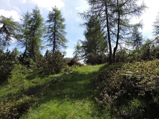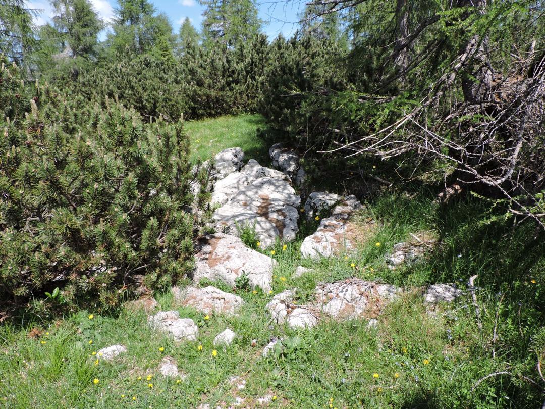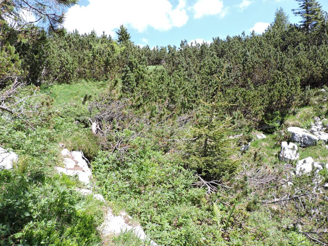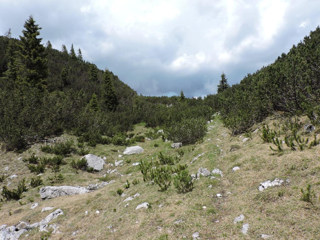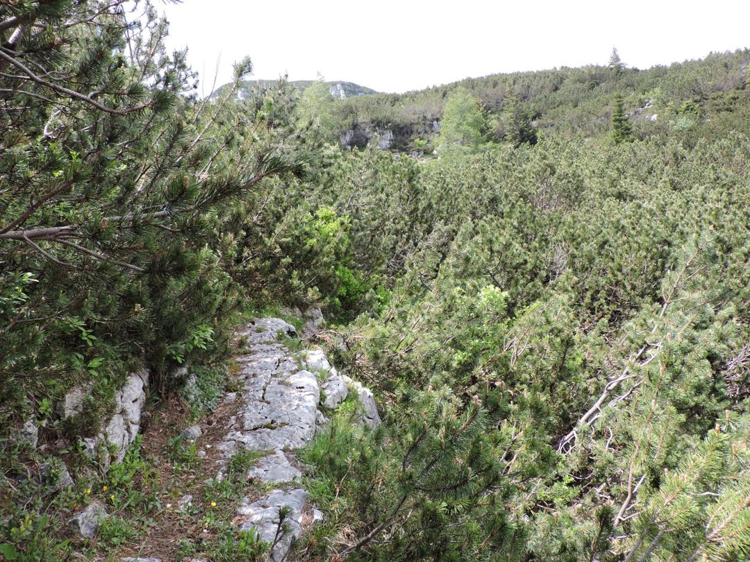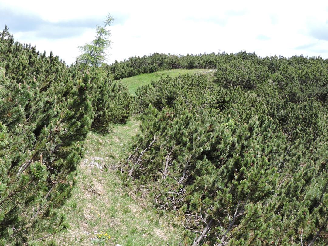 Oltrepassate le erbose pendici dello Zoviello (trovando a fatica le tracce) le cose iniziano ad essere più complicate. I pini mughi coprono quasi interamente la zona e il sentiero all'interno degli stessi a volte è sbarrato da diversi rami.