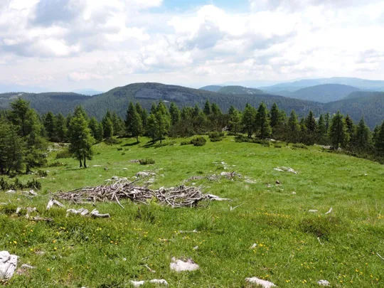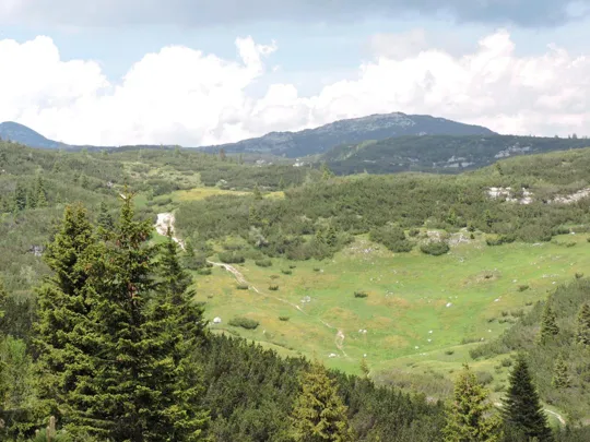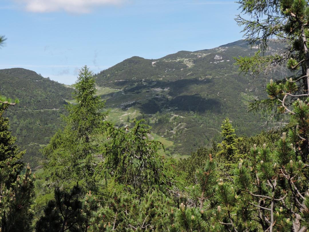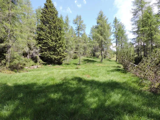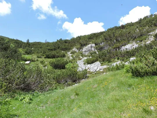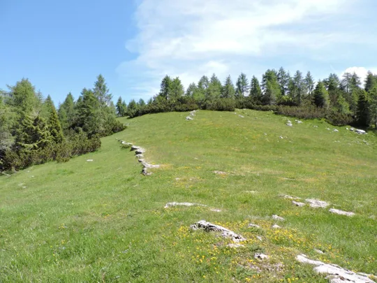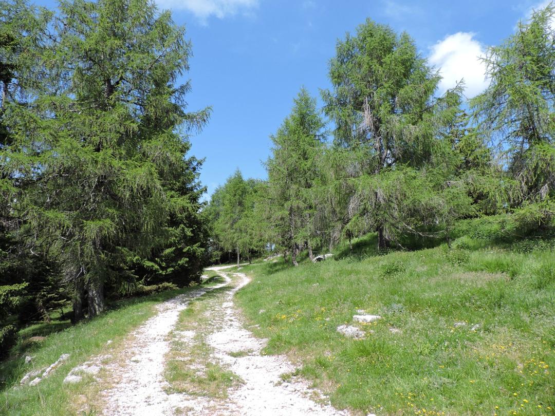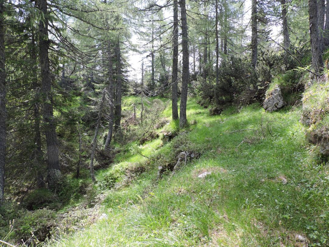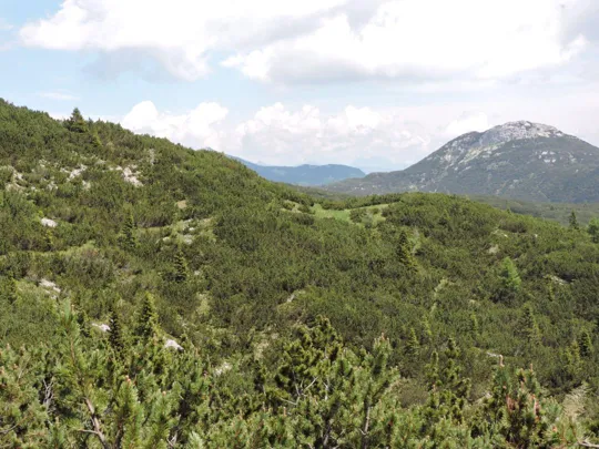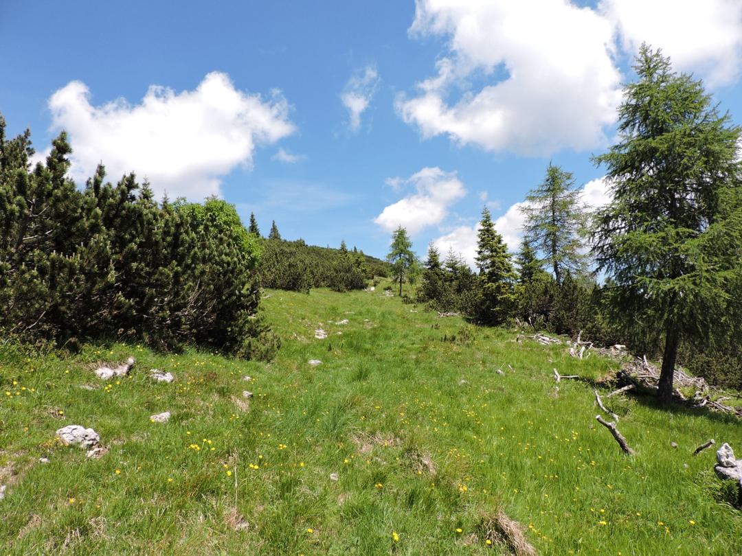 Oltrepassate le erbose pendici dello Zoviello (trovando a fatica le tracce) le cose iniziano ad essere più complicate. I pini mughi coprono quasi interamente la zona e il sentiero all'interno degli stessi a volte è sbarrato da diversi rami.