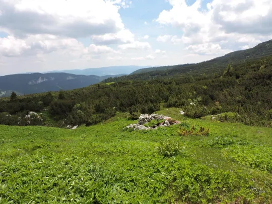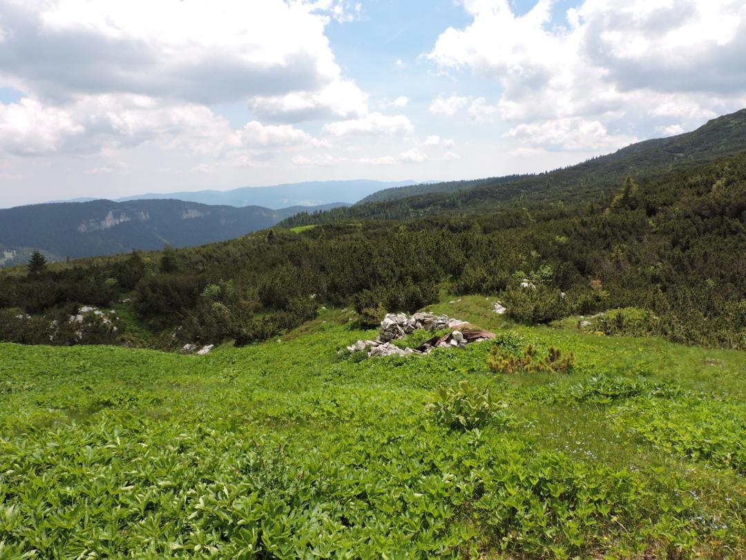Per fortuna non tutti i passaggi tra i mughi erano così complicati. Diciamo che arrivati sopra un cucuzzolo con una radura e un rudere le cose sono migliorate un po'.