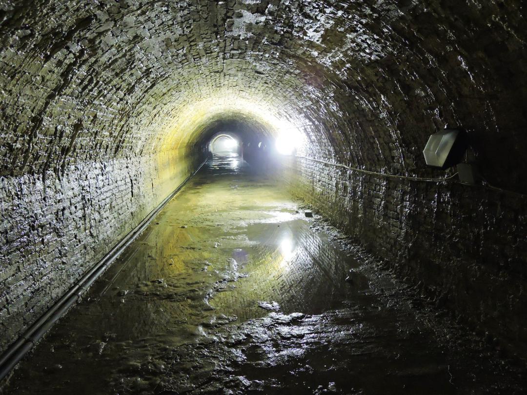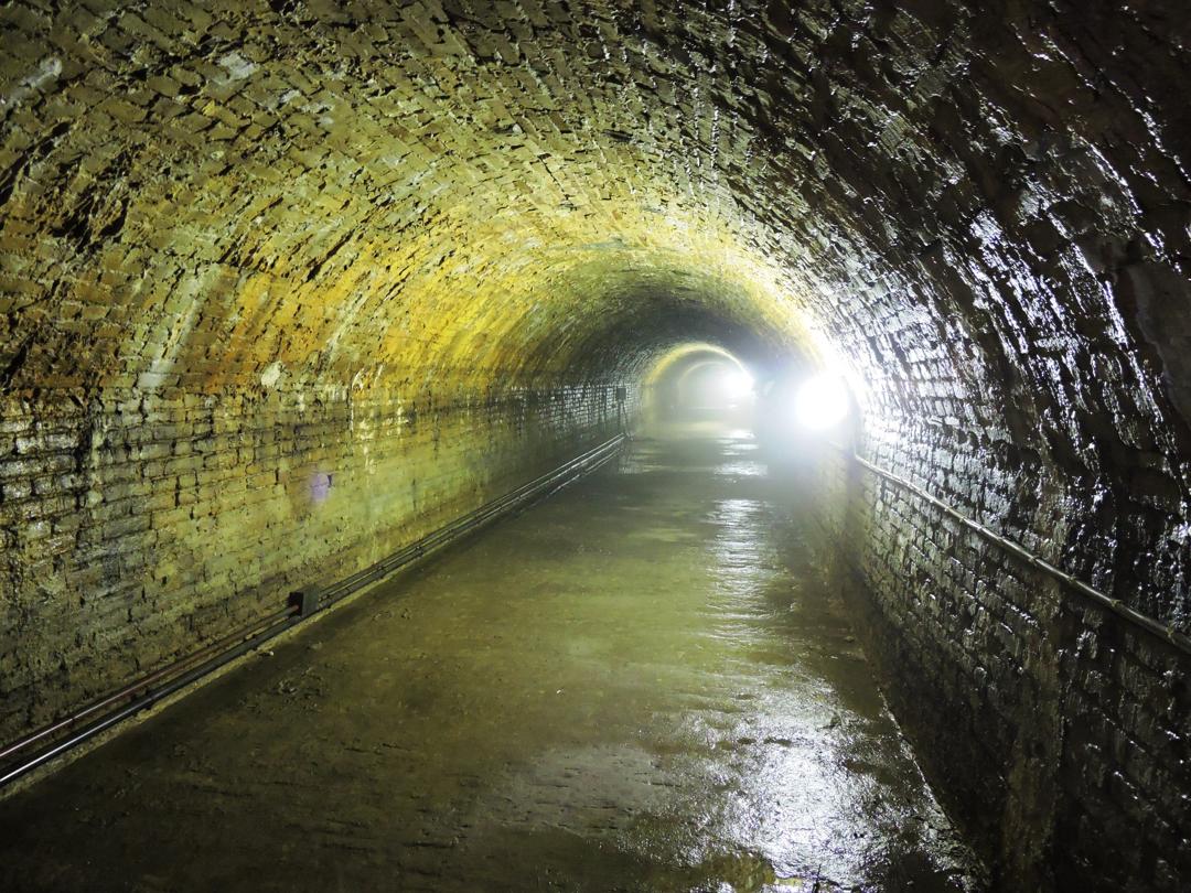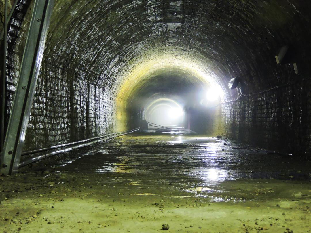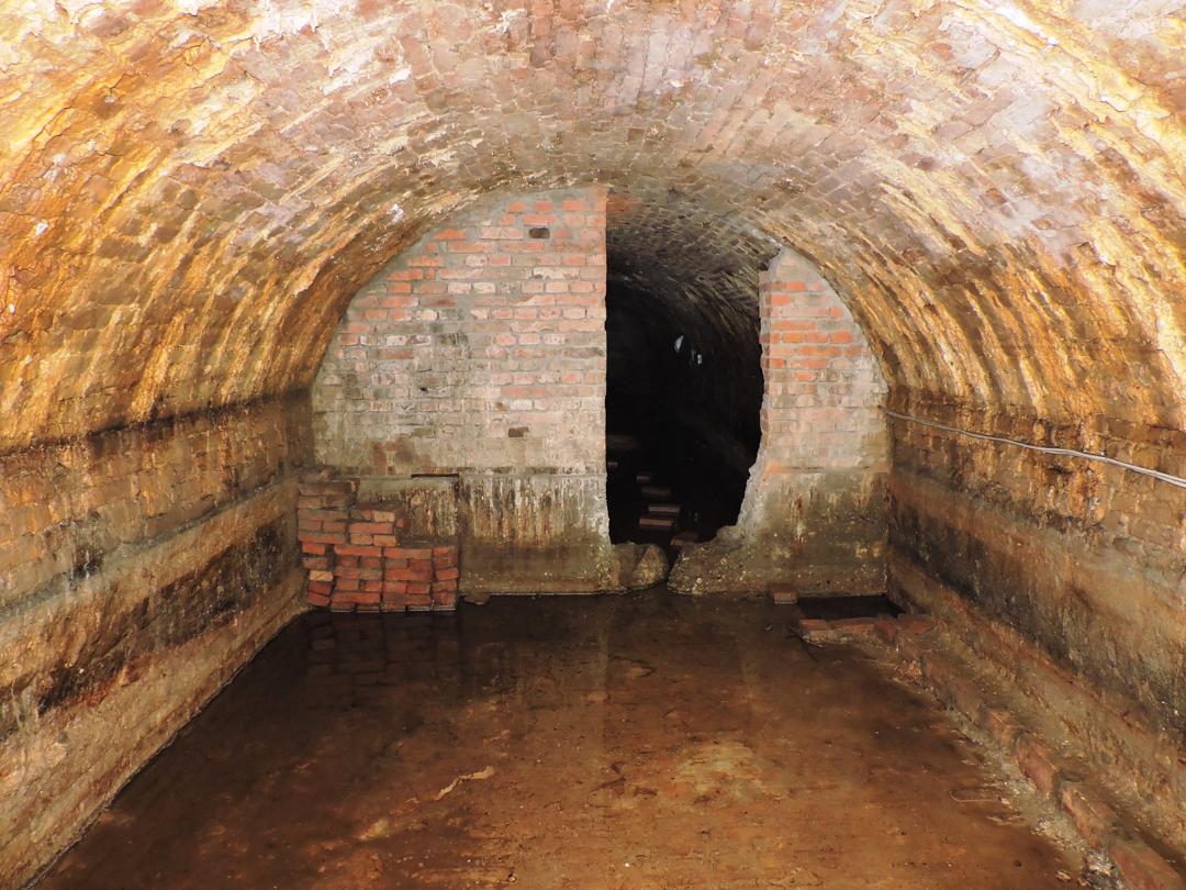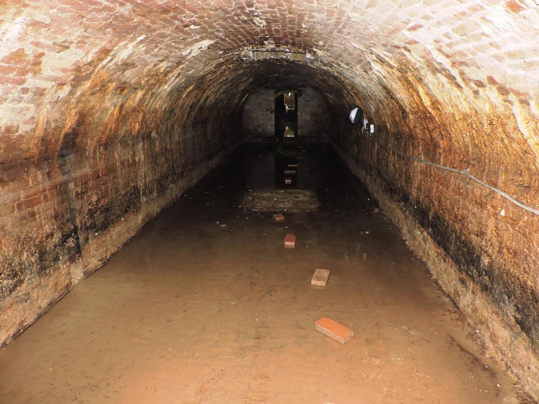 Verso la fine della galleria l'acqua nasconde il pavimento. Qualcuno ha tentato di creare un passaggio con dei mattoni ... ma altri si sono tolti le scarpe ...