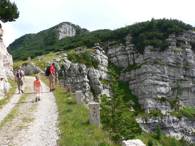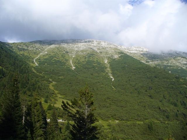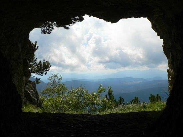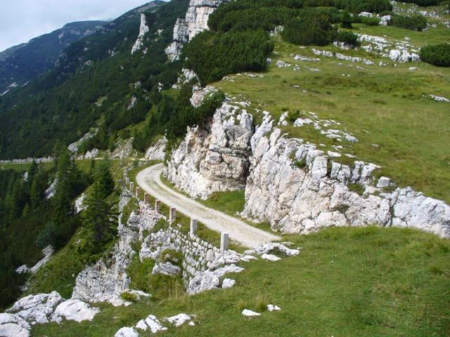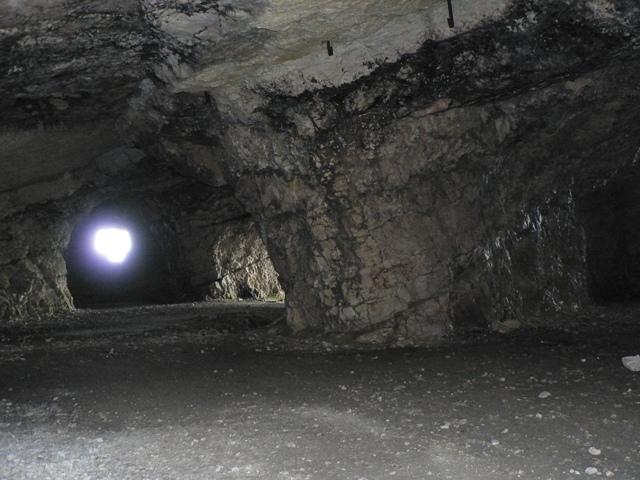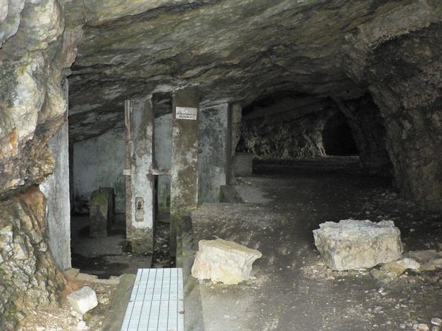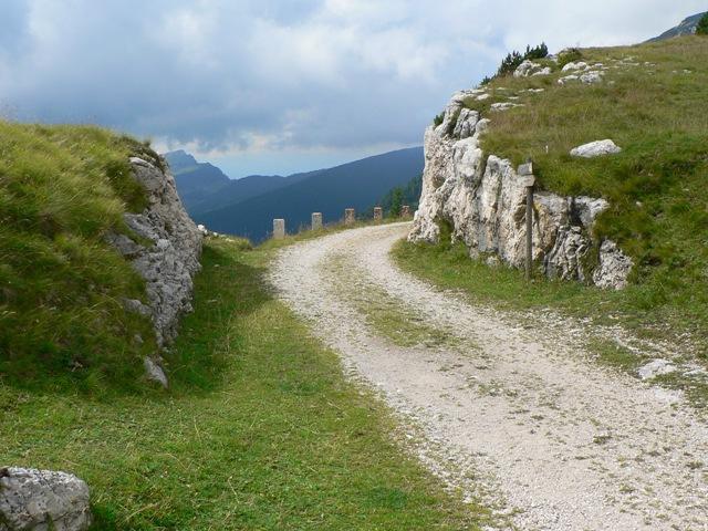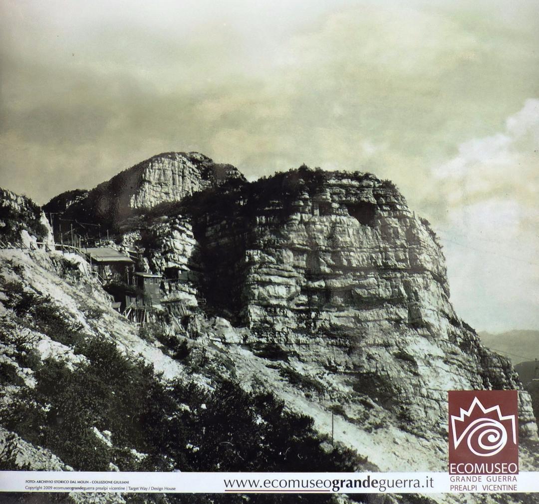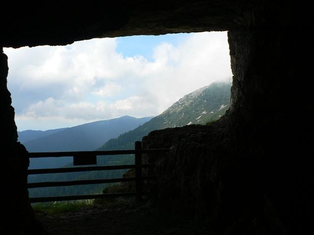 Eccoci nei pressi della bocchetta, si intravedono scavate nella montagna due enormi feritoie, usate prima dagli italiani come postazioni per cannoni poi dagli austriaci come passaggio coperto per una teleferica.