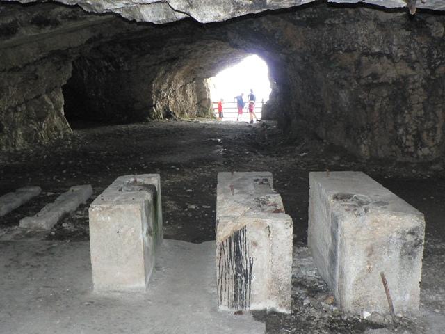 L'interno della galleria è sufficientemente illuminato e non è necessario usare la torcia elettrica (qualcuno del gruppo, però, ispezionando gli angoli bui ha trovato 2 euro). Alcuni dettagli del punto di partenza della teleferica, con i blocchi di fissaggio per i motori.