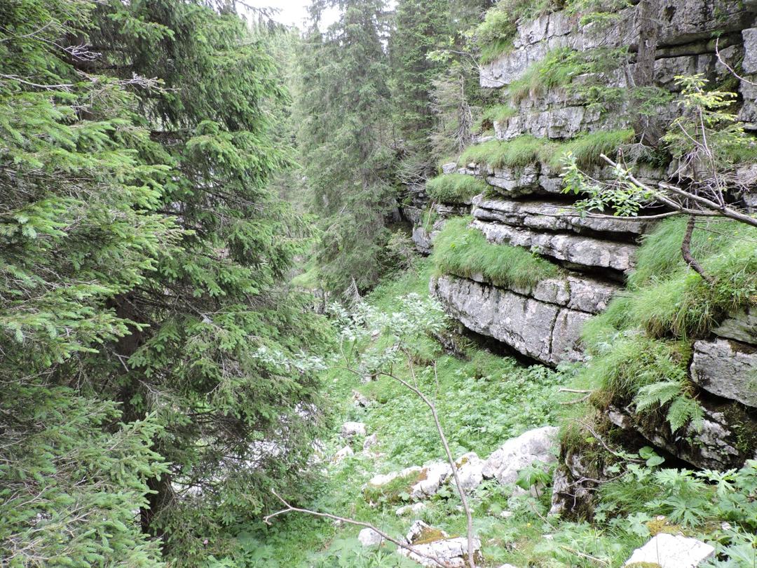 La voragine è nascosta dalla vegetazione, ma si può notare una recinzione con filo spinato per evitare che le mucche al pascolo ci finiscano dentro.
