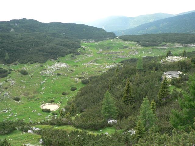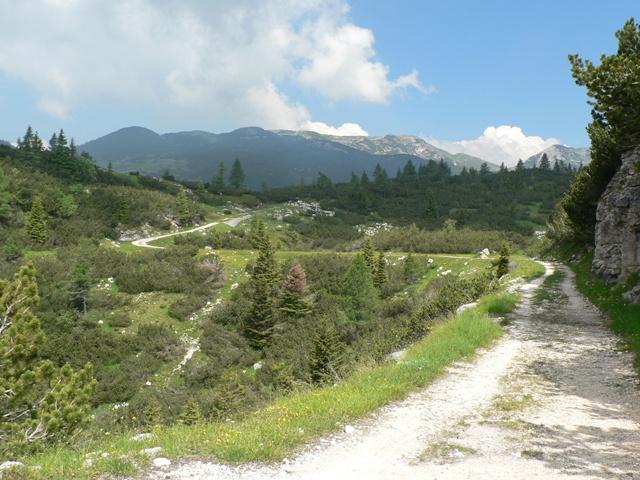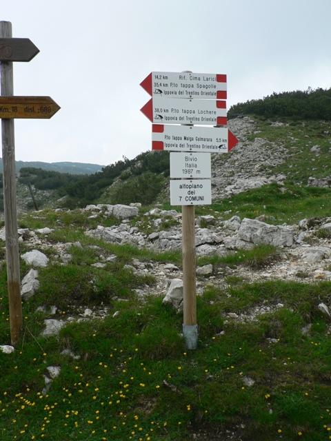Dal Bivio Italia si può decidere se scendere lungo la strada o proseguire per il sentiero 830 che passa vicino al baito. Ci siamo divisi ed è risultata più veloce la discesa lungo la strada. Il sentiero a volte è un po' difficoltoso sempre in mezzo ai mughi e poco panoramico.