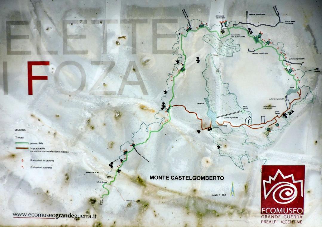 All'interno del complesso sistema difensivo delle Melette, il Monte Castelgomberto costituiva il perno principale del fronte settentrionale come attestano ancor oggi le profonde trincee scavate nella roccia ed i numerosi appostamenti per mitragliatrici in caverna.