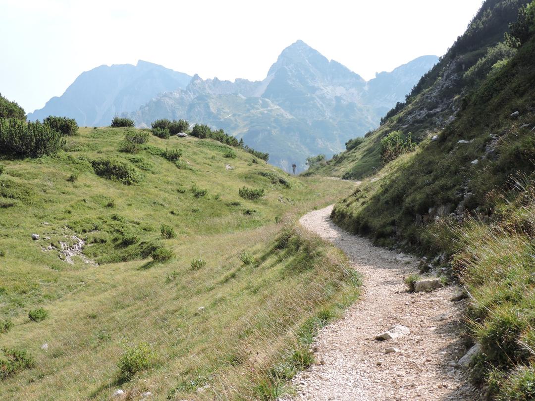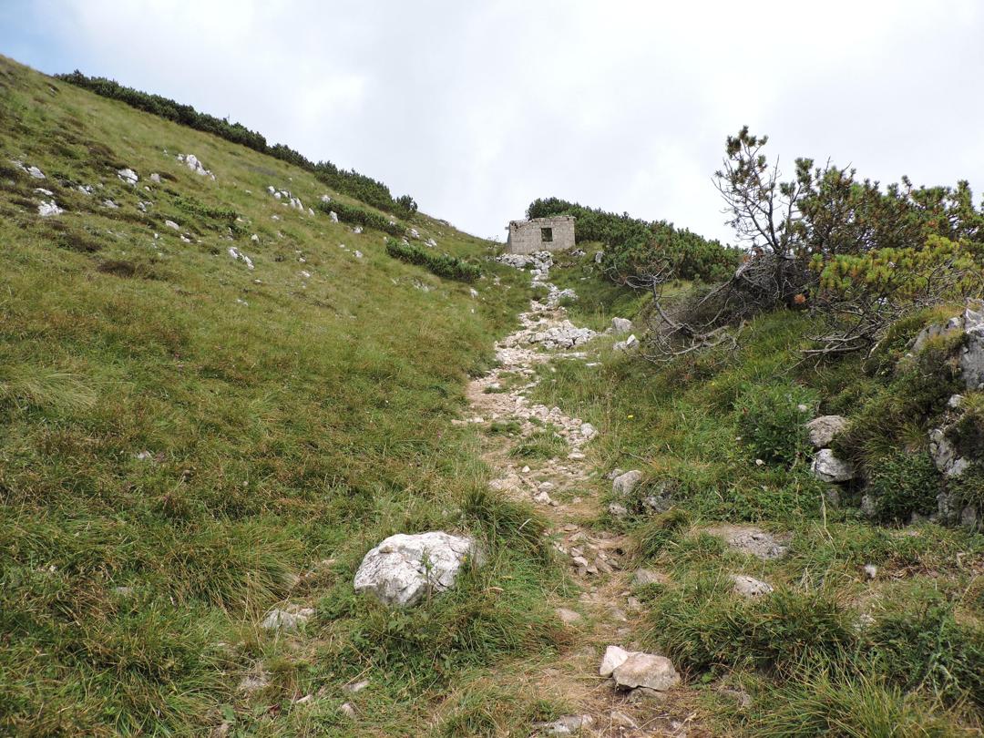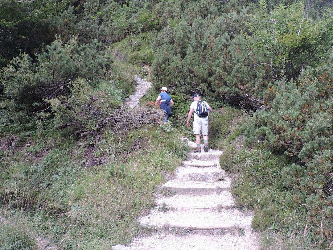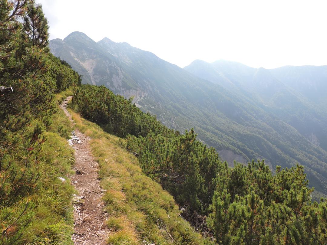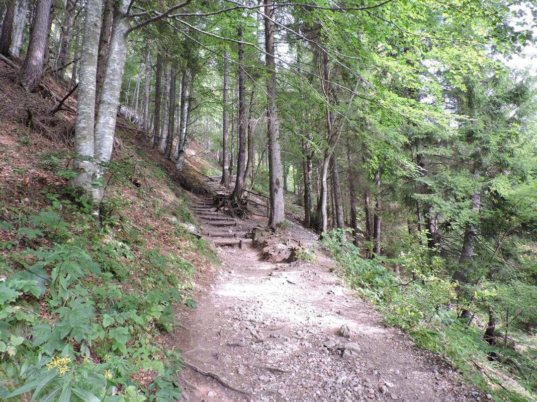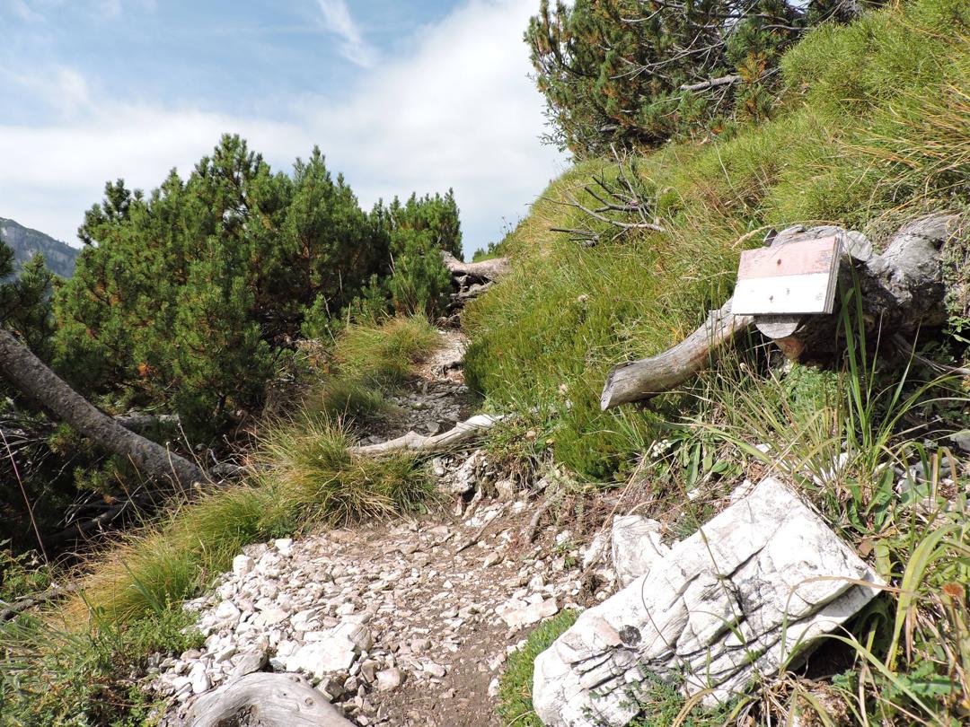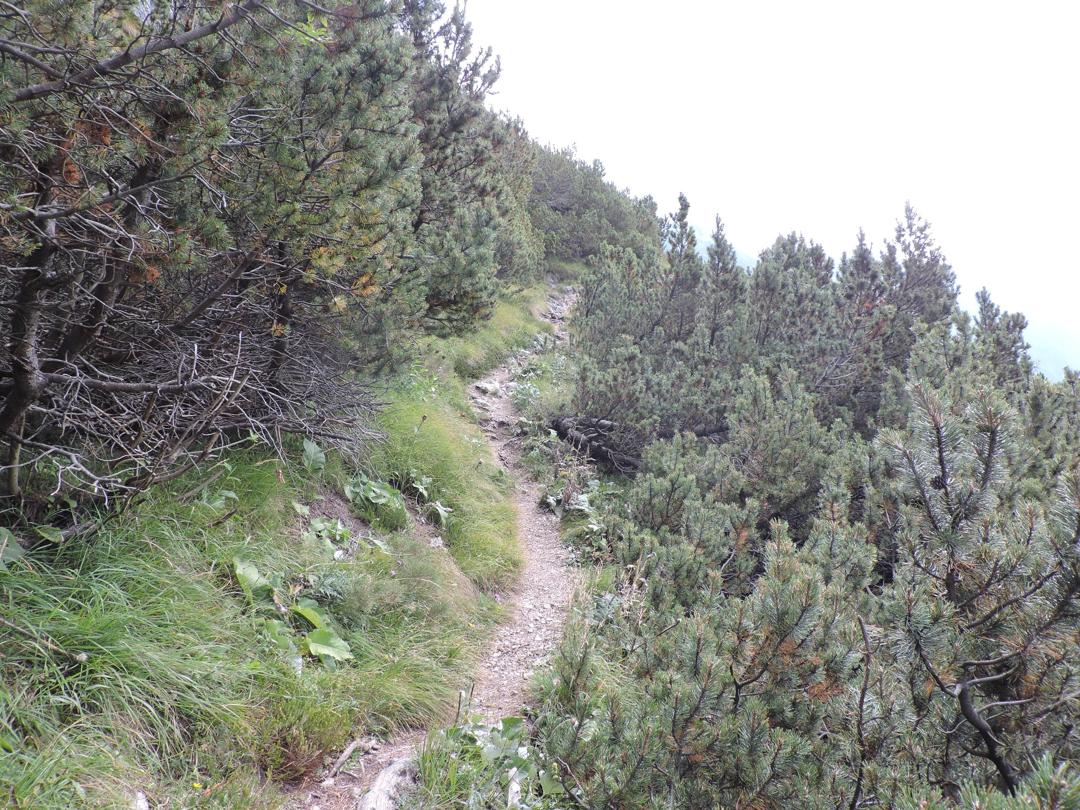 Il sentiero sale lentamente con alcuni punti in cui è necessario scavalcare diverse radici di pini mughi, ma poi inizia una salita repentina e faticosa.