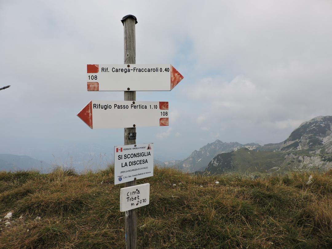 Da passo Pertica abbiamo seguito la strada verso Bocchetta Mosca (sentiero 109). Dopo il secondo tornante (vanno fatti tutti e due, non prendere scorciatoie), dopo circa un centinaio di metri si trova l'indicazione per il sentiero 108. Dal passo Pertica al bivio ci vogliono circa 15 minuti (35 minuti dall'inizio del percorso).