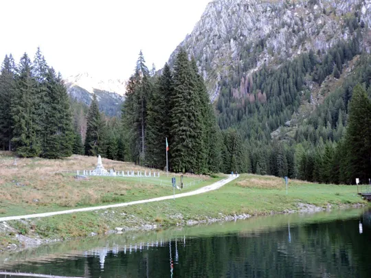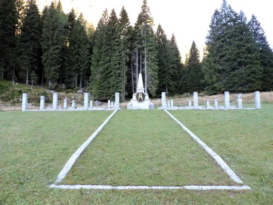 Nel 1916 il battaglione Val Brenta del 6° Reggimento Alpini fece realizzare per i propri caduti anche il piccolo Cimitero nei pressi della malga. Anteriormente ad un obelisco-monumento furono collocati 39 cippi in granito allineati su tre file ma le sepolture furono probabilmente 35.