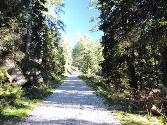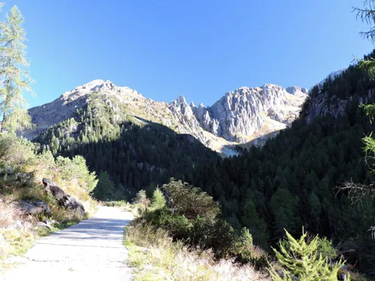 Il percorso inizia dall'ampio parcheggio nei pressi di malga Sorgazza e prosegue lungo una strada costantemente in salita costituita a tratti tra fondo naturale e cemento. Oltre al bacino idrico all'inizio del sentiero si vede il cimitero militare del battaglione Val Brenta che si raggiunge in pochi minuti, testimone che la Grande Guerra ha lasciato anche qui le sue tracce, tracce che però nel nostro percorso non incontreremo.