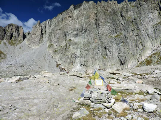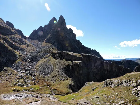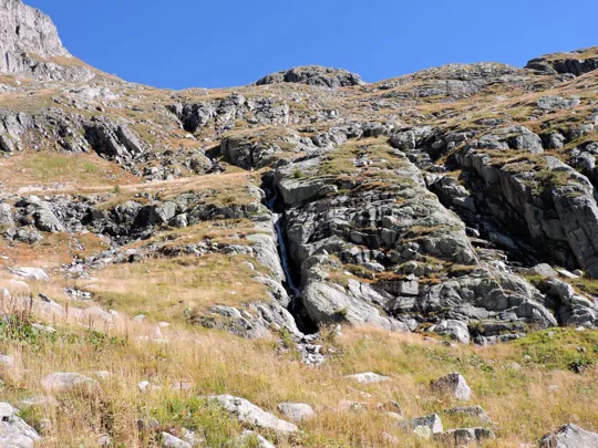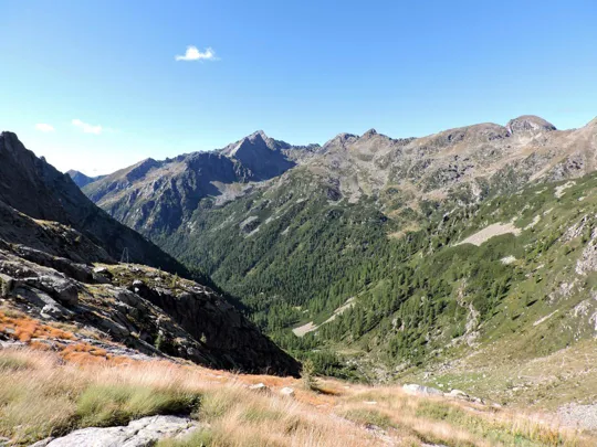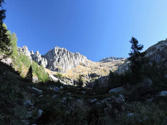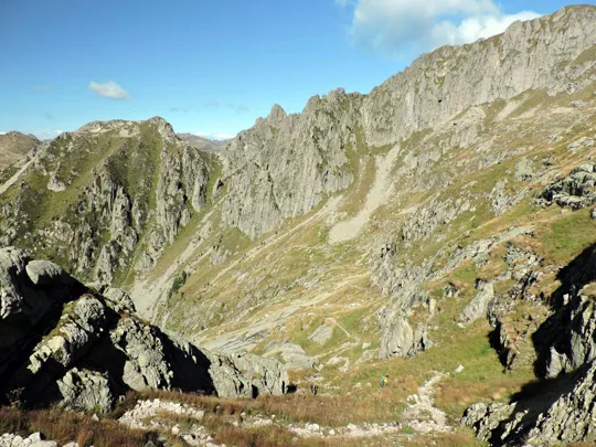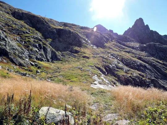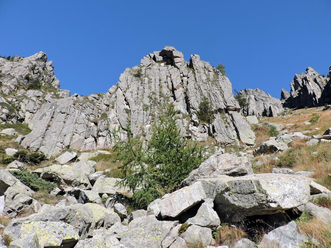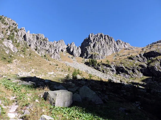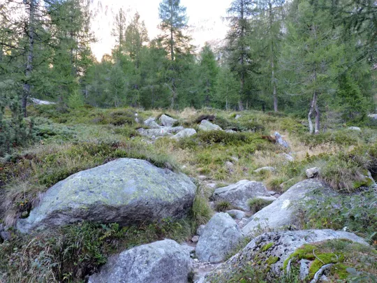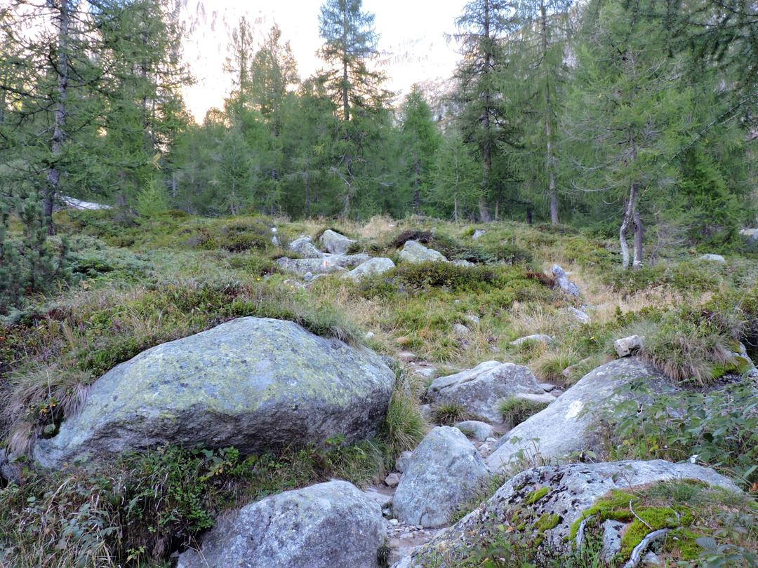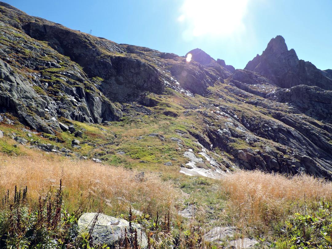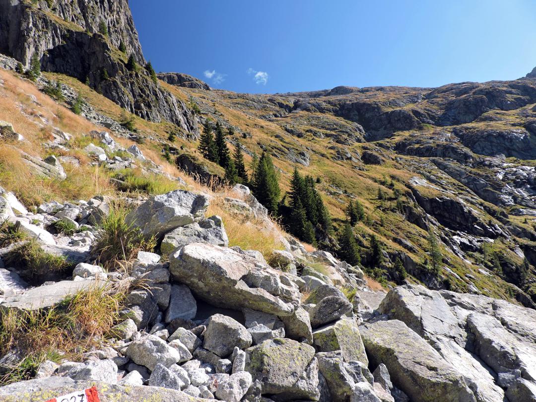 Ancora una salita impegnativa e ci troviamo di fronte una particolare valletta. Da qui un tornantone ci dirige dritti a nord fino a raggiungere l'incrocio con il termine del sentiero per esperti 327B, e dove le tabelle indicano 20 minuti al raggiungimento del lago.