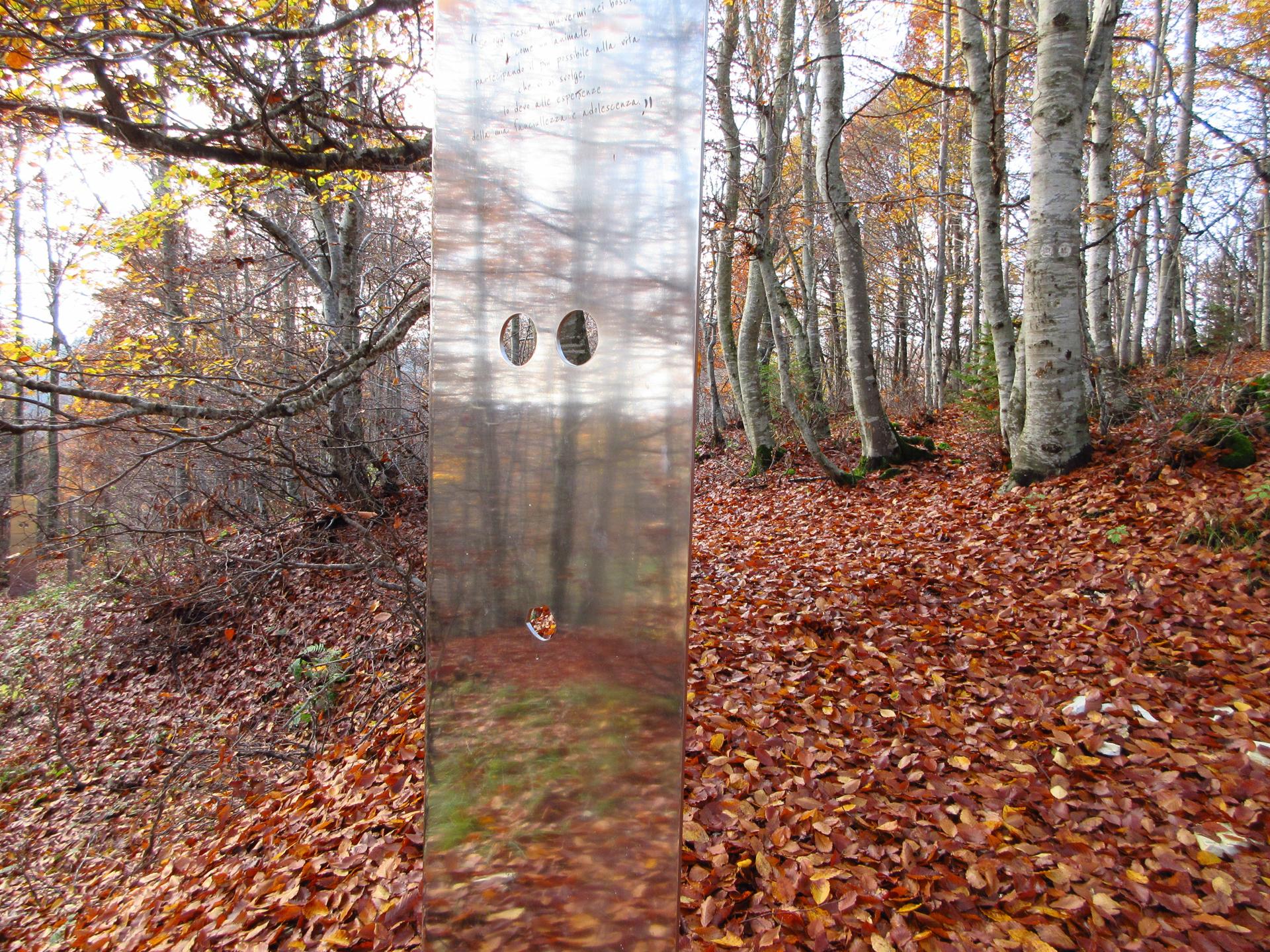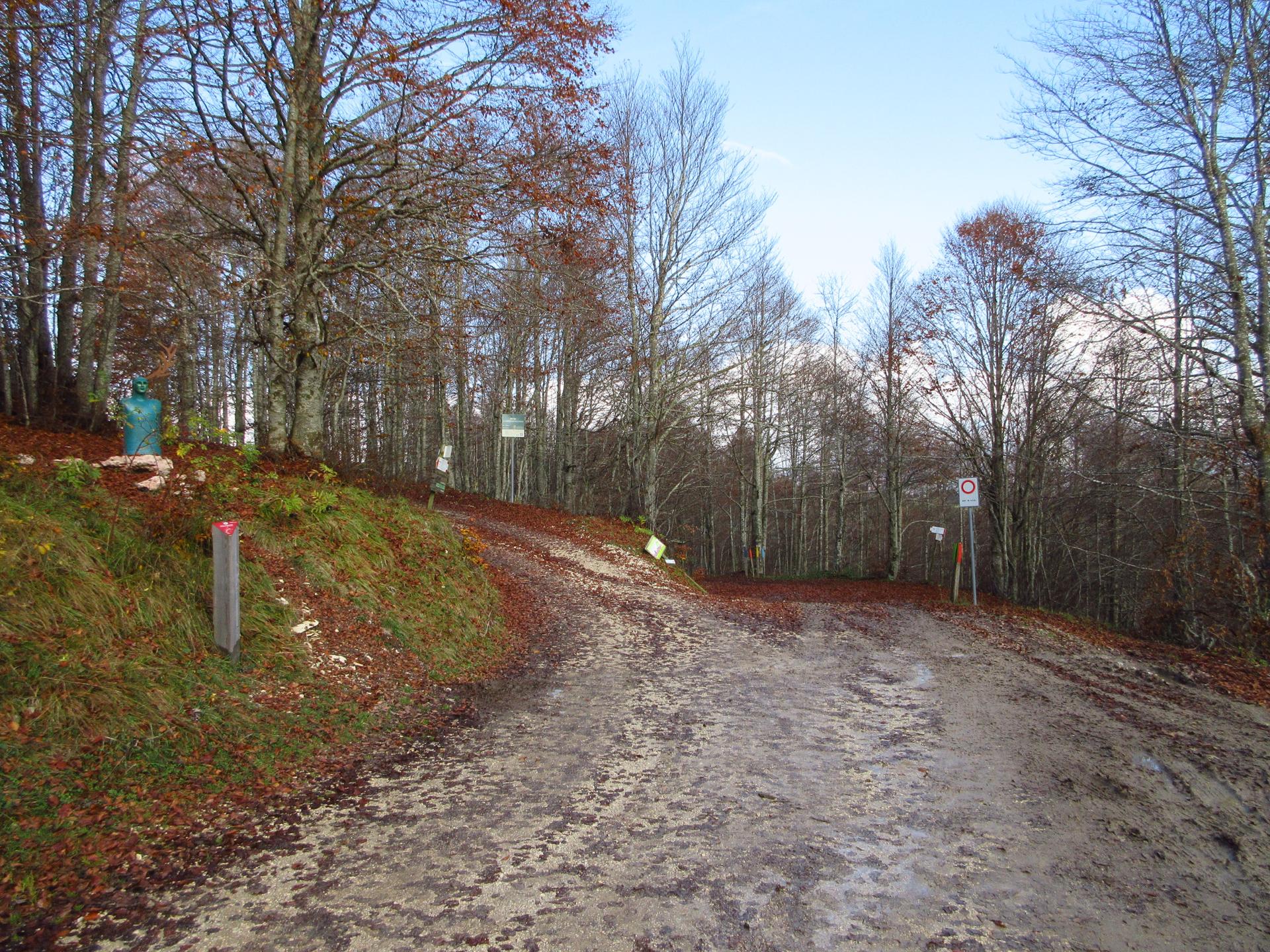Dopo 400 metri di strada asfaltata si arriva ad un incrocio nei pressi dell'osservatorio. Proseguiamo a destra inoltrandoci nel Sentiero del Maestro Patrizio (nel link la descrizione e le opere presenti lungo il percorso).
